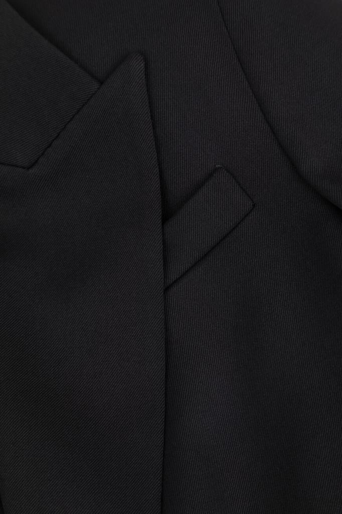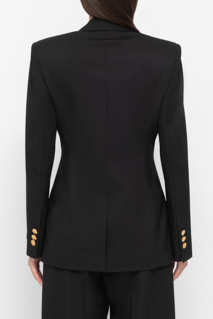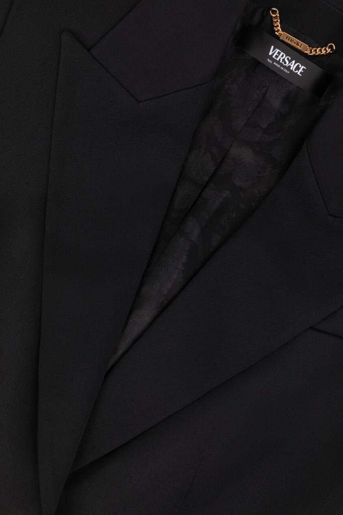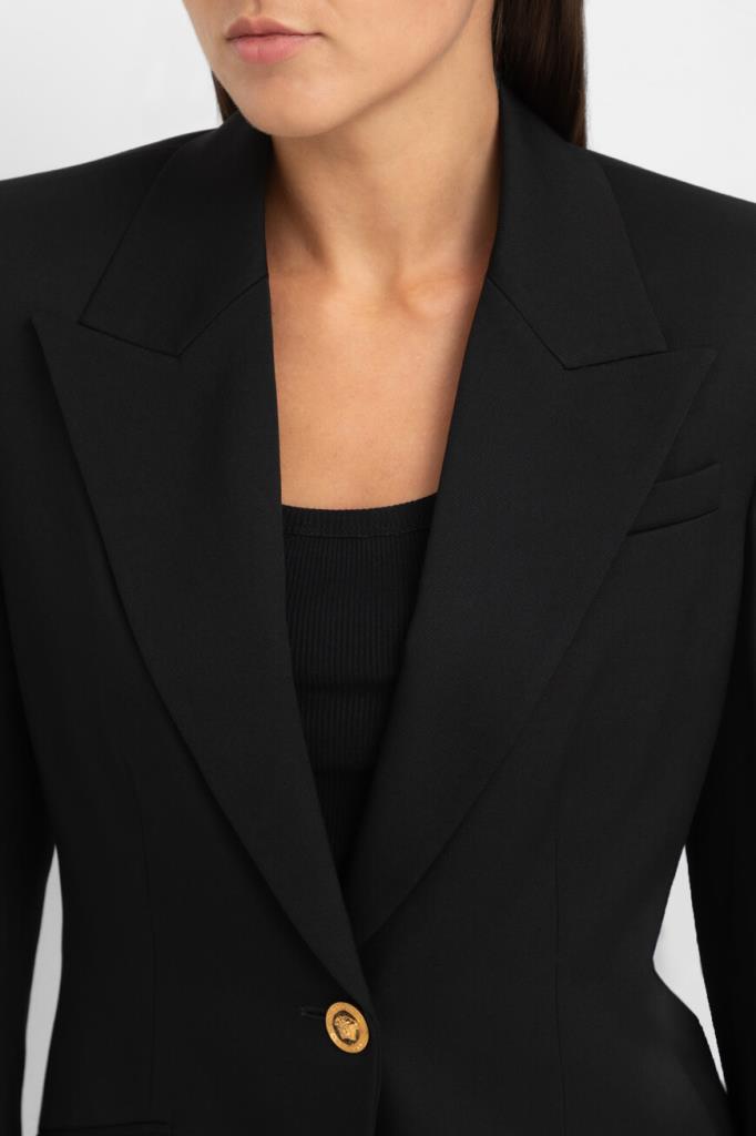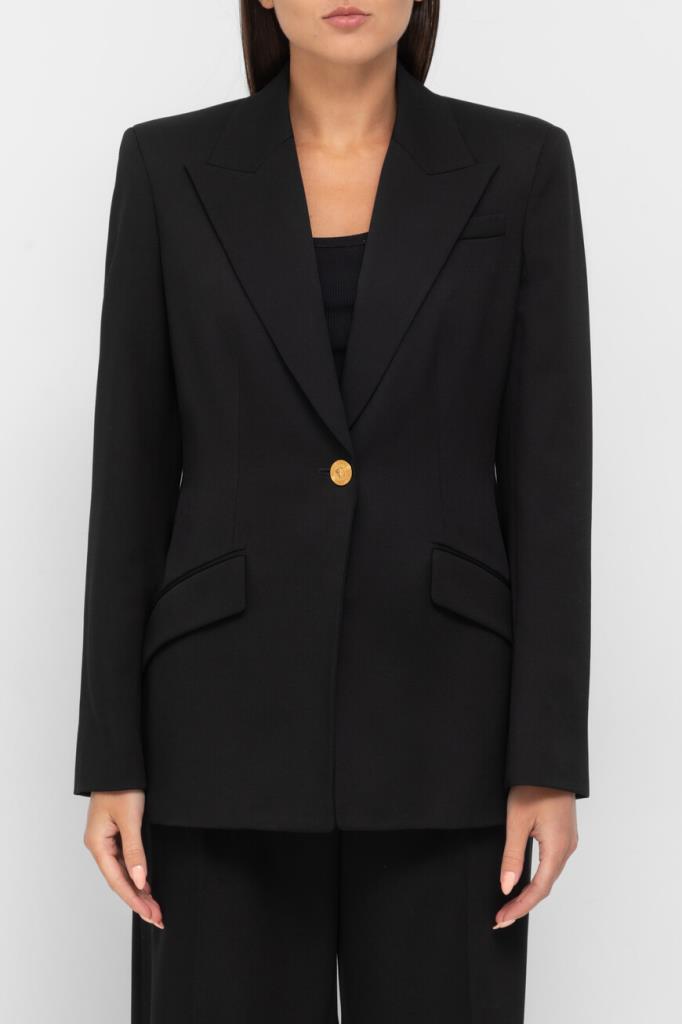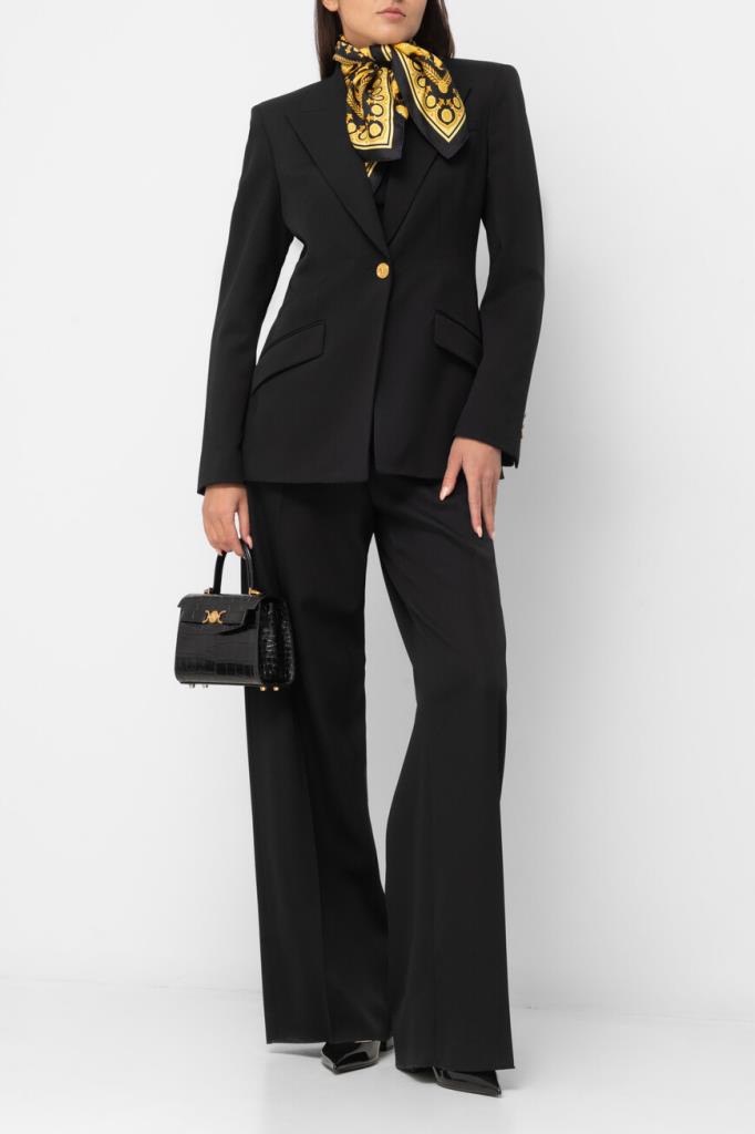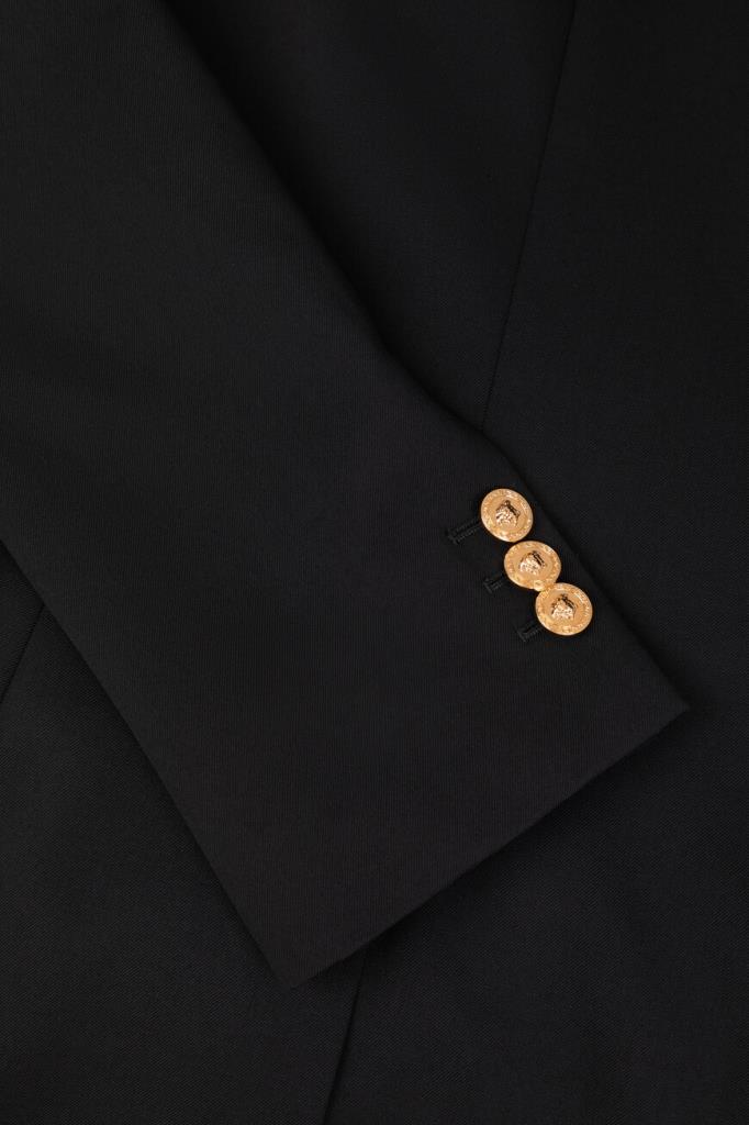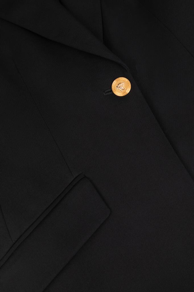 Однобортный блейзер на золотистой пуговице Medusa от VERSACE. Для изготовления прилегающей модели с резко очерченными плечами выбрана мягкая вирджинская шерсть чёрного цвета с добавлением эластичных волокон. Изделие интересно диагональными прорезными карманами с клапанами по бокам и подкладкой на основе купро и прочного вискозного волокна с принтом La Greca в тон. Жакет будет смотреться уместно и в образе для офиса, и в наряде для вечернего выхода.