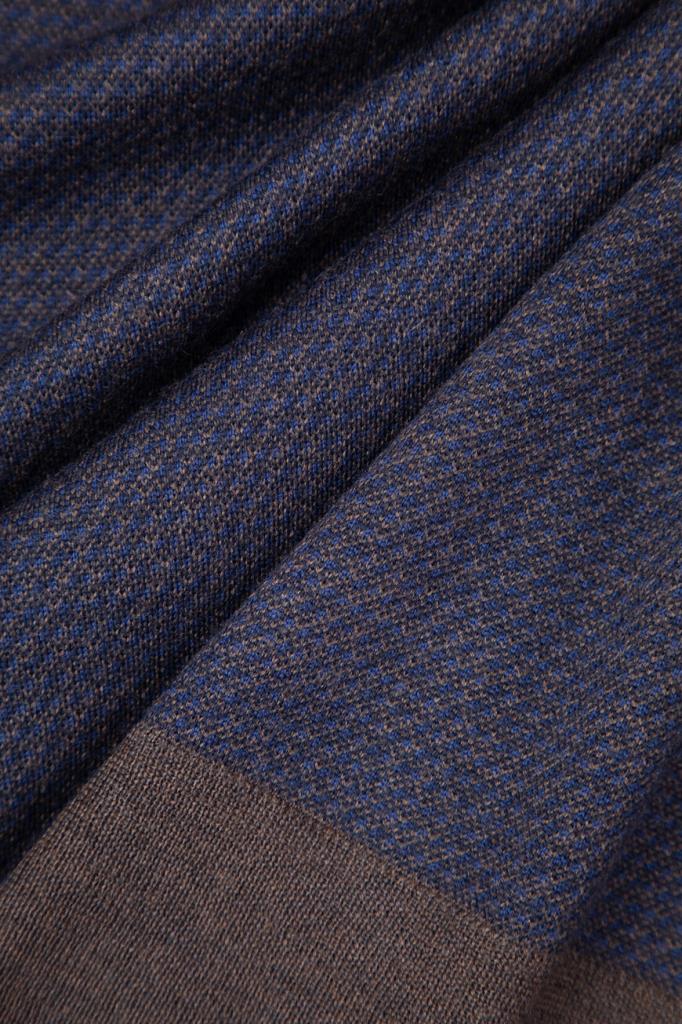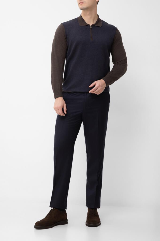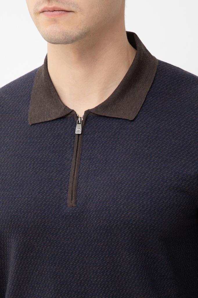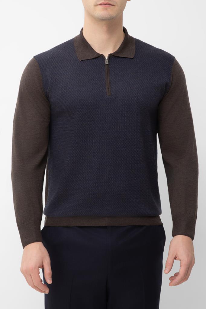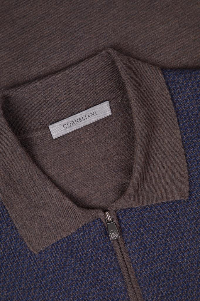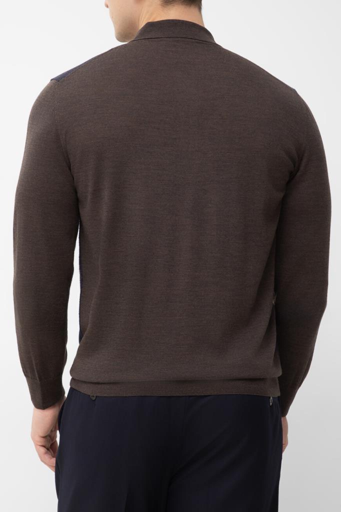 Поло из тонкой вирджинской шерсти от CORNELIANI. Модель окрашена в тёмно-коричневый оттенок и дополнена вставкой с трёхцветным жаккардовым узором спереди. Фасон изделия предполагает прямой силуэт и застёжку на короткую молнию с брендированным металлическим пуллером. Отложной воротник, планка застёжки, манжеты рукавов и широкий пояс оформлены резинкой.