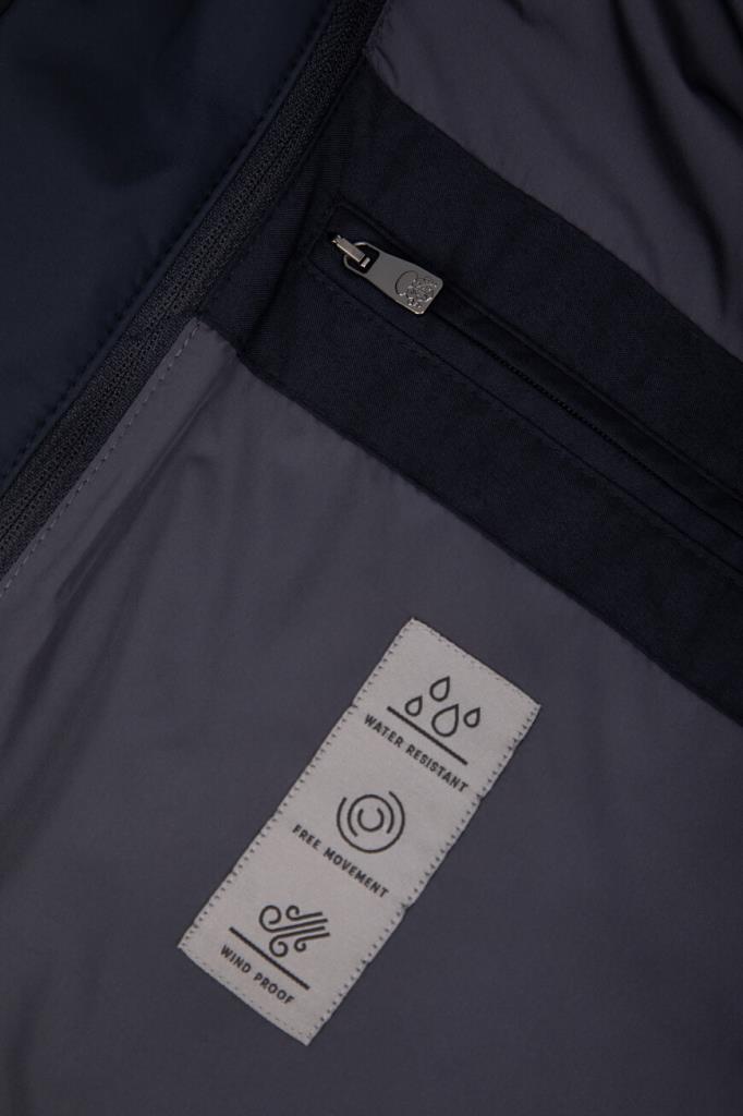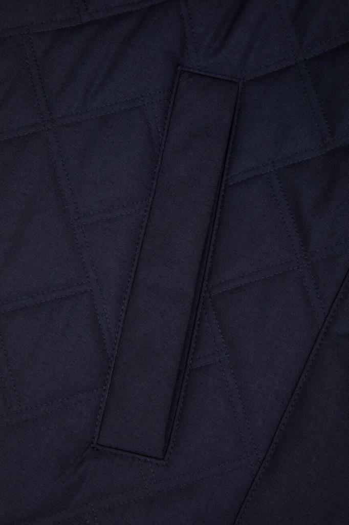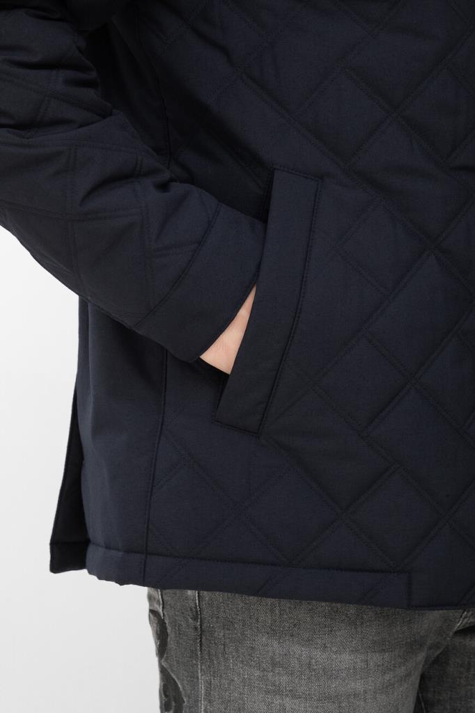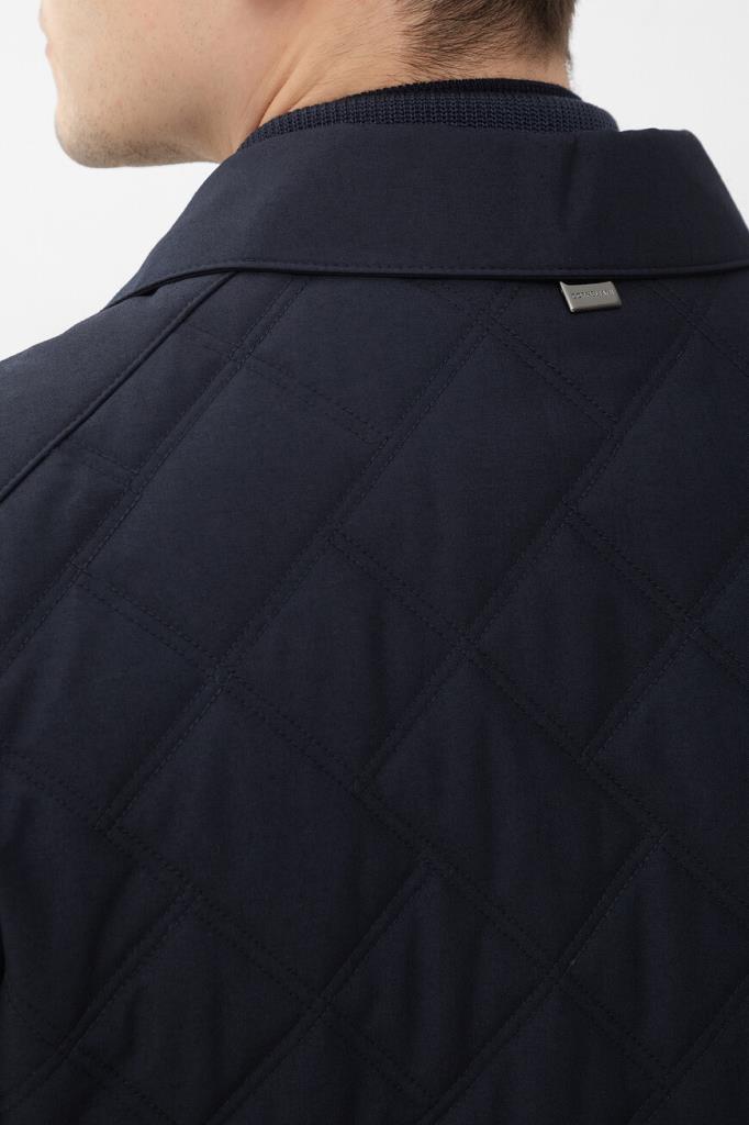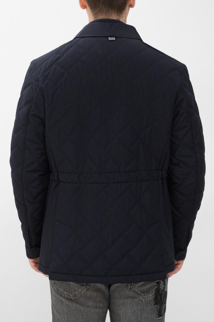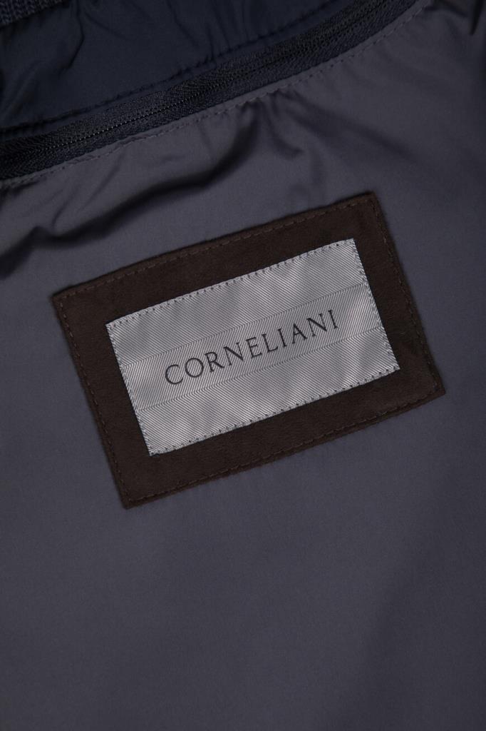 Прилегающая куртка CORNELIANI с ромбовидным стёганым узором. Модель тёмно-синего цвета сшита из тонкого прочного текстиля на основе полиэфира и вискозы. Материал, обработанный водоотталкивающим составом, не промокает под небольшим дождем, надёжно защищает от ветра и не препятствует циркуляции воздуха, поэтому изделие с двойным воротником поддерживает комфортный микроклимат. Утеплённая куртка интересна наличием отложного и невысокого трикотажного воротника-стойки в стиле бомбера на резинке, застёжкой на потайную молнию и крупные роговые пуговицы, скрытые под планкой, а также двумя шлицами для свободы движений.