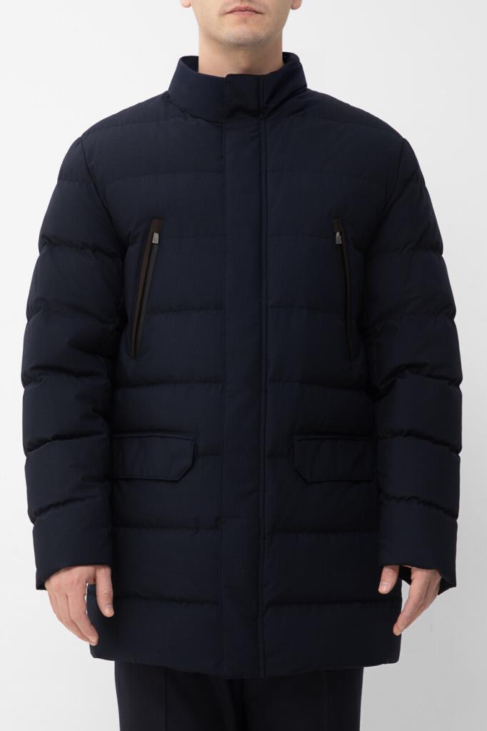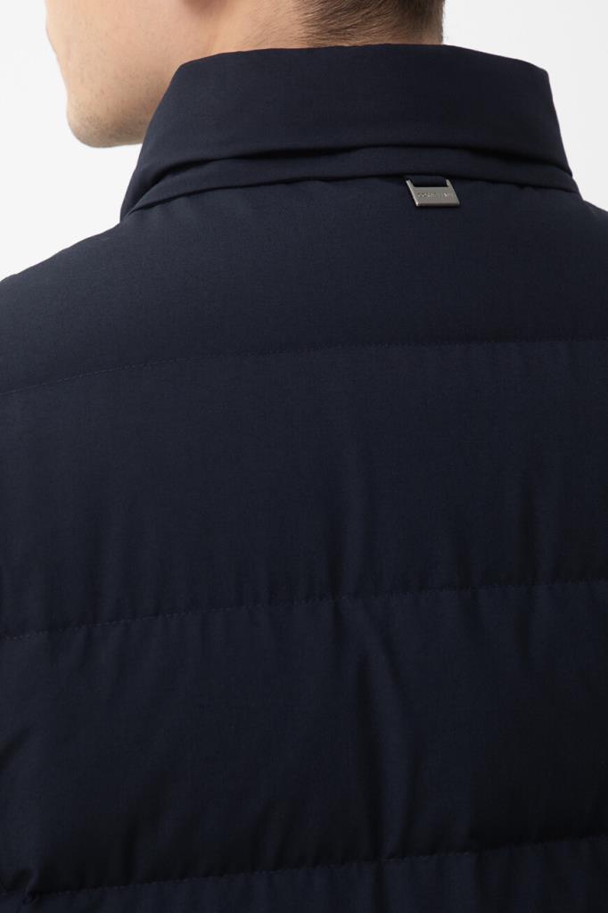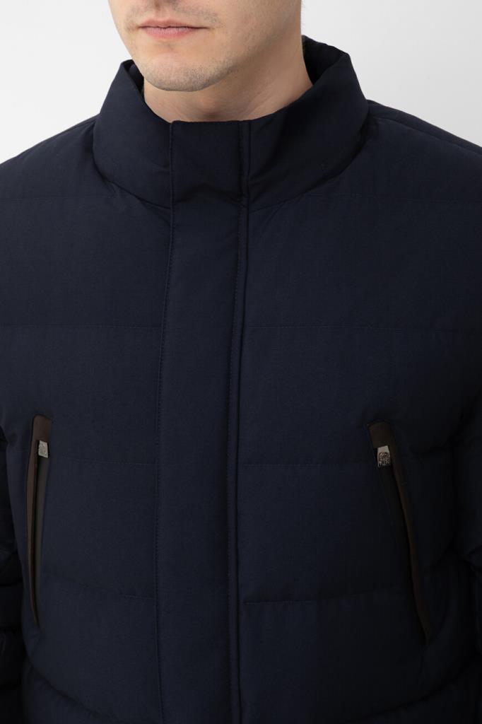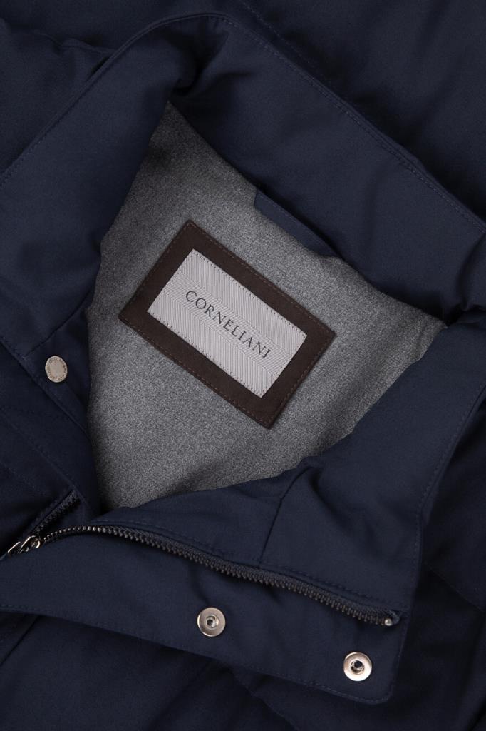Стёганая куртка CORNELIANI с четырьмя прорезными карманами. Модель изготовлена из прочного полиэфира и вискозного волокна тёмно-синего цвета. В качестве минималистичного декора выступает металлическая вставка-лейбл серебристого оттенка с гравировкой. Особенностями изделия являются серая подкладка и наполнитель на основе натурального пуха и пера.