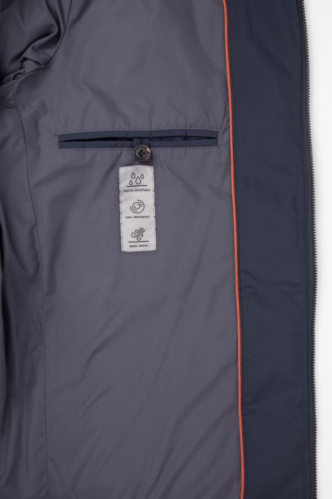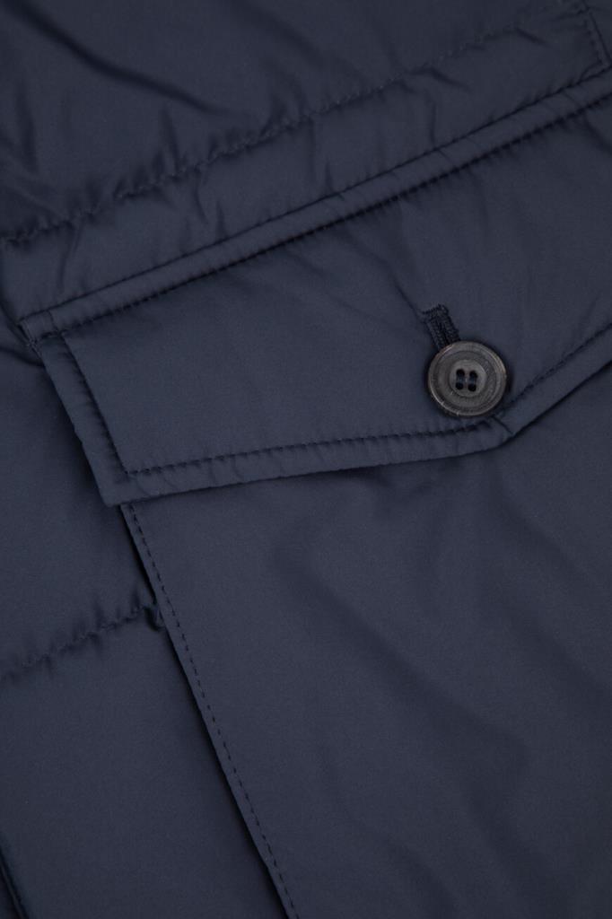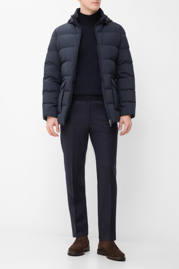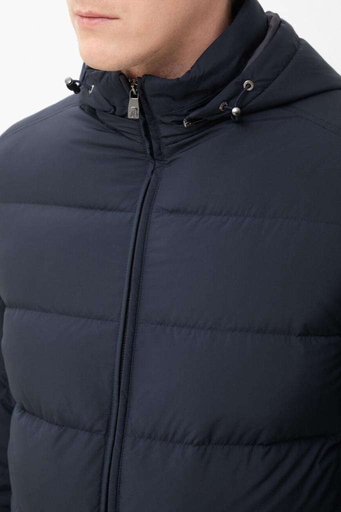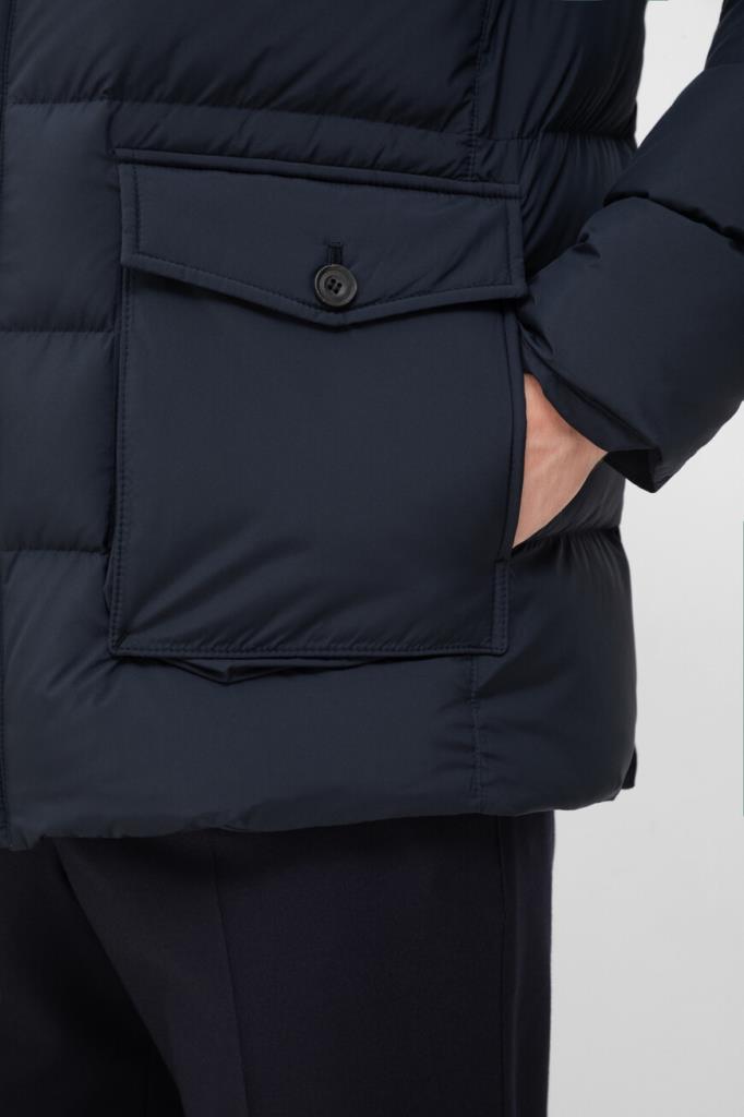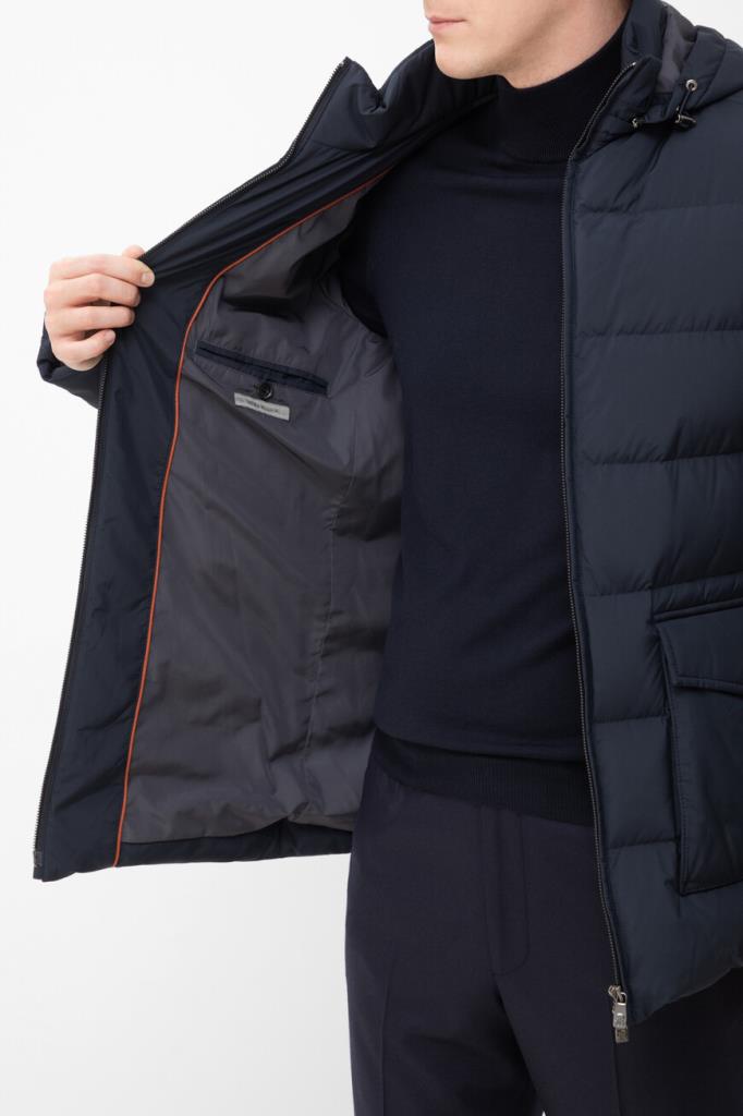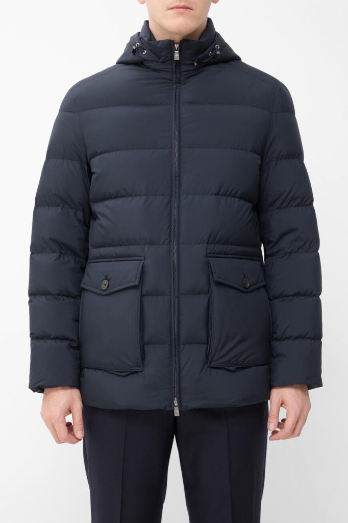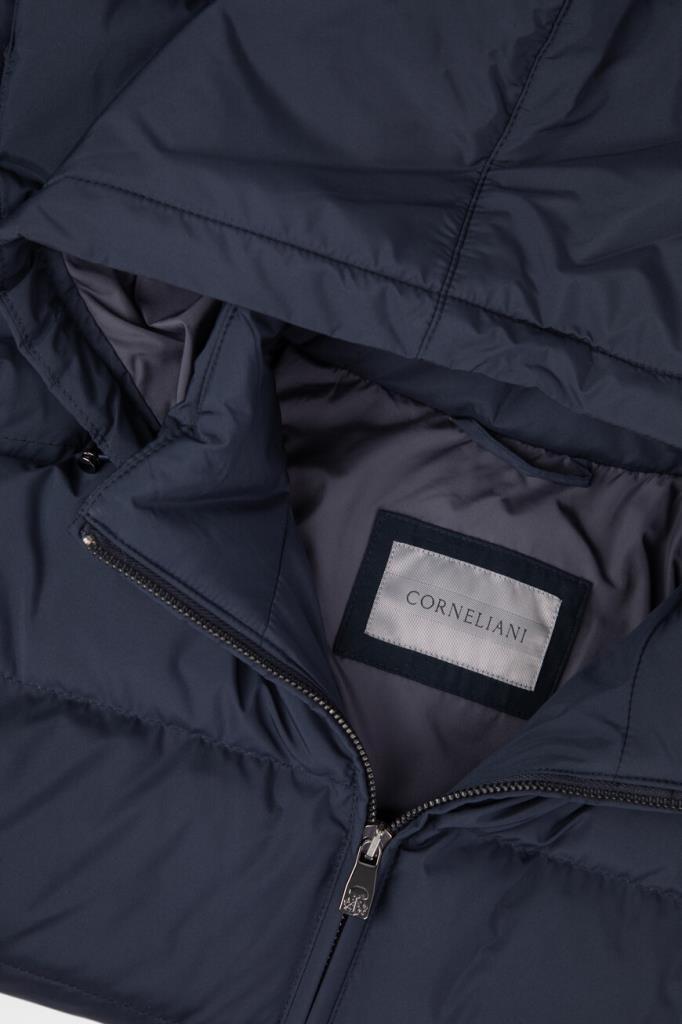 Тёмно-синяя парка CORNELIANI с высоким воротником-стойкой. Фасон изделия из влагостойкого непродуваемого поплина на основе полиэстера предполагает наличие глубокого капюшона на кулиске и застёжки на встречную молнию с двумя брендированными бегунками. Отличительными особенностями повседневной модели стали горизонтальная стёжка и два вида наполнителя: из полиэфира и на основе натурального гусиного пуха и пера.