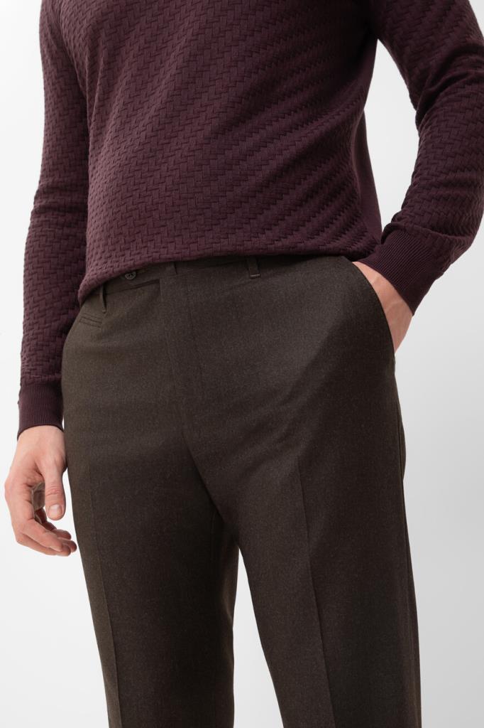 Классические брюки Corneliani на молнии и роговой пуговице с планкой. Конструкция прямой модели тёмно-коричневого оттенка предполагает наличие классических стрелок и пяти прорезных карманов: двух с диагональным входом по бокам, дополнительного небольшого кармана спереди справа и карманов на молнии сзади. Для создания органичного комплекта носите изделие с фиолетовым поло с длинными рукавами из той же коллекции.