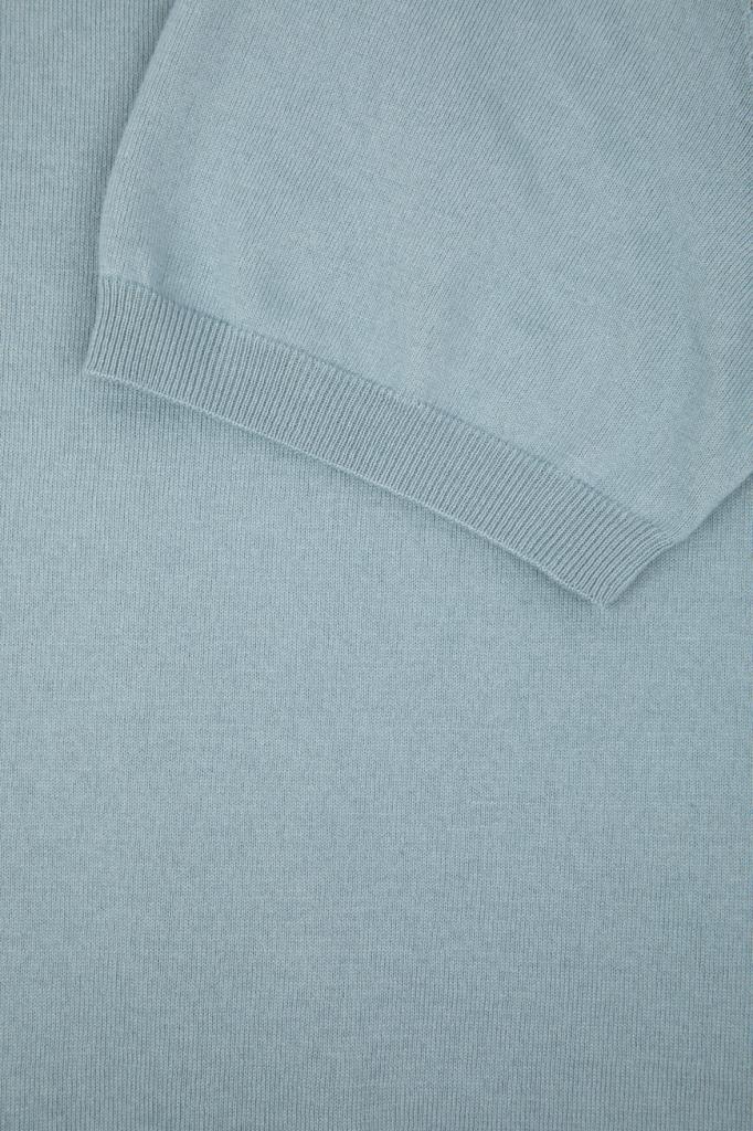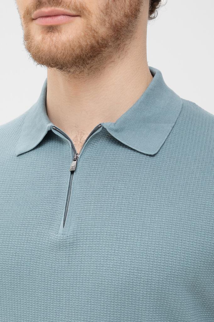 Голубое поло CORNELIANI связано из тончайшего отборного хлопка Pima. Обработка в технике мерсеризации сделала дышащий материал приятным на ощупь и прочным, как шёлк. Отличительными деталями являются геометрический мотив, вывязанный лицевой гладью, на лицевой стенке и брендированный пуллер молнии. Образ можно дополнить брюками с классическими стрелками на кулиске из той же коллекции.