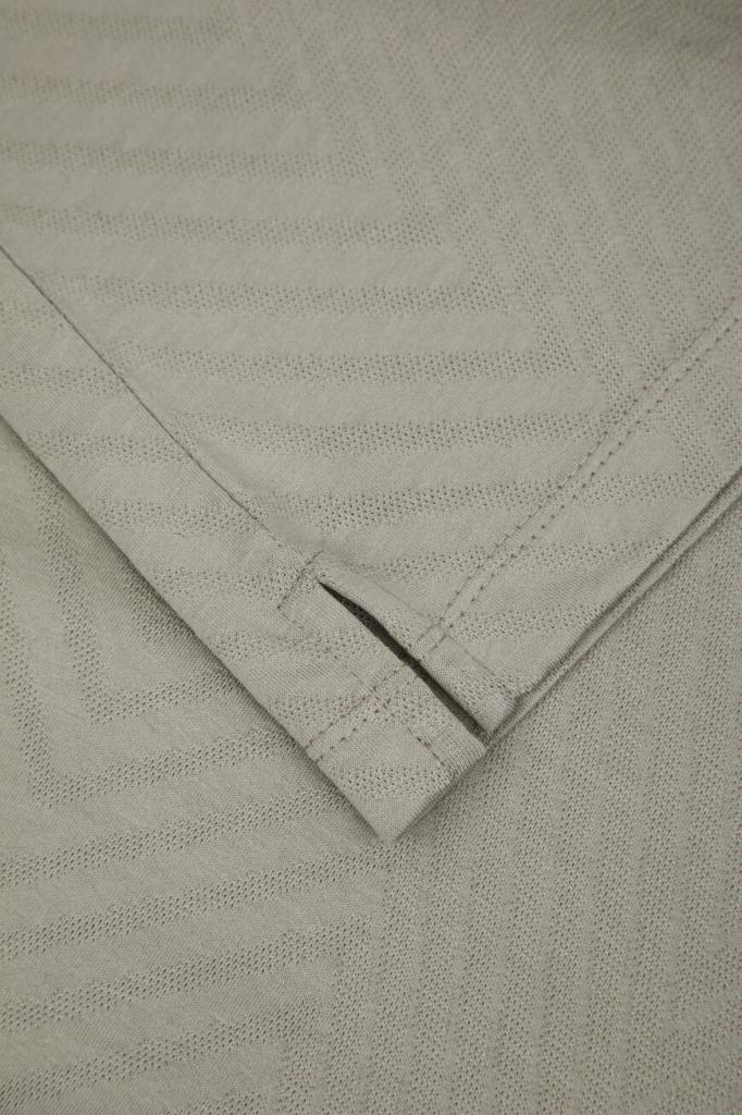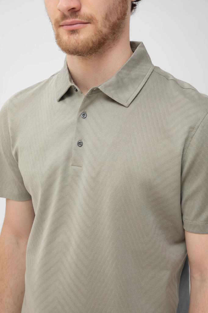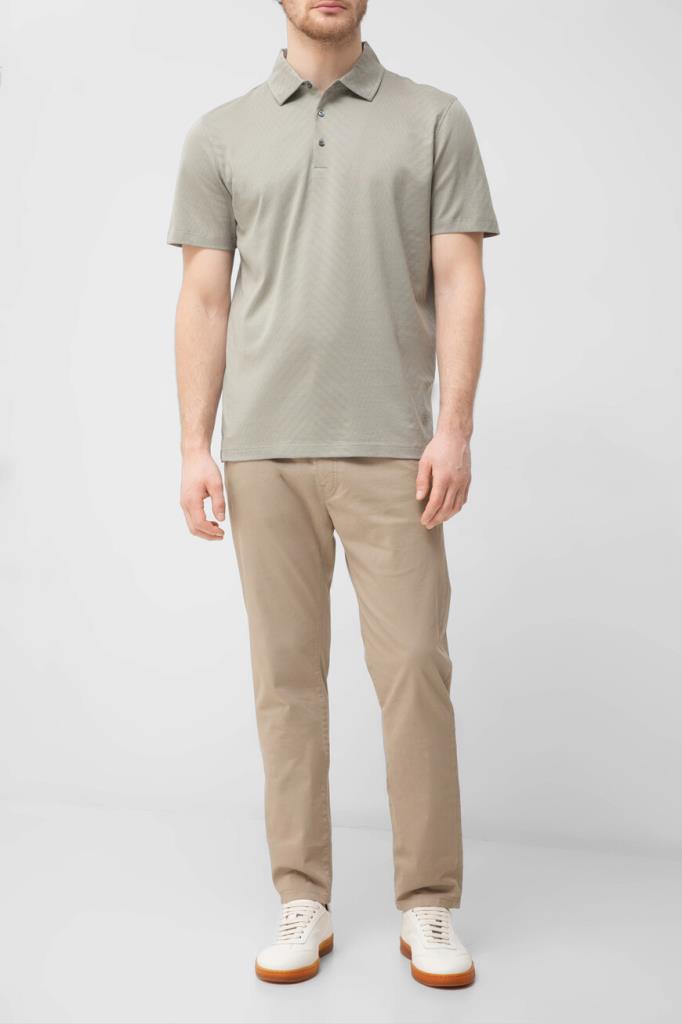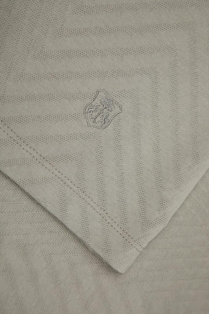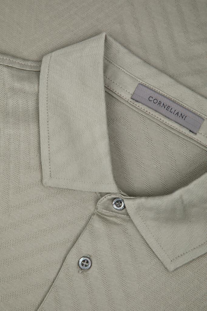 Зелёное поло CORNELIANI с короткими рукавами. Модель изготовлена из мягкого хлопкового трикотажа. Отличительными особенностями изделия прямого силуэта стали сетчатый геометрический узор в «ёлочку» в тон и наличие неглубоких боковых разрезов. О принадлежности поло Дому деликатно напоминает вышитая эмблема-герб спереди снизу.