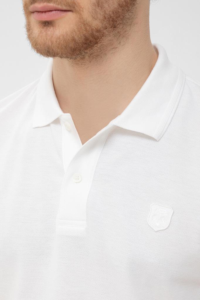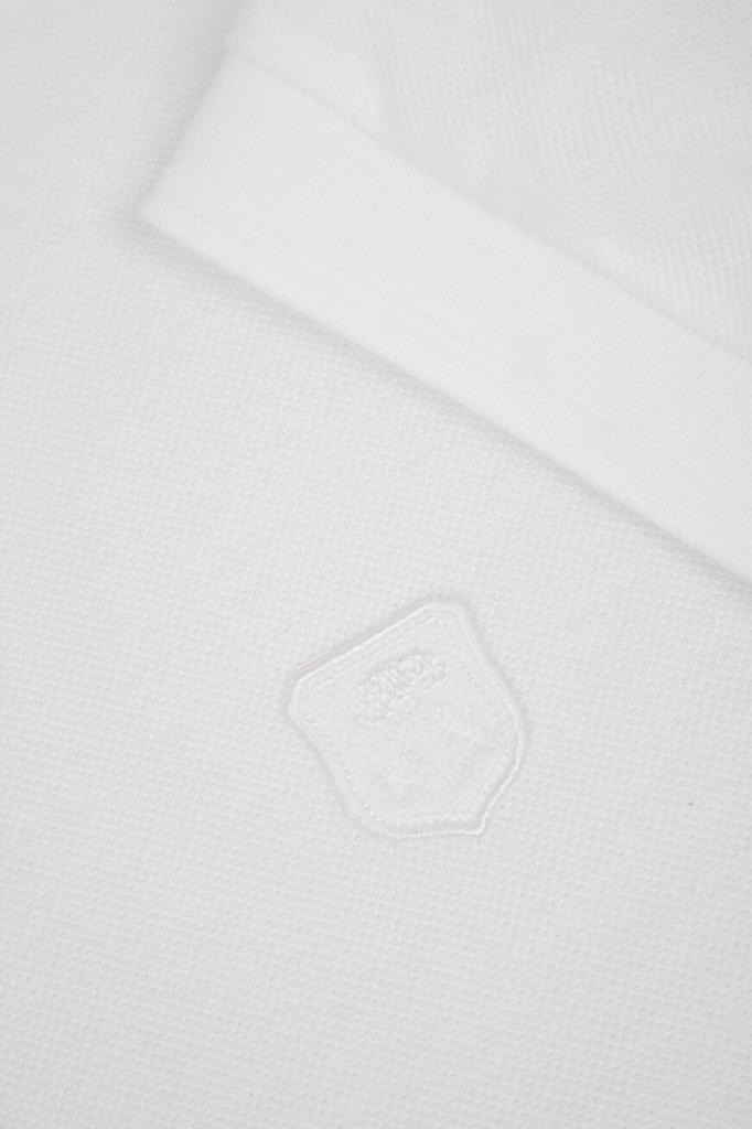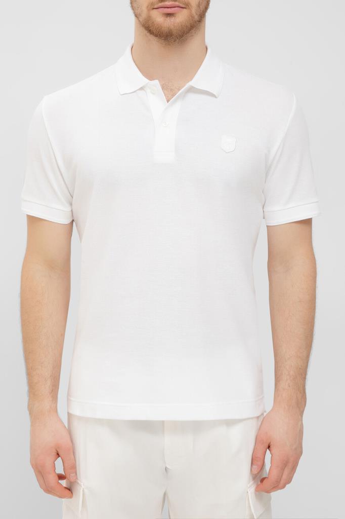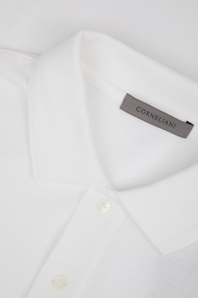 Прямое поло белого базового цвета от CORNELIANI. Для изготовления модели с короткими рукавами используется мягкое хлопковое пике с характерной текстурой. Слева на груди размещена тональная эмблема-герб, отсылающая к Дому, а горловина и манжеты рукавов украшены рельефным полосатым кантом.