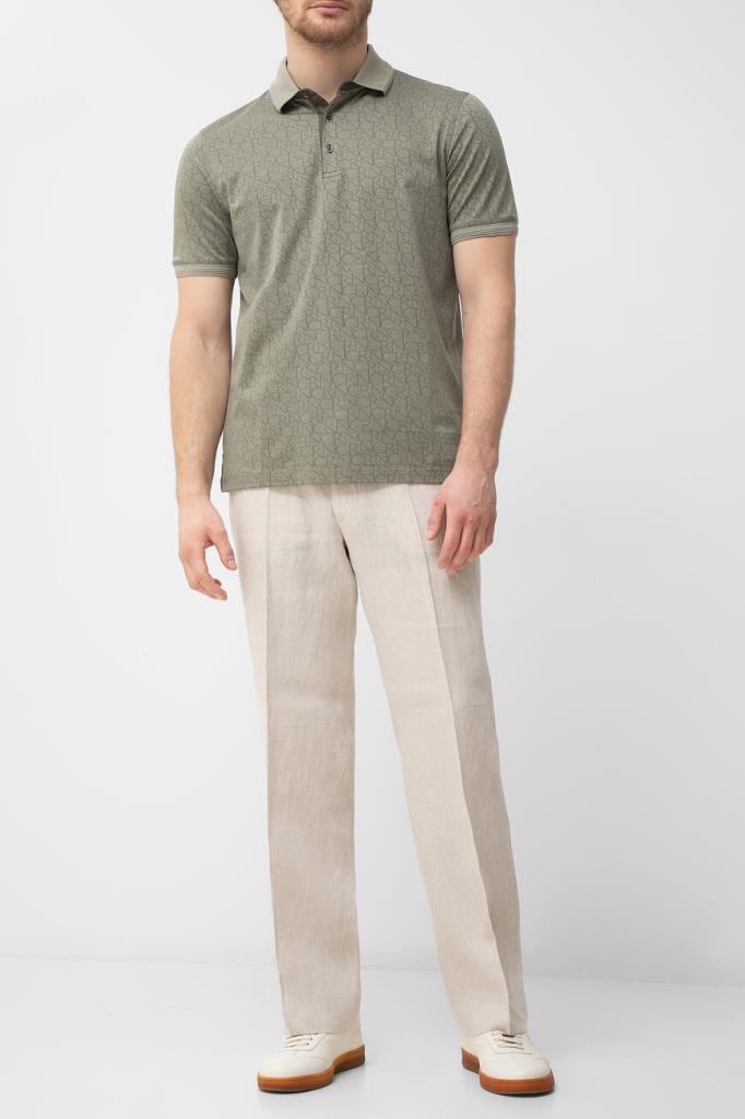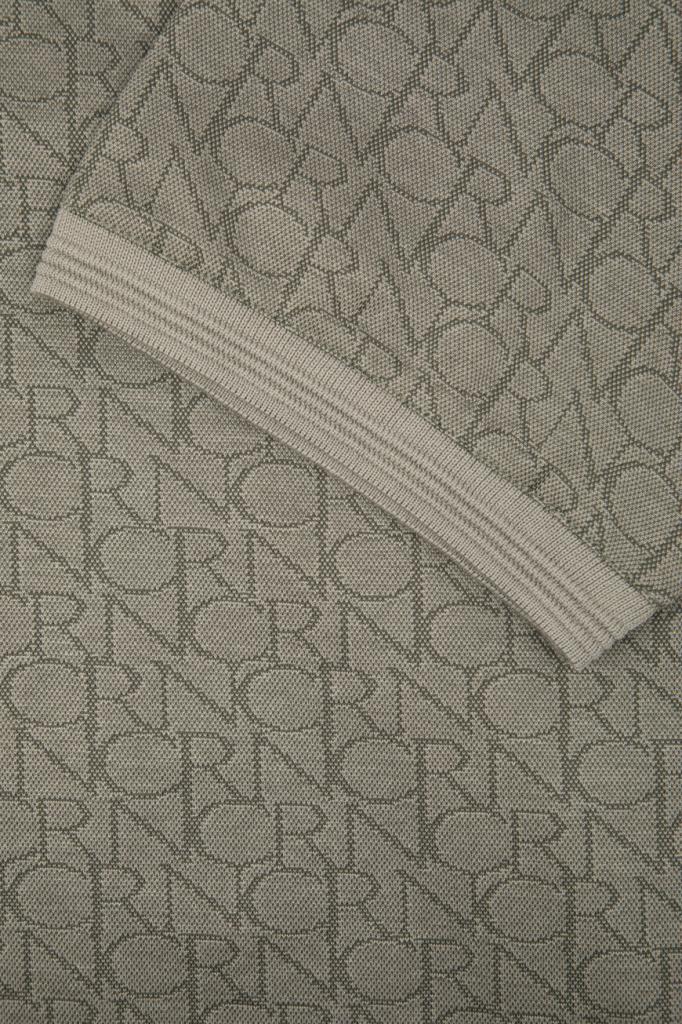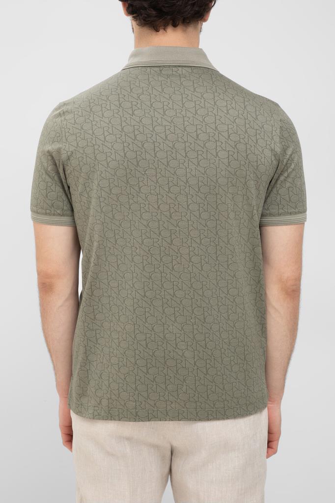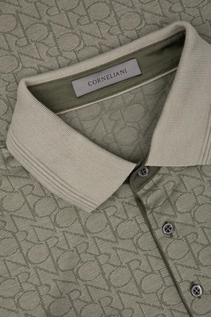 Брендированное поло CORNELIANI на трёх роговых пуговицах сверху. Для изготовления изделия прямого силуэта выбран мягкий хлопковый трикотаж. Поверхность повседневной модели декорирована геометрическим мотивом в виде надписи-аббревиатуры названия Дома. Отличительной деталью также является полосатый кант на однотонных отложном воротнике и манжетах рукавов.