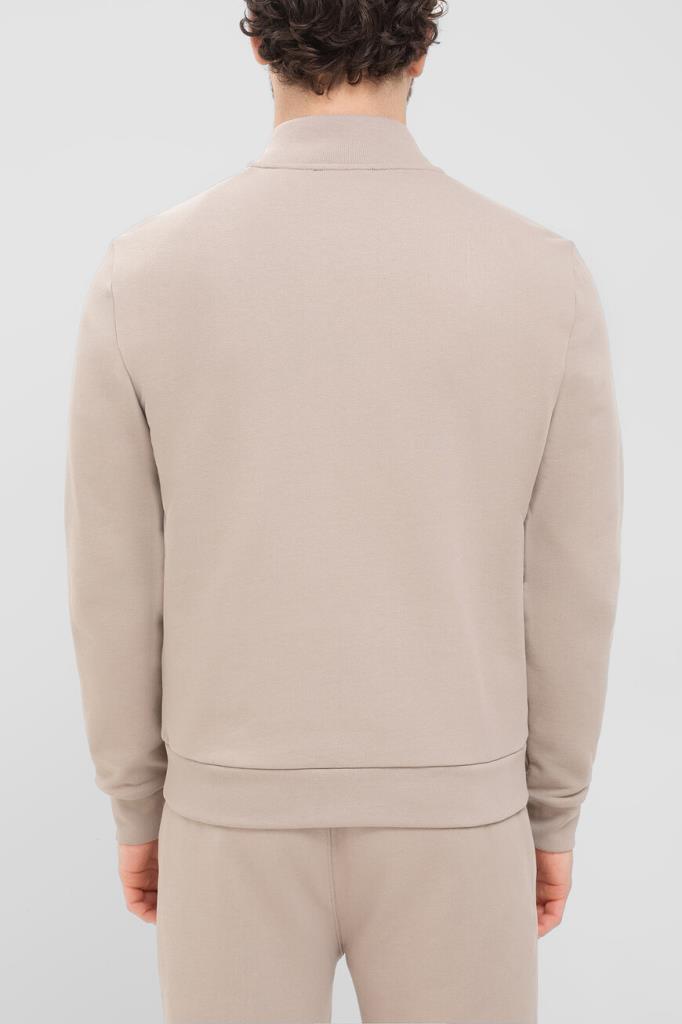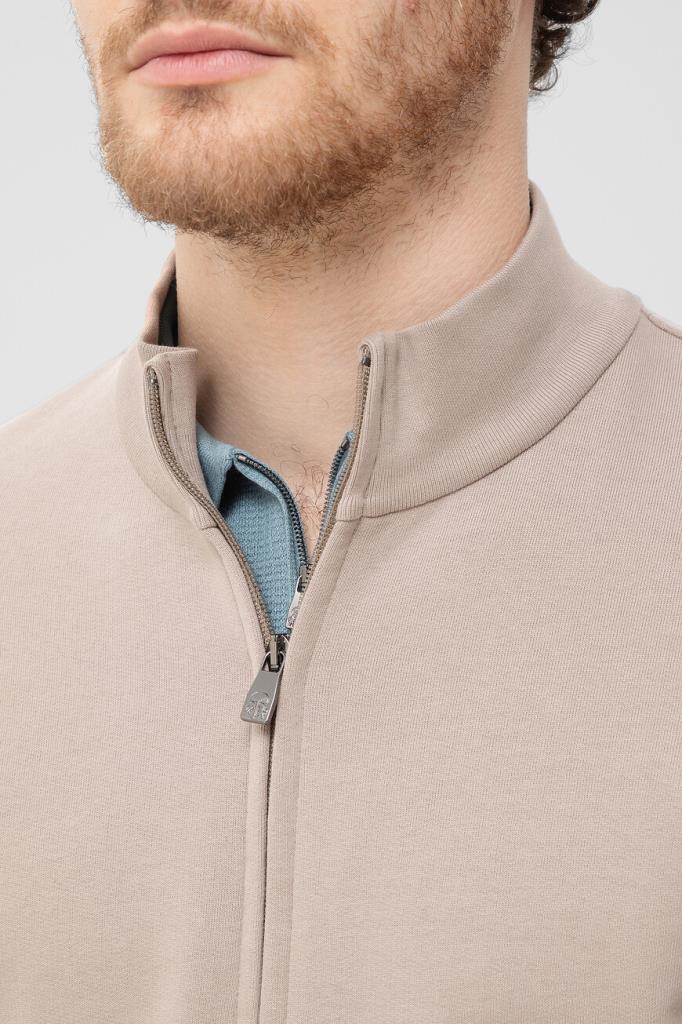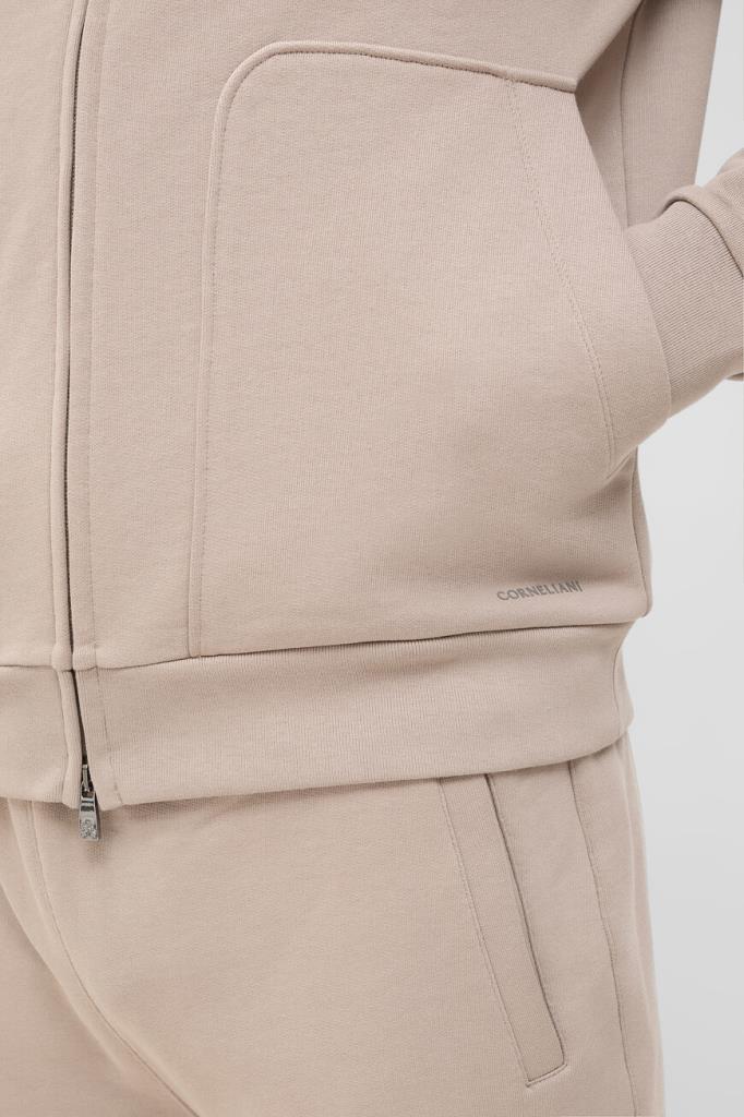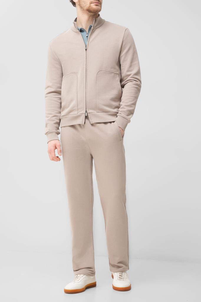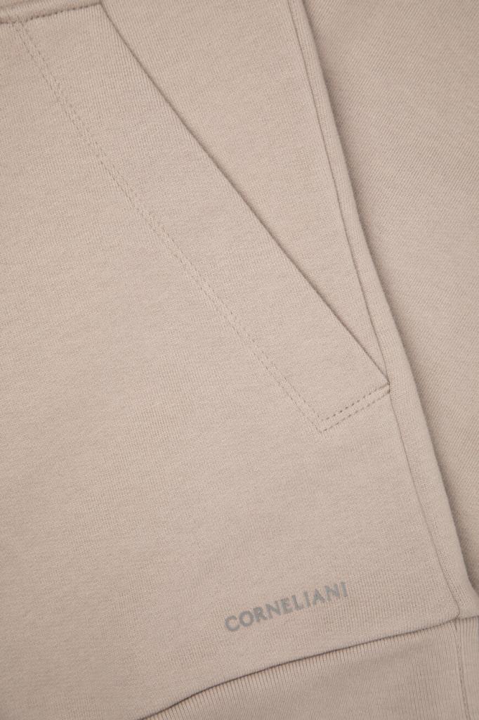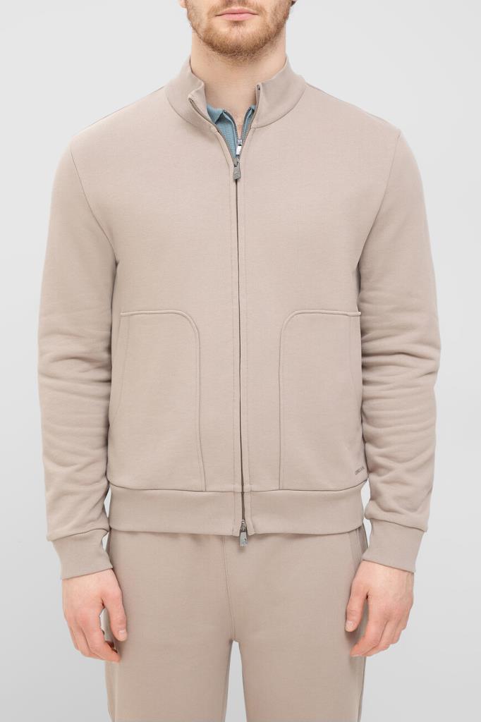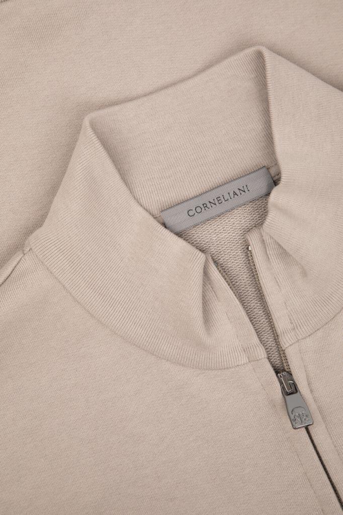 Прямая толстовка CORNELIANI с невысоким воротником-стойкой. Модель с застёжкой на встречную молнию с двумя брендированными пуллерами сшита из мягкого хлопкового футера. Конструкция изделия бежевого оттенка предполагает наличие двух крупных накладных карманов с рельефным кантом в тон по бокам, широкого эластичного пояса и манжет-резинок для комфортной посадки. Толстовку можно носить в комплекте с брюками на внутренней кулиске из той же коллекции.