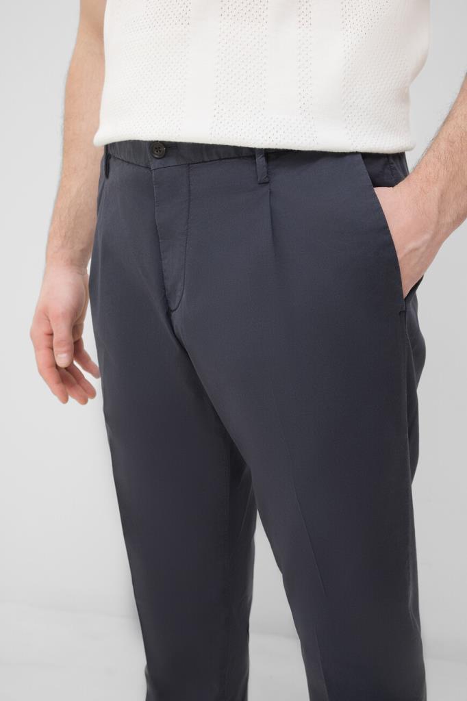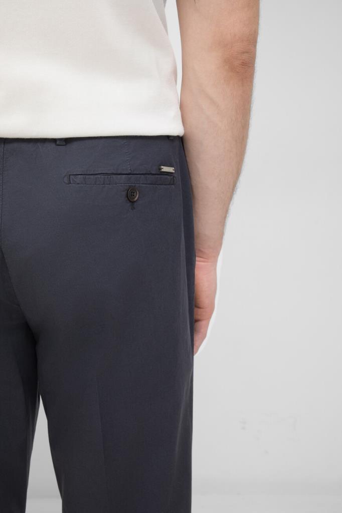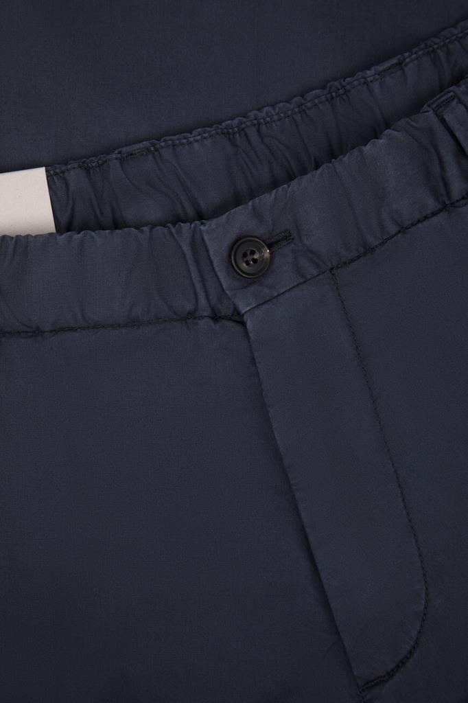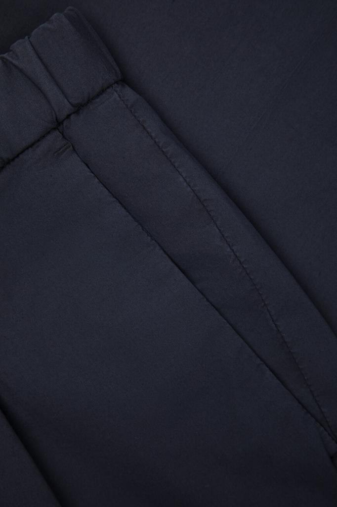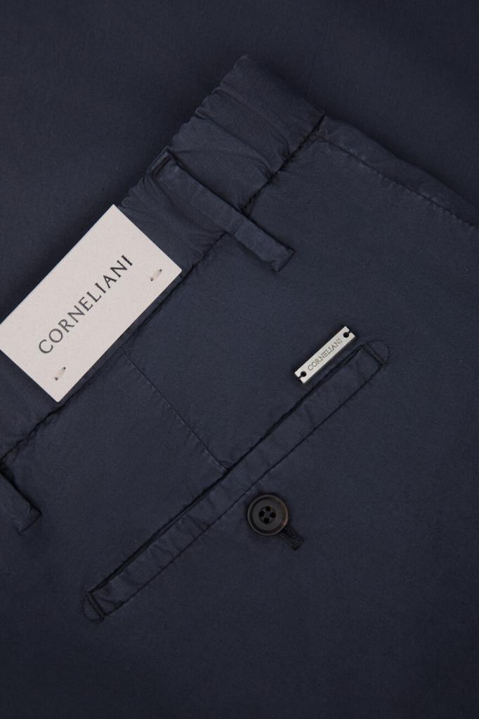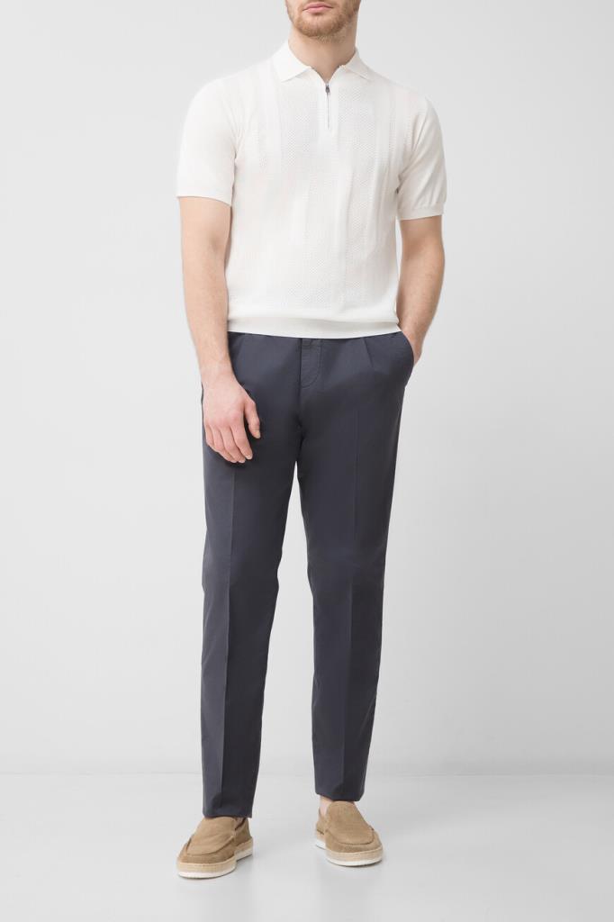 Трикотажные брюки тёмно-синего цвета от Corneliani. Изделие сшито из комбинации эластичного хлопка и гипоаллергенного лиоцелла. Принадлежность модели с классическими стрелками и защипами сверху Дому деликатно обозначена деталью с тиснёным логотипом над правым задним карманом. Брюки составят превосходный комплект с белым поло из той же коллекции.