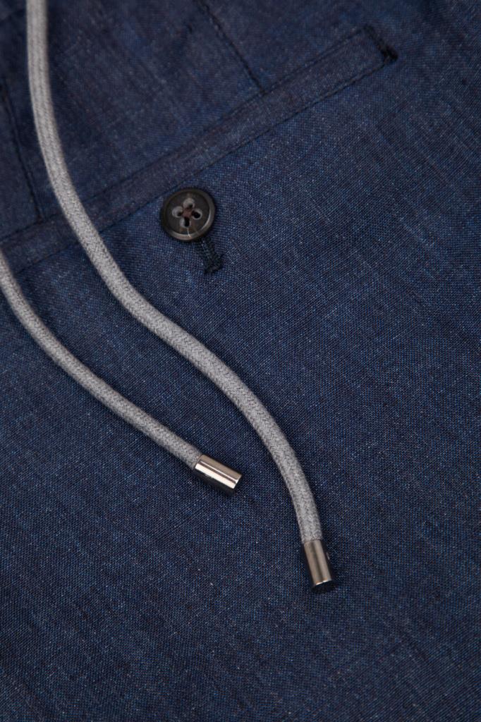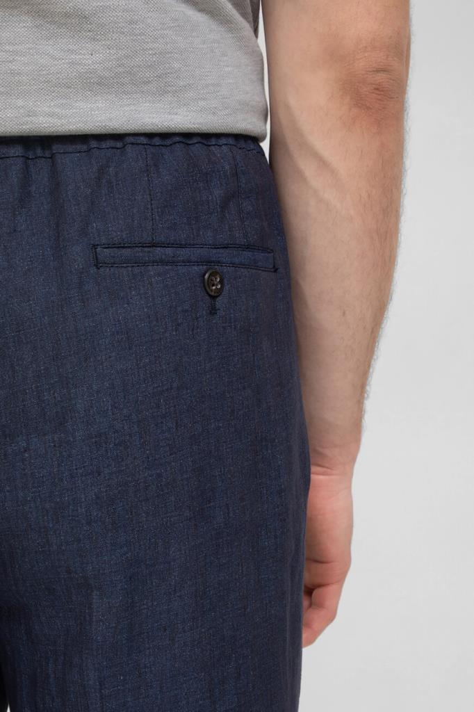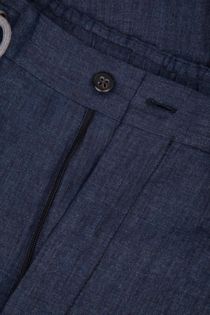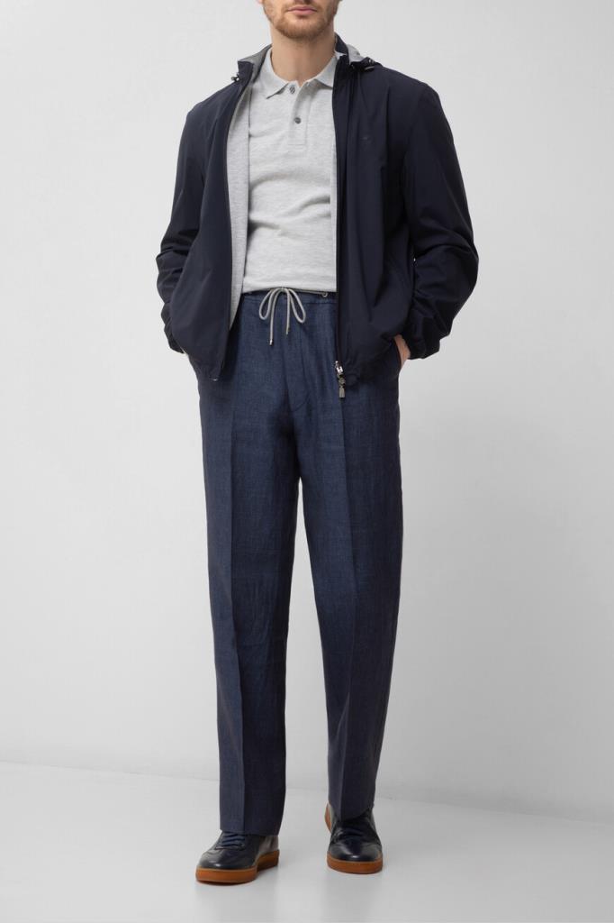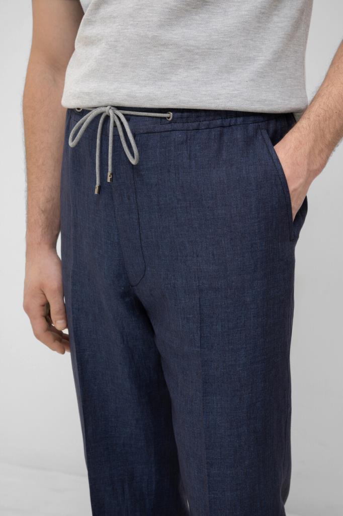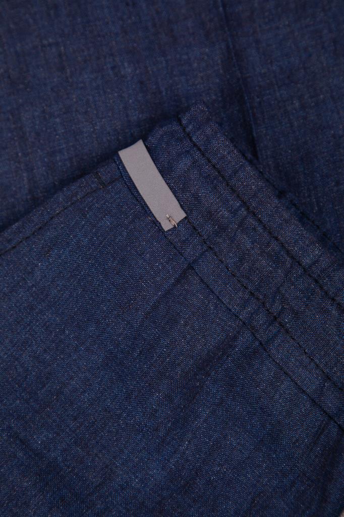 Тёмно-синие брюки CORNELIANI с брендированием на подкладке. Для создания модели прямого силуэта выбран лёгкий мягкий лён. Изделие интересно гармоничным сочетанием элементов классического и спортивного стилей: стрелок и плотного широкого пояса на серой кулиске. Оптимальную посадку брюк по фигуре обеспечивает застёжка на молнию, покрытую планкой, и роговую пуговицу.