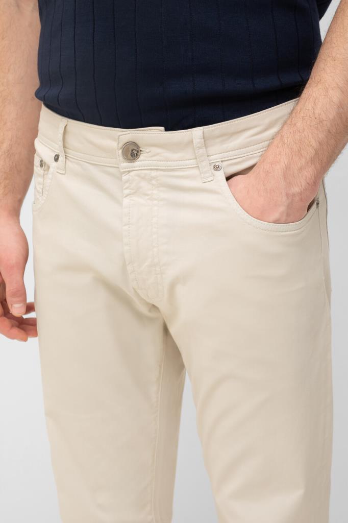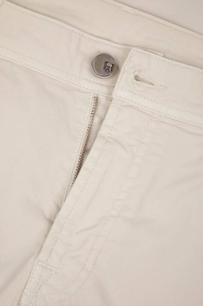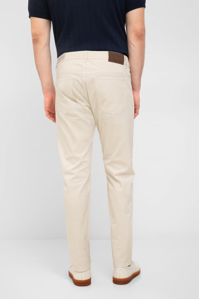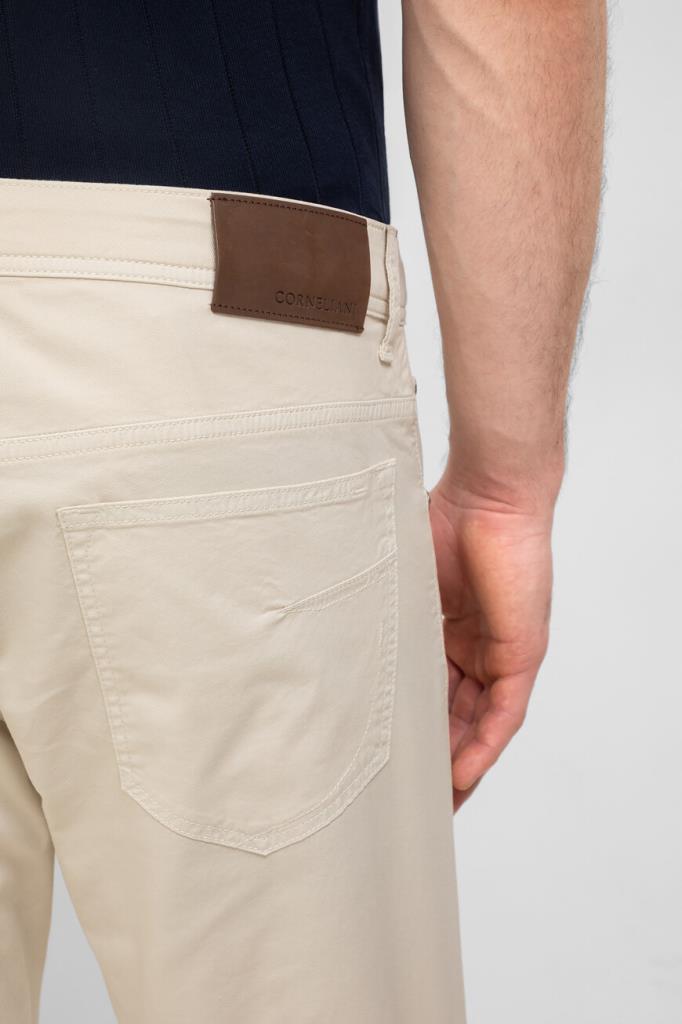 Стрейчевые джинсы Corneliani с пятью карманами. Изделие прямого силуэта выполнено из мягкого хлопкового габардина, окрашенного в готовом виде, и оснащено застёжкой на молнию, покрытую планкой, и брендированную металлическую пуговицу. Роль знакового декора отдана прямоугольной кожаной накладке с тиснёным логотипом сзади и вышитому тональному гербу Дома на маленьком кармане спереди.