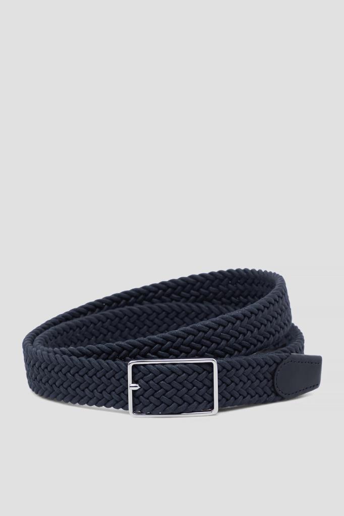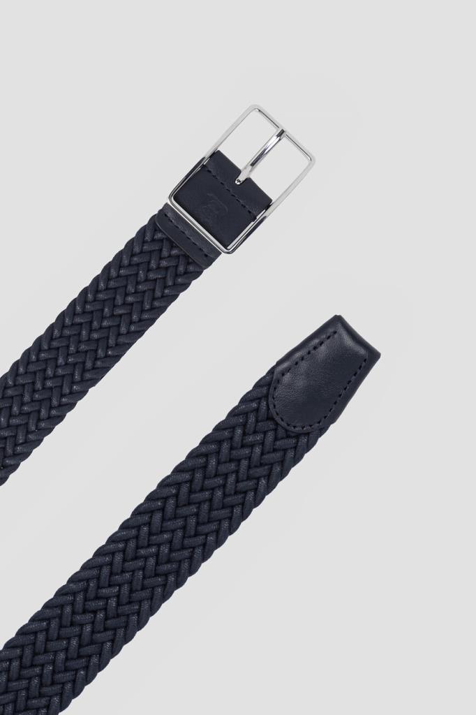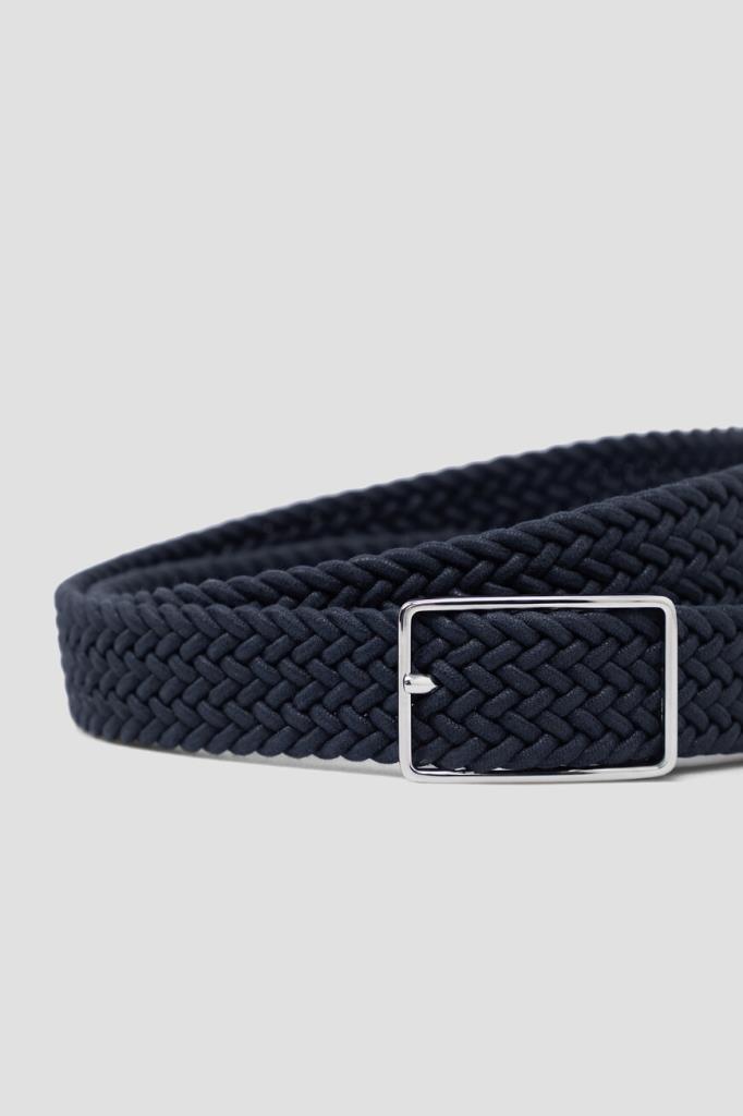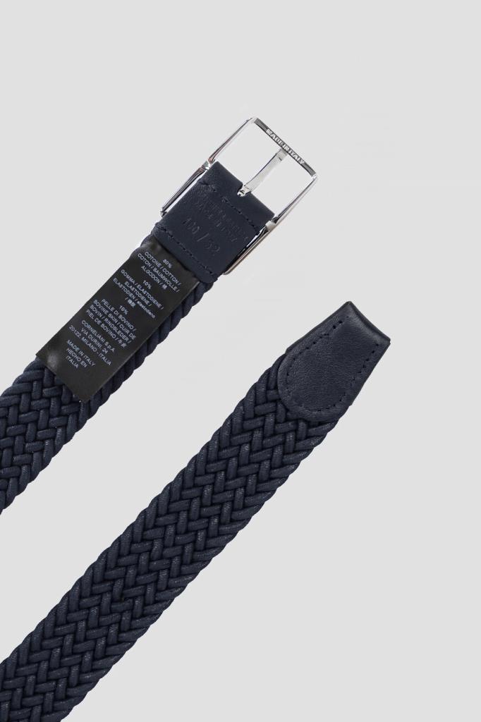 Ремень CORNELIANI сплетён из эластичных хлопковых шнуров. Полосы прочного вощеного материала тёмно-синего цвета образуют между собой шевронный узор. Кончики изделия укреплены вставками из гладкой кожи быка, одна из которых декорирована тиснением в виде герба Дома. Посадку аксессуара, не нуждающегося в дополнительных отверстиях для фиксации, удобно регулировать серебристой прямоугольной пряжкой.