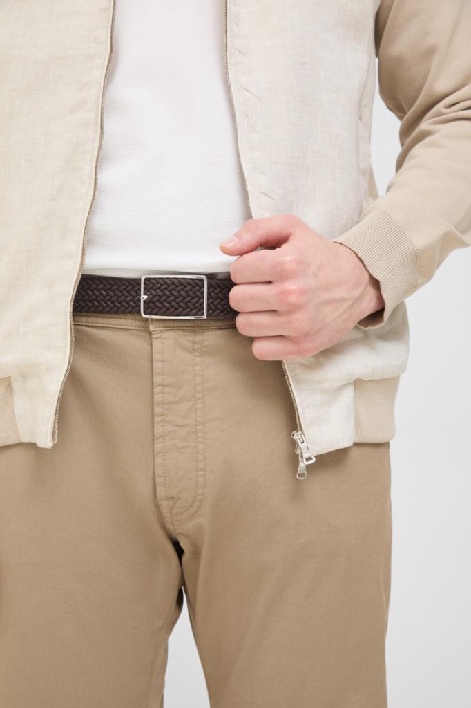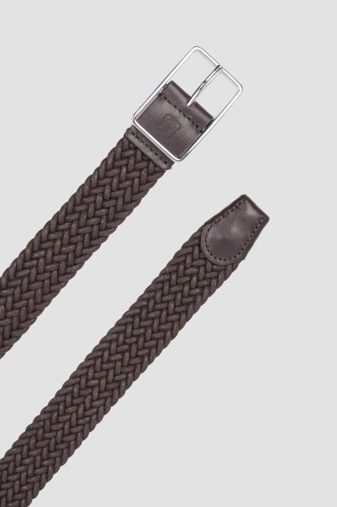 Текстильный ремень CORNELIANI удобно регулировать по объёму. За счёт эластичных хлопковых шнуров коричневого цвета, образующих при переплетении фактурный рисунок, изделие обходится без дополнительных прорезей. Отличительными деталями являются серебристая прямоугольная пряжка с язычком и вставки из гладкой кожи быка на концах аксессуара.