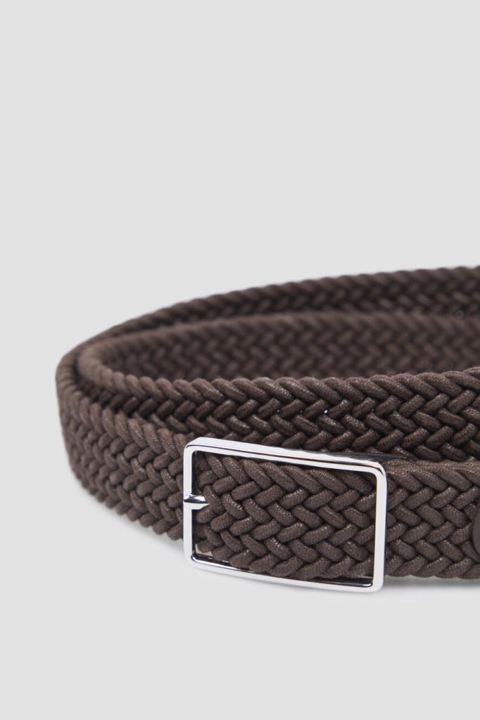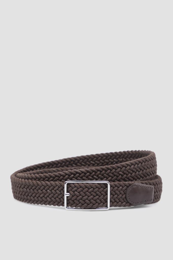 Текстильный ремень CORNELIANI удобно регулировать по объёму. За счёт эластичных хлопковых шнуров коричневого цвета, образующих при переплетении фактурный рисунок, изделие обходится без дополнительных прорезей. Отличительными деталями являются серебристая прямоугольная пряжка с язычком и вставки из гладкой кожи быка на концах аксессуара.