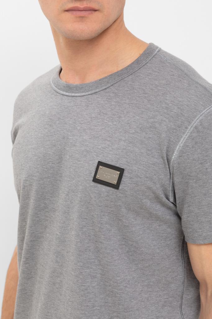 Футболка прямого кроя со знаковой символикой Dolce & Gabbana. Для создания изделия из коллекции Essential выбрано меланжевое хлопковое джерси серого цвета. На принадлежность повседневной модели Дому указывает чёрная кожаная нашивка с металлическим лейблом и гравировкой.
