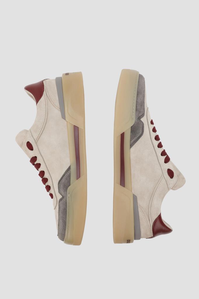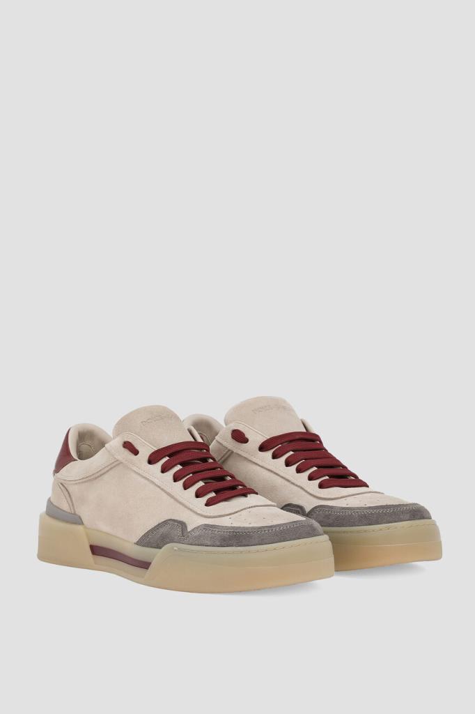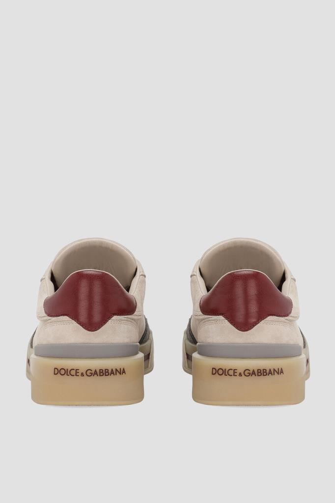 Замшевые сникеры New Roma от DOLCE & GABBANA. Удобная модель светло-бежевого оттенка отличается бархатистой поверхностью и наличием вставок из мягкой замши серого цвета на носке и из натуральной кожи козы бордового оттенка на заднике. Конструкция современной пары обуви также характеризуется закрытым типом шнуровки и плоской резиновой подошвой с логотипом в задней части.