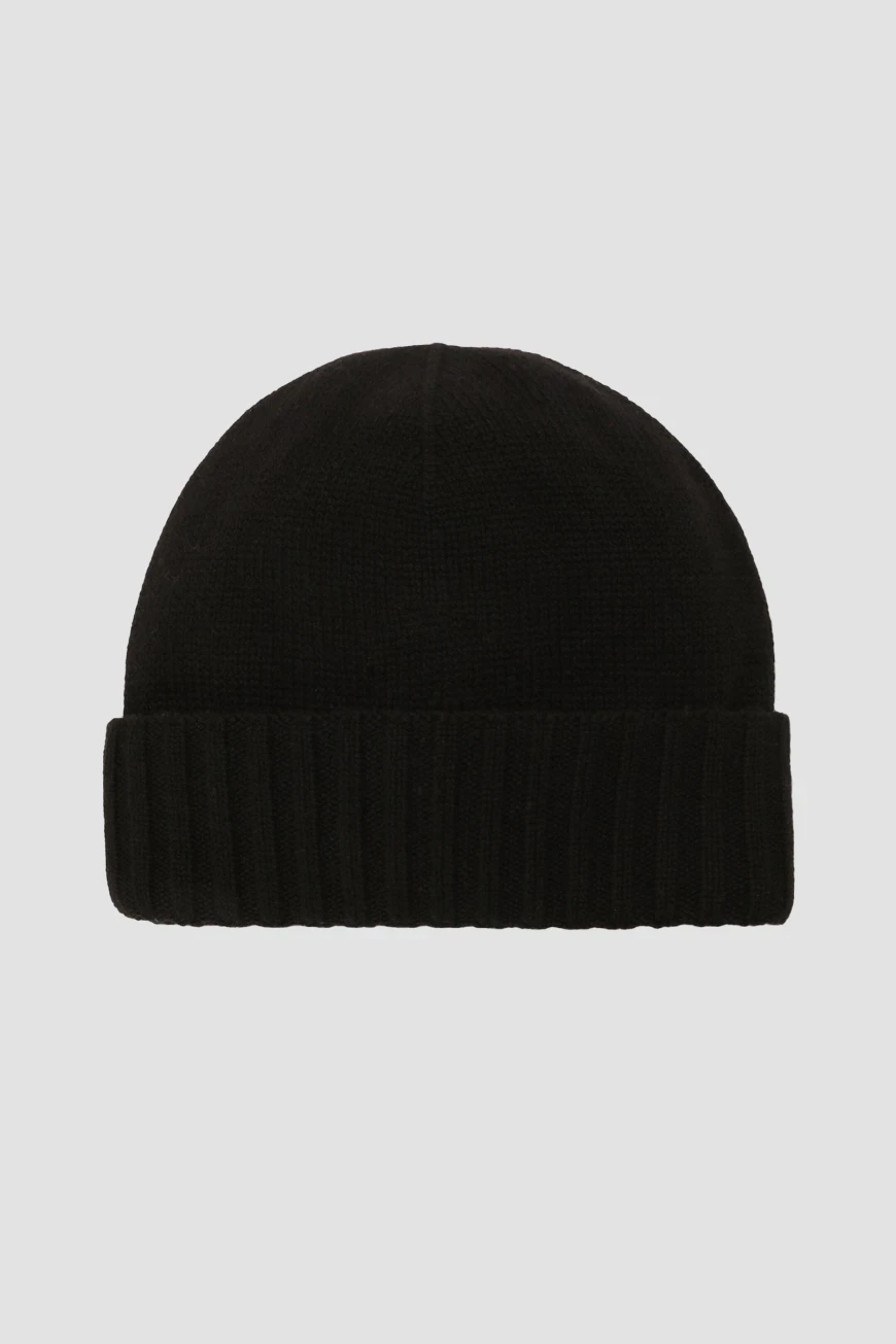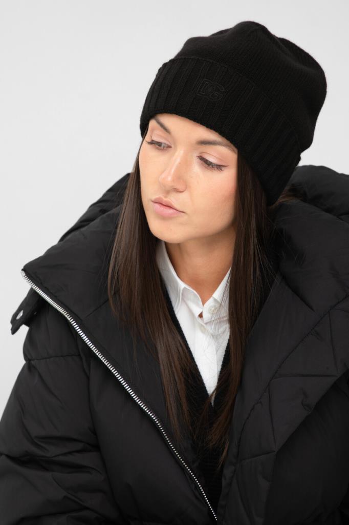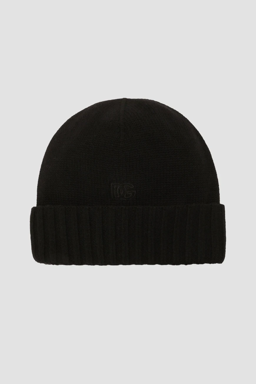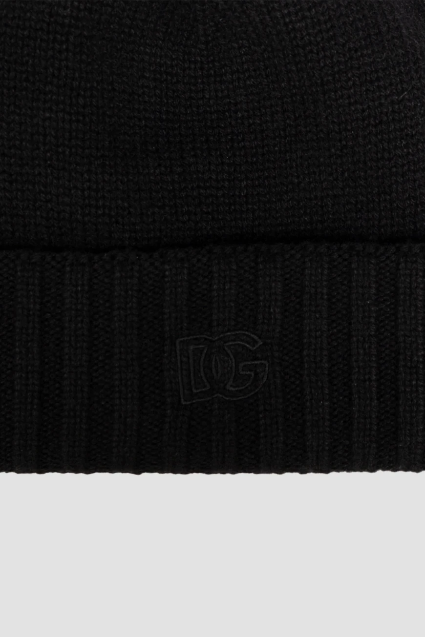 Чёрная шапка бини из коллекции Dolce&Gabbana DNA с широким отворотом. Для создания эксклюзивной модели чулочной вязки используется мягкая кашемировая пряжа. Отворот с эластичным рифлёным узором, дополнительно защищающий от ветра, украшен спереди вышитой нитью в тон монограммой DG. Изделие дополнит Ваш образ в прохладные дни.
