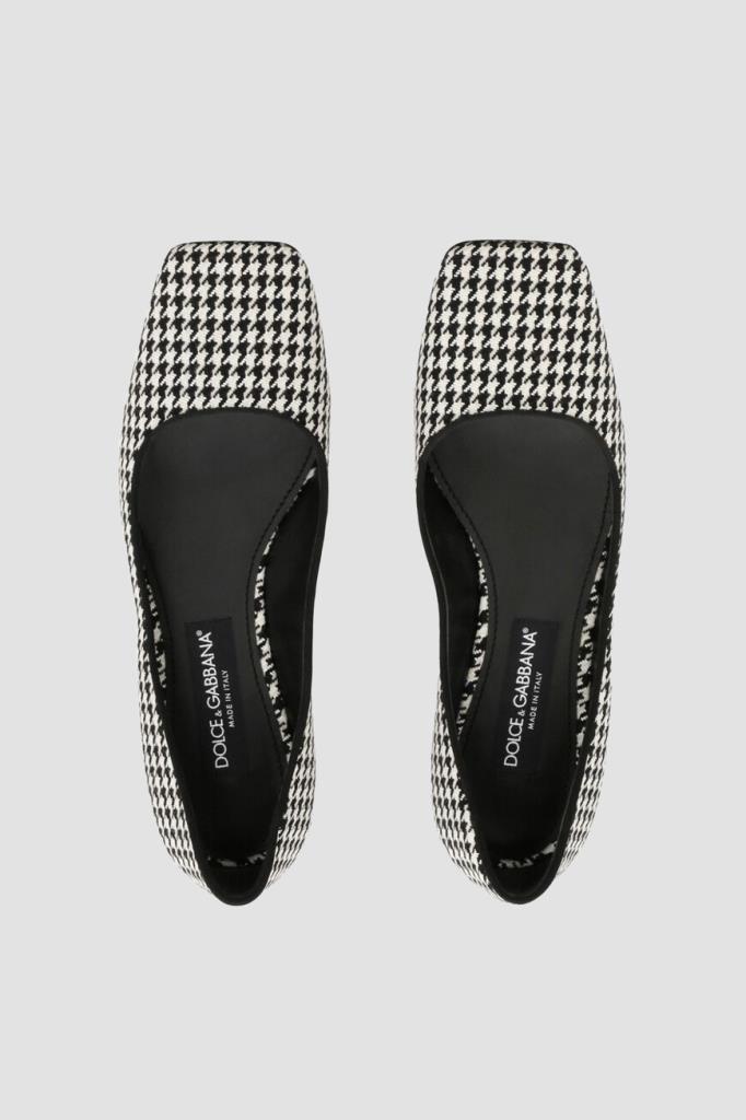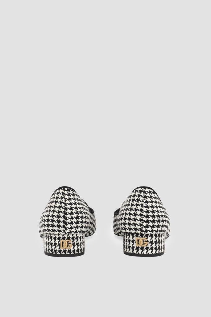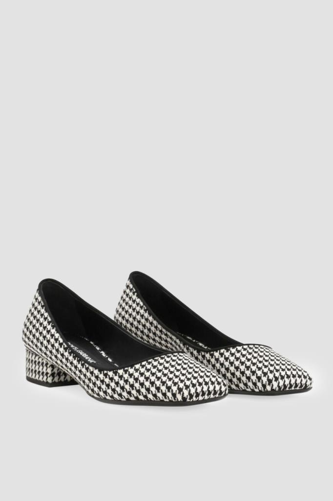Туфли Jackie 30 от Dolce&Gabbana на широком устойчивом каблуке. Модель изготовлена из прочного вискозного волокна и декорирована графичным узором «пье-де-пуль» в чёрных и белых тонах. Конструкция удобной пары предполагает квадратный носок, добавляющий современный штрих и дополняющий классический узор, и кожаную подошву. Атрибутами Дома являются брендирование на чёрных кожаных стельках, перекрёстный лого-монограмма из металла светло-золотого оттенка на заднике и логотип снизу на подошве.