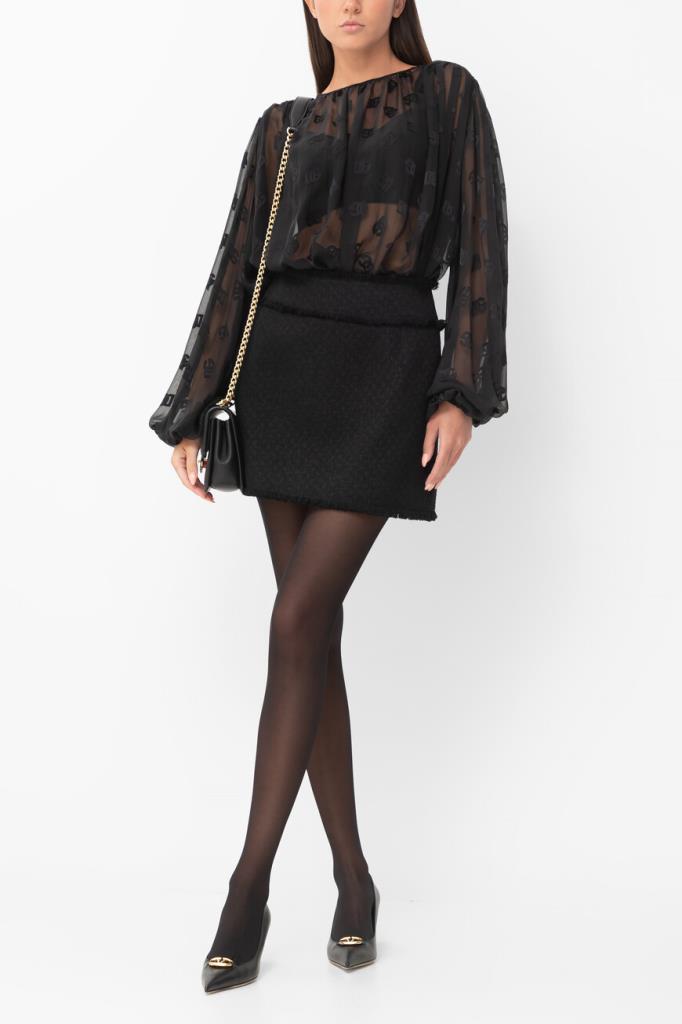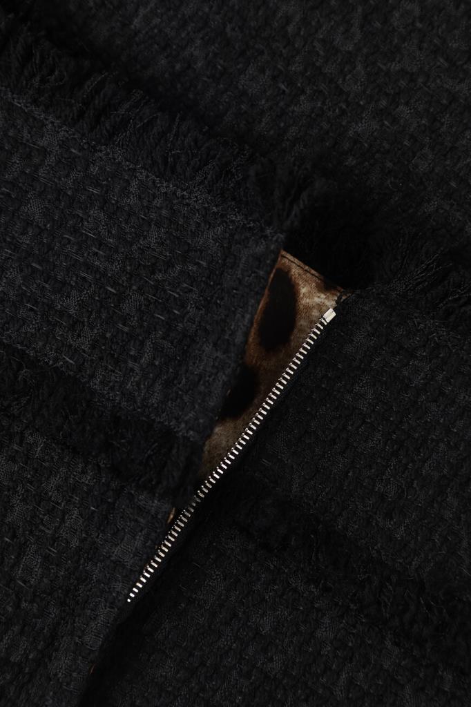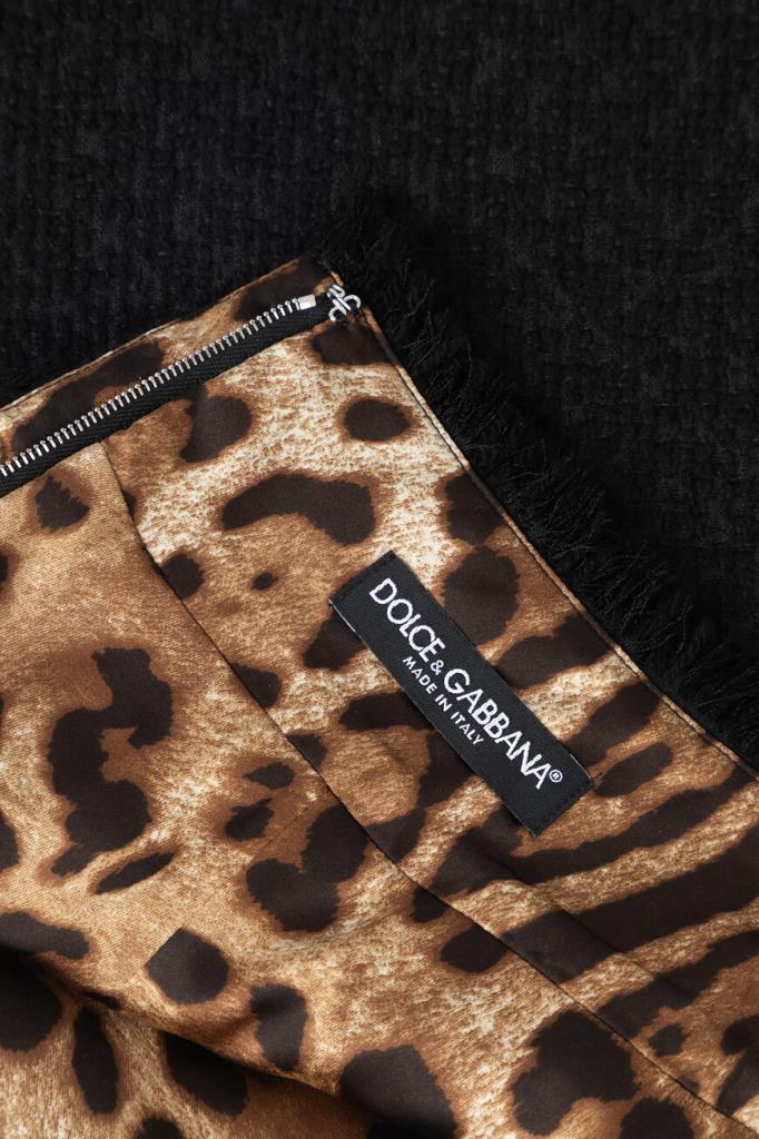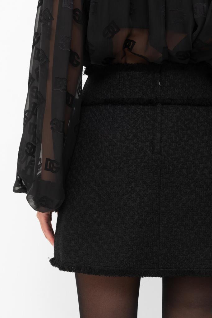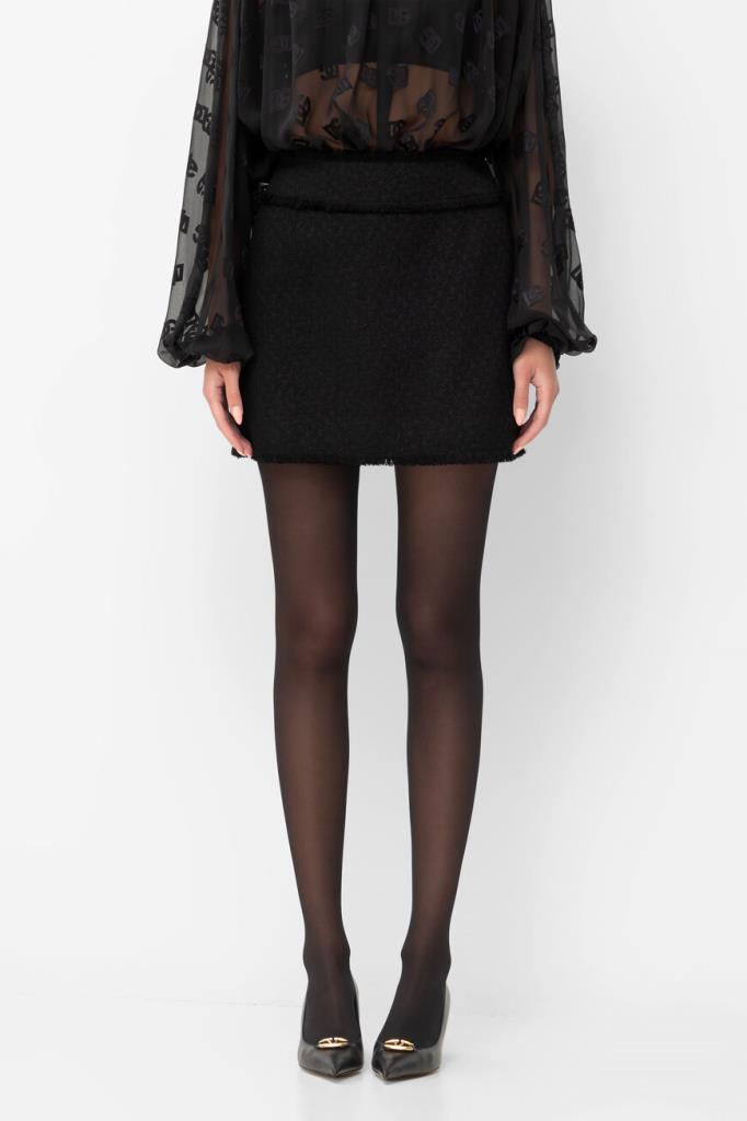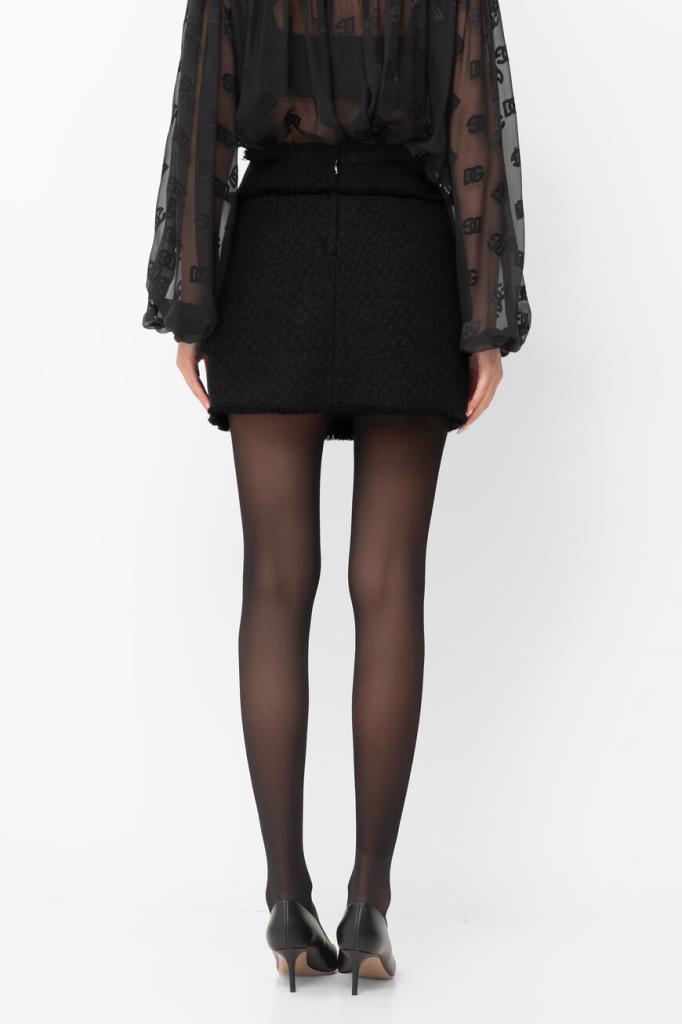 Мини-юбка из плотной фактурной ткани букле от Dolce & Gabbana. Для изготовления модели с высокой линией талии используются мягкая вирджинская шерсть, нейлон и прочное вискозное волокно чёрного цвета с отделкой бахромой. Подчеркните свою романтическую сторону, надев изделие с застёжкой на потайную молнию и крючок сзади с атласной блузой-топом Devoré из коллекции DNA.