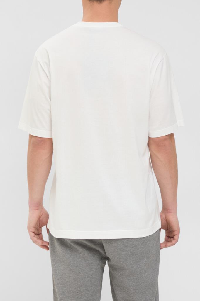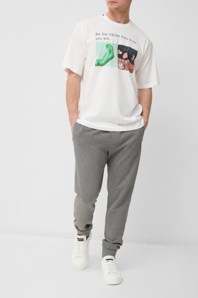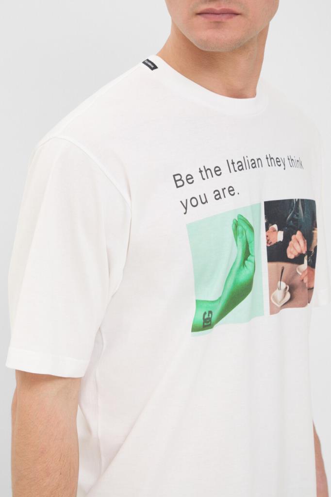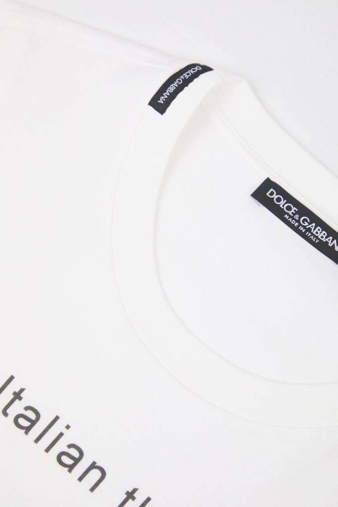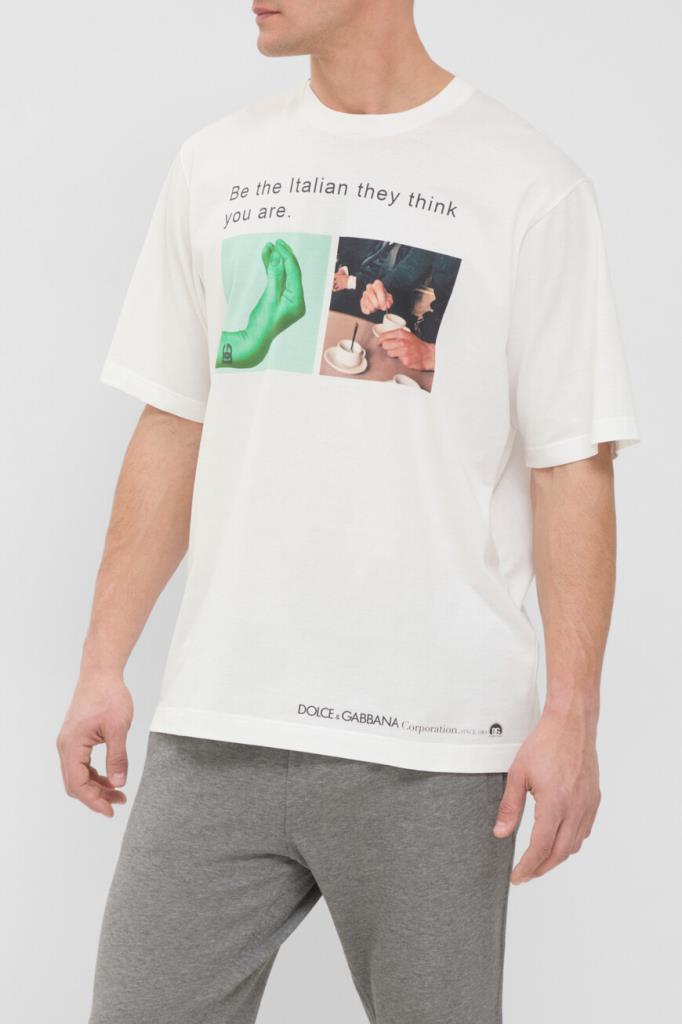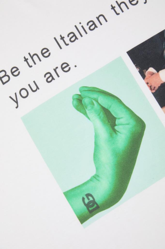 Белая футболка Dolce & Gabbana с крупным принтом в виде фотоколлажа. Коллекция Italian Holiday переосмысливает стиль 1950-х годов, сочетая свободный крой и современные тенденции. Для пошива изделия прямого силуэта выбрано мягкое хлопковое джерси. Принт с изображениями рук и чашек горячего кофе сопровождается контрастной надписью «Be the Italian they think you are» спереди сверху. Разница в расположении рисунка на этой модели делает каждую вещь уникальной.
