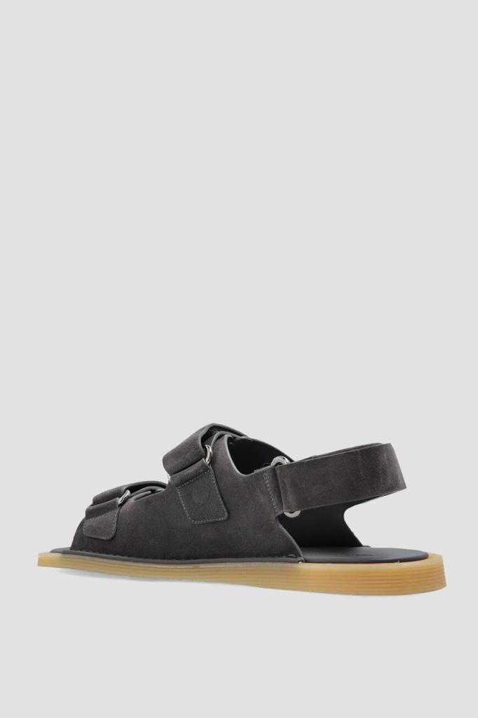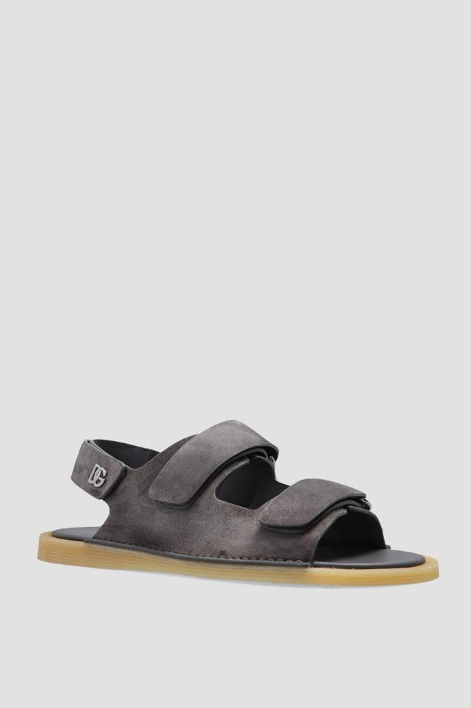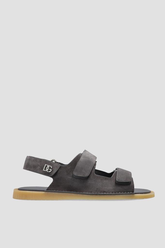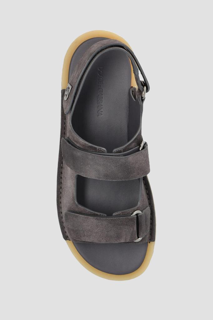 Тёмно-серые сандалии Dolce&Gabbana с широким мыском и задником на липучках. Для изготовления удобной пары выбрана мягкая замша с бархатистой текстурой. Модель на плоской резиновой подошве с небольшим утолщением в задней части характеризуется открытыми носком и задником и внутренней отделкой из гладкой телячьей кожи в тон.