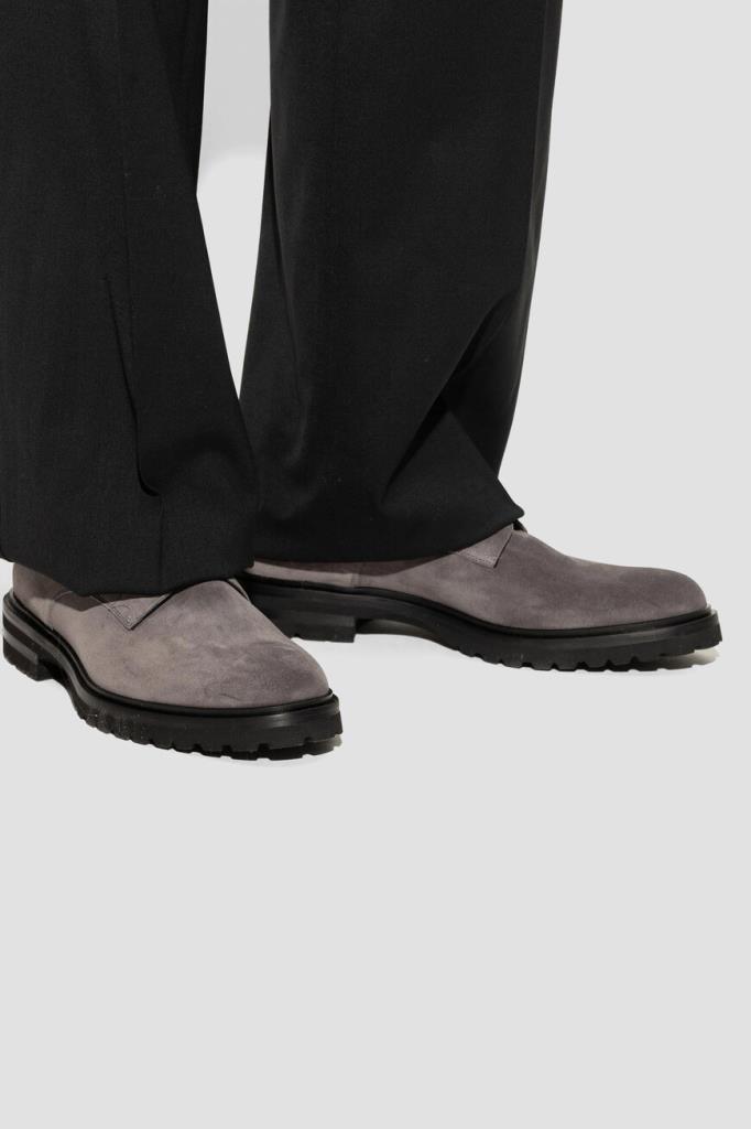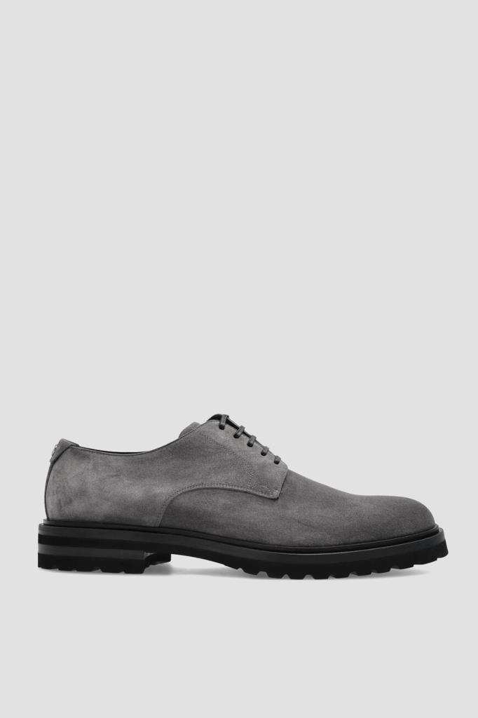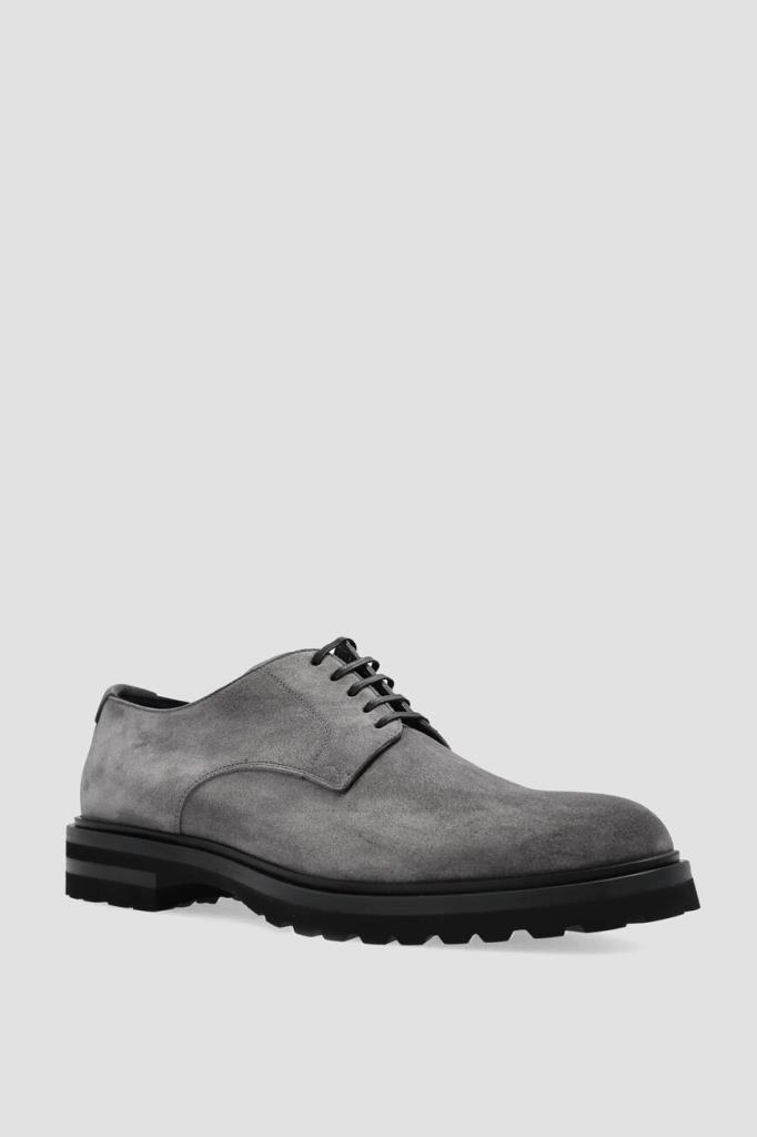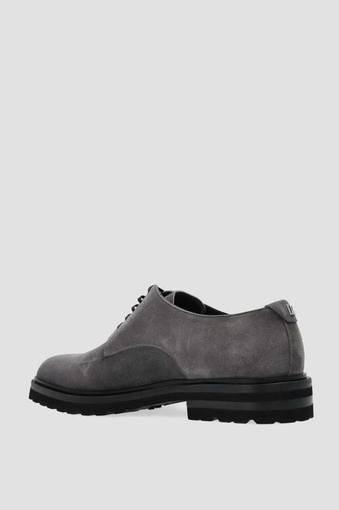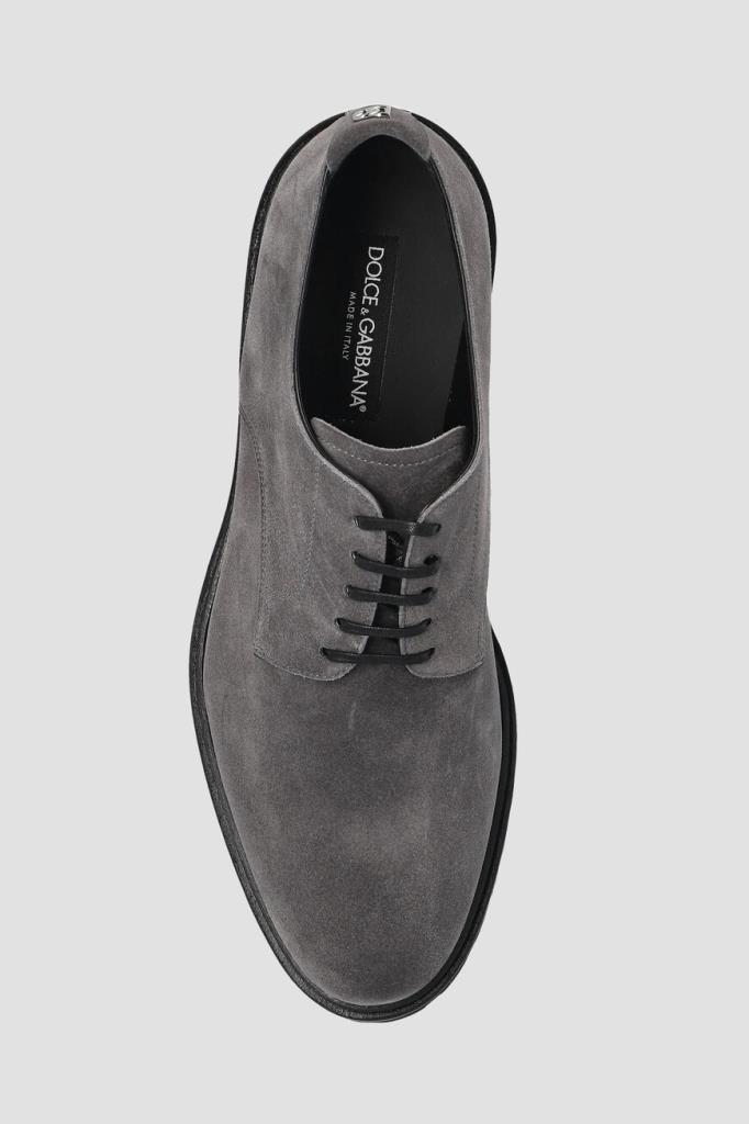 Серые дерби Dolce&Gabbana с бархатистой текстурой. Для изготовления удобной модели с широкой колодкой используется мягкая замша. Конструкция изделия предполагает традиционную открытую шнуровку и увеличенную двухцветную подошву с устойчивым каблуком и небольшим протектором для дополнительной устойчивости. Задник украшает вставка с монограммой Дома, выполненной из серебристого металла.