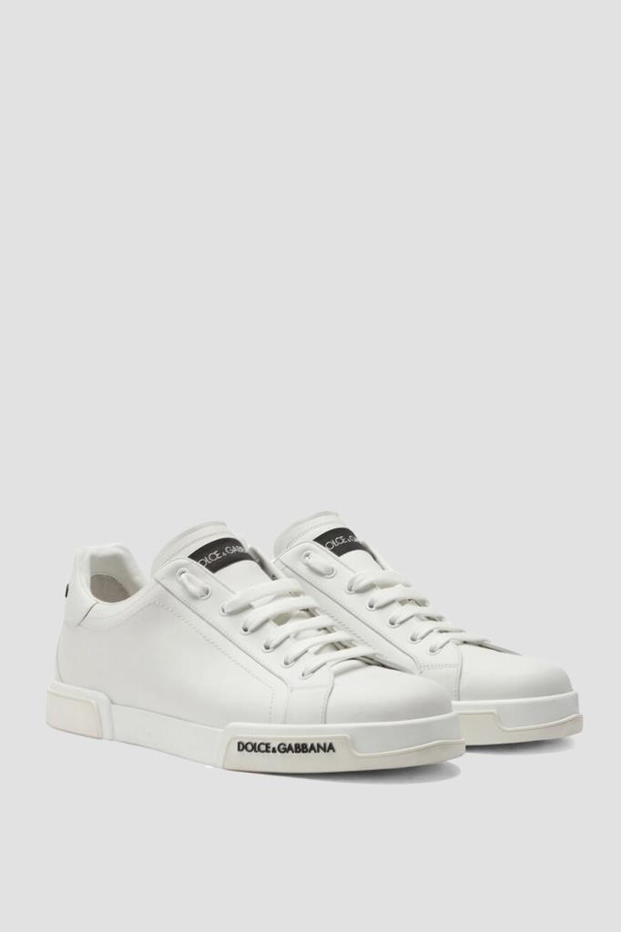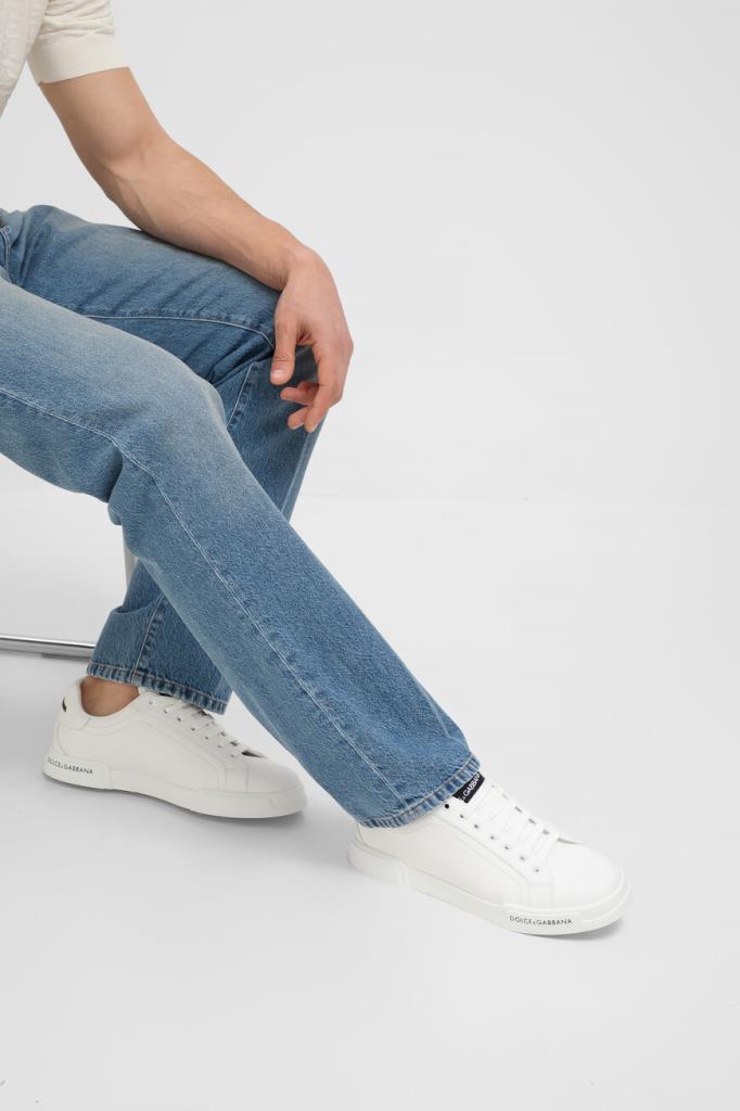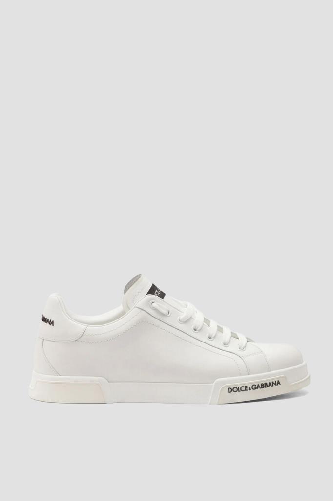 Cникеры Portofino из гладкой кожи наппа от Dolce & Gabbana. Конструкция изделия белого цвета предполагает наличие открытого типа шнуровки и плоской широкой подошвы из натуральной резины с фигурными вставками спереди и в задней части и рифлением снизу. Атрибутами Дома являются контрастные прямоугольный лейбл на двухслойном язычке и рельефные надписи-лого, изготовленные методом инжекционного микролитья, сзади и сбоку на подошве. Пара станет удачным завершением практически любого повседневного образа с джинсами или чиносами.