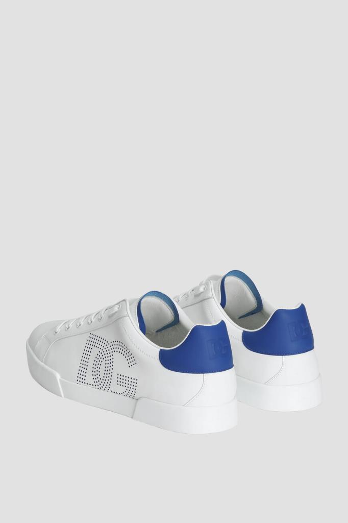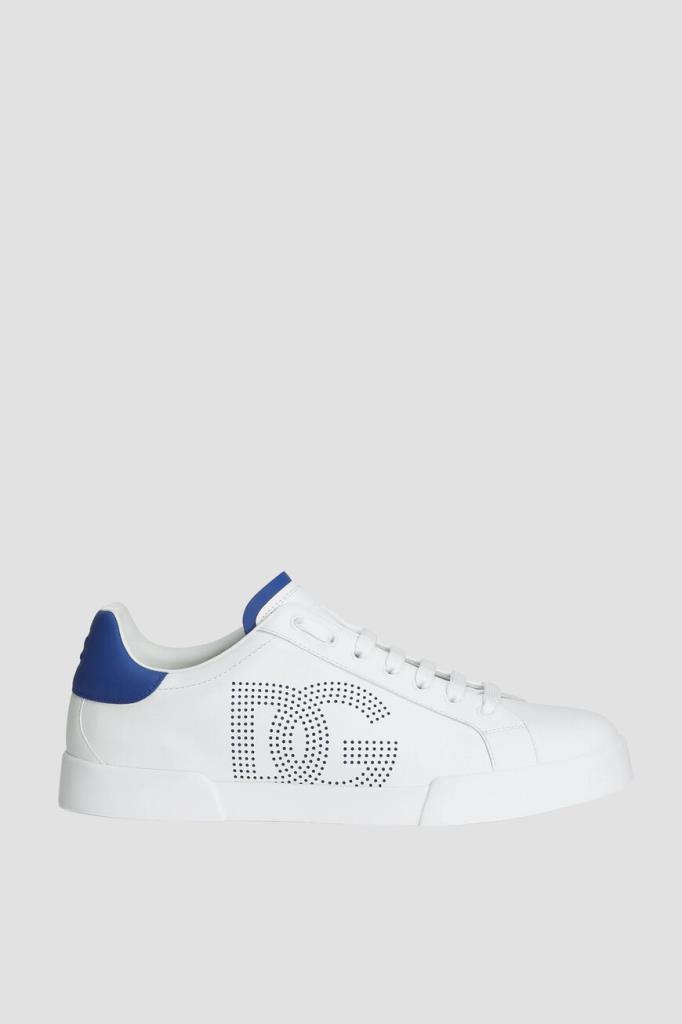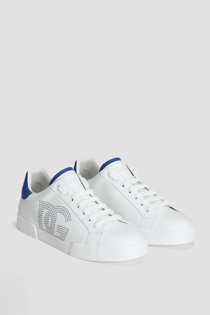 Кожаные сникеры Strobel Portofino Light от DOLCE & GABBANA. Изделие белого базового цвета характеризуется наличием синих вставок на язычке и заднике и перфорацией в виде крупного перекрёстного лого-монограммы Дома на боковинах. Для оптимальной посадки модели на ноге предусмотрен открытый тип шнуровки. Отличительными деталями также являются тиснёный логотип спереди в тон и монограмма в задней части.