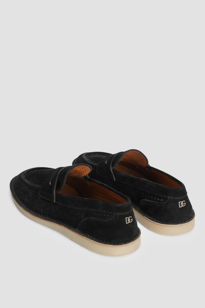 Лоферы New Florio от Dolce&Gabbana из бархатистой перфорированной замши. Удобная пара окрашена в чёрный базовый оттенок и установлена на плоскую резиновую подошву с небольшим утолщением в задней части. Классическая модель интересна широким поперечным ремешком с прорезью на союзке и минималистичной знаковой символикой Дома - перекрёстным лого-монограммой на заднике.