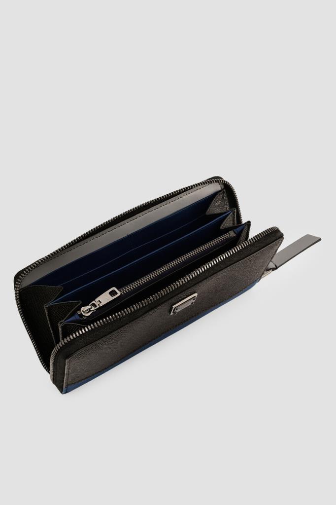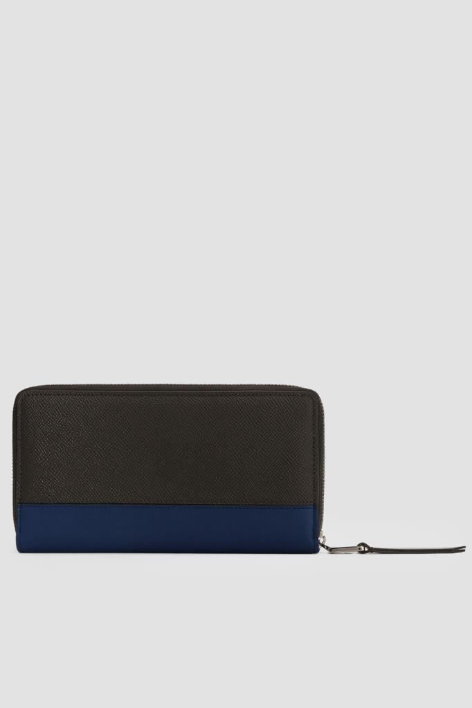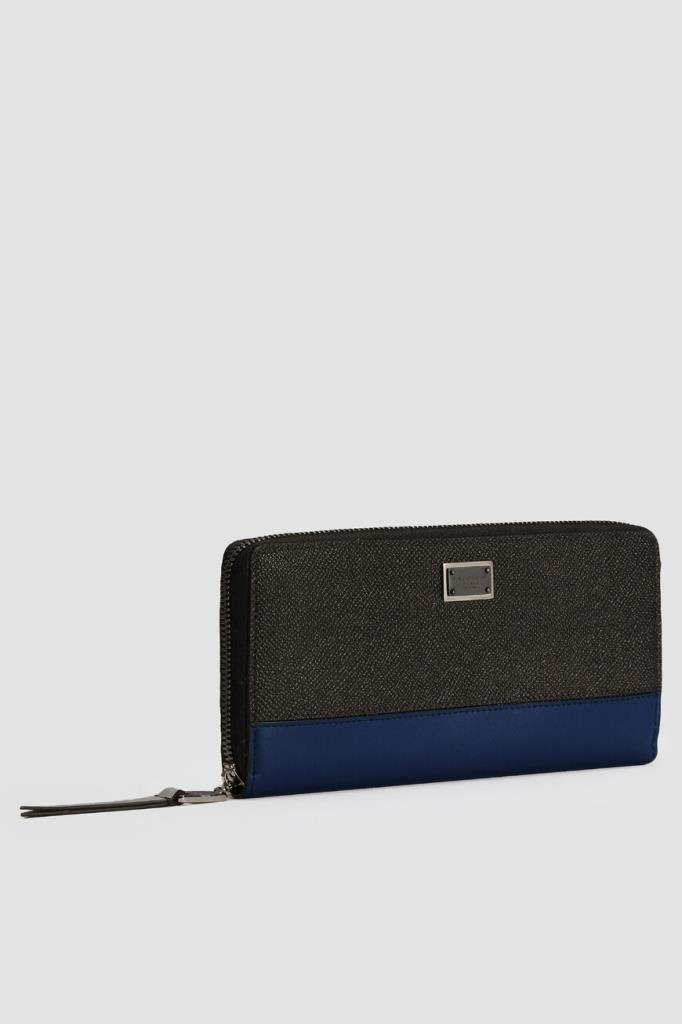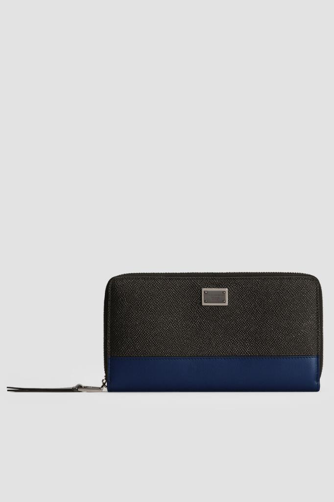 Прямоугольное портмоне Dolce&Gabbana на круговой молнии с кожаным пуллером. Для создания комбинированного аксессуара используются матовая кожа телёнка чёрного цвета с тиснением Dauphine и гладкая телячья кожа тёмно-синего и серого оттенков на вставках. Декором выступает прямоугольный лейбл с гравировкой Дома и двумя видами гальванического покрытия на лицевой стенке.