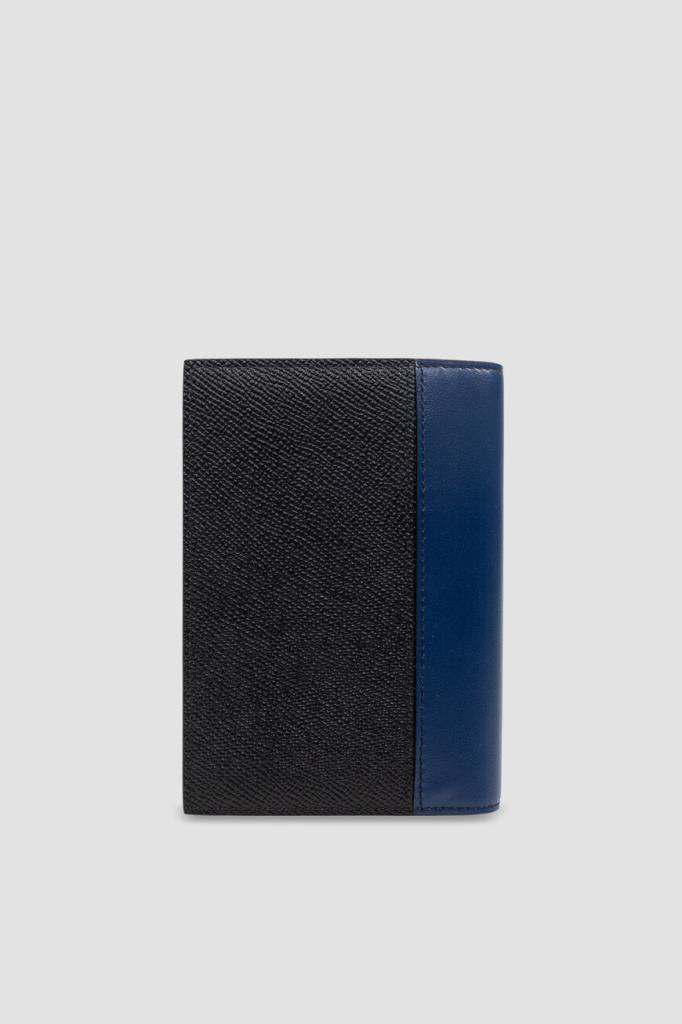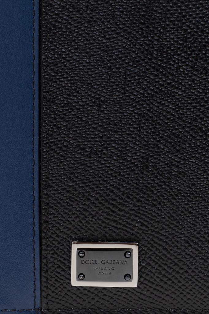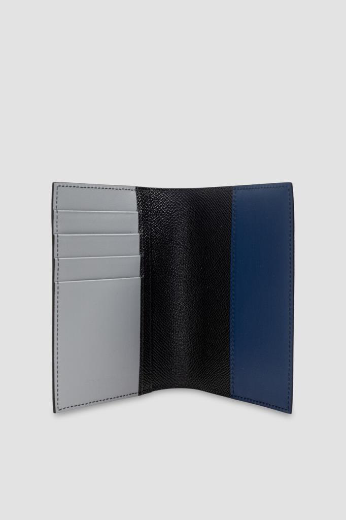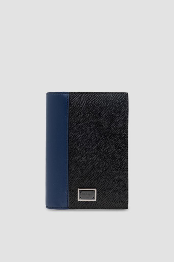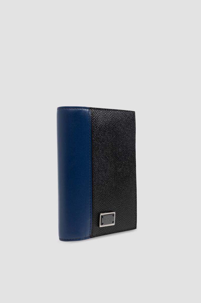 Кожаная обложка для паспорта от Dolce&Gabbana. Для изготовления изделия прямоугольной формы выбраны чёрная матовая кожа телёнка с тиснением Dauphine и гладкая телячья кожа тёмно-синего и серого оттенков на сгибе и вставках во внутренней части. Практичный аксессуар оснащён двумя открытыми карманами для лёгкого доступа к документу и дополнен четырьмя внутренними слотами для кредитных карт и двумя плоскими боковыми отсеками.