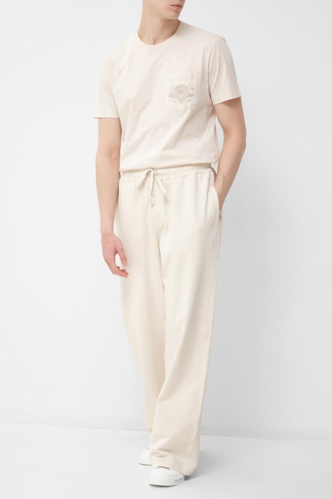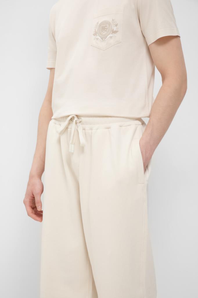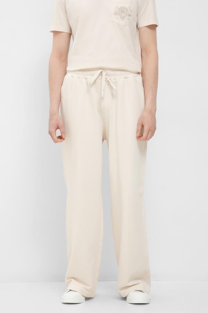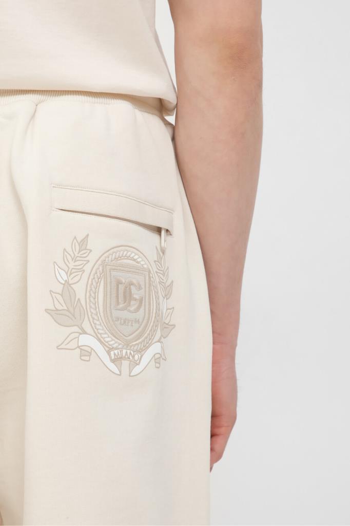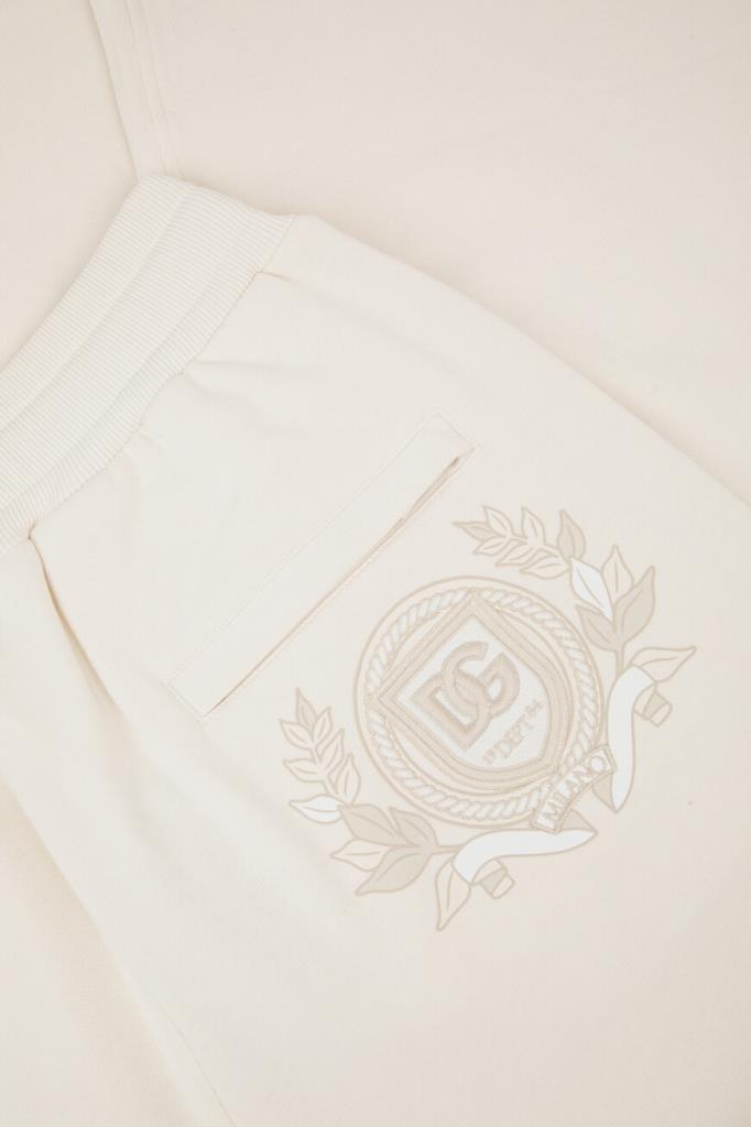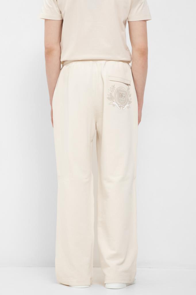 Спортивные брюки кремового оттенка от Dolce&Gabbana. Коллекция DNA переосмысливает повседневную одежду с помощью тщательно продуманных деталей и инновационных силуэтов. Для изготовления модели свободного кроя используется мягкий хлопковый трикотаж. Широкий эластичный пояс-кулиска обеспечивает комфорт и оптимальную посадку изделия по линии талии. Декором выступает геральдическая эмблема с вышитой лого-монограммой Дома на правом заднем кармане.