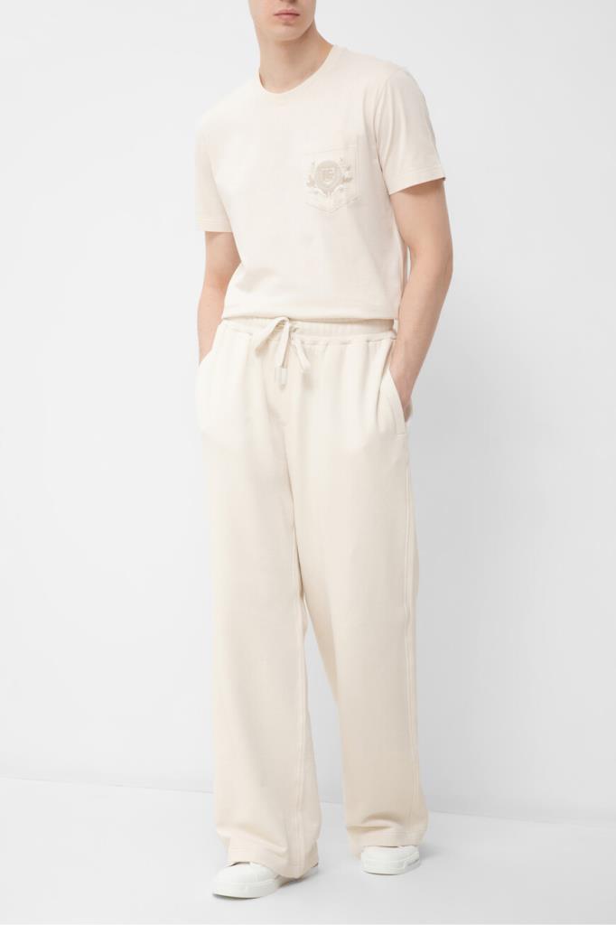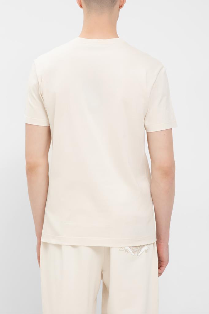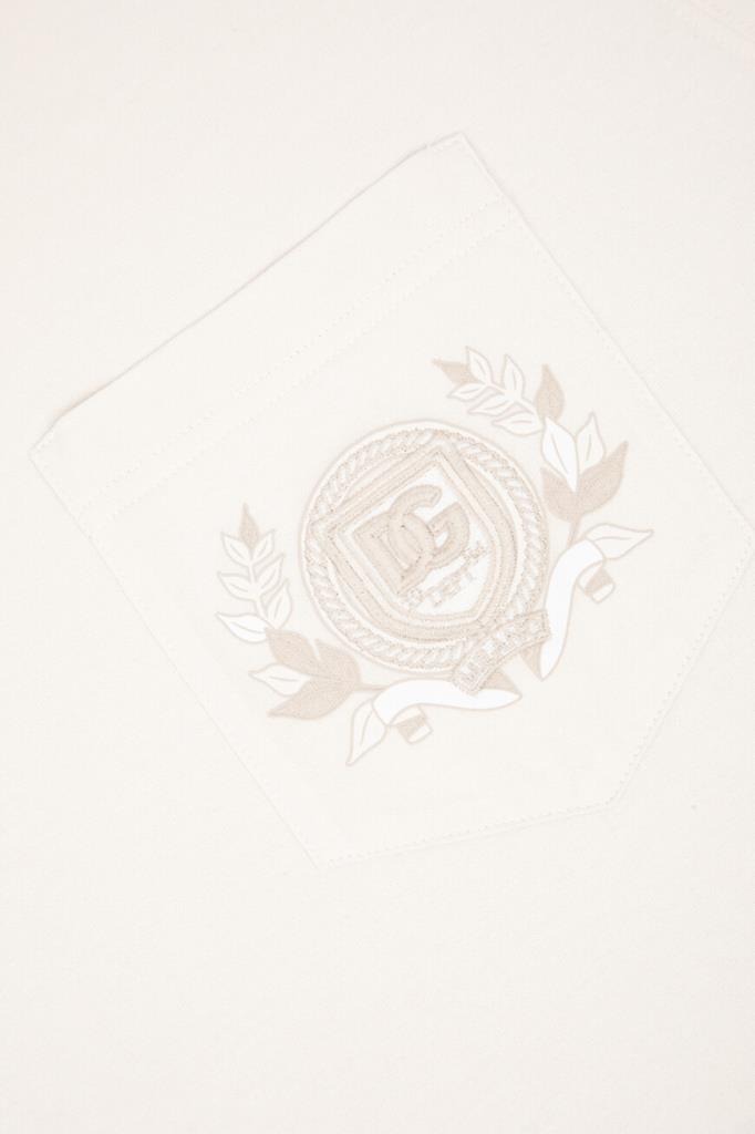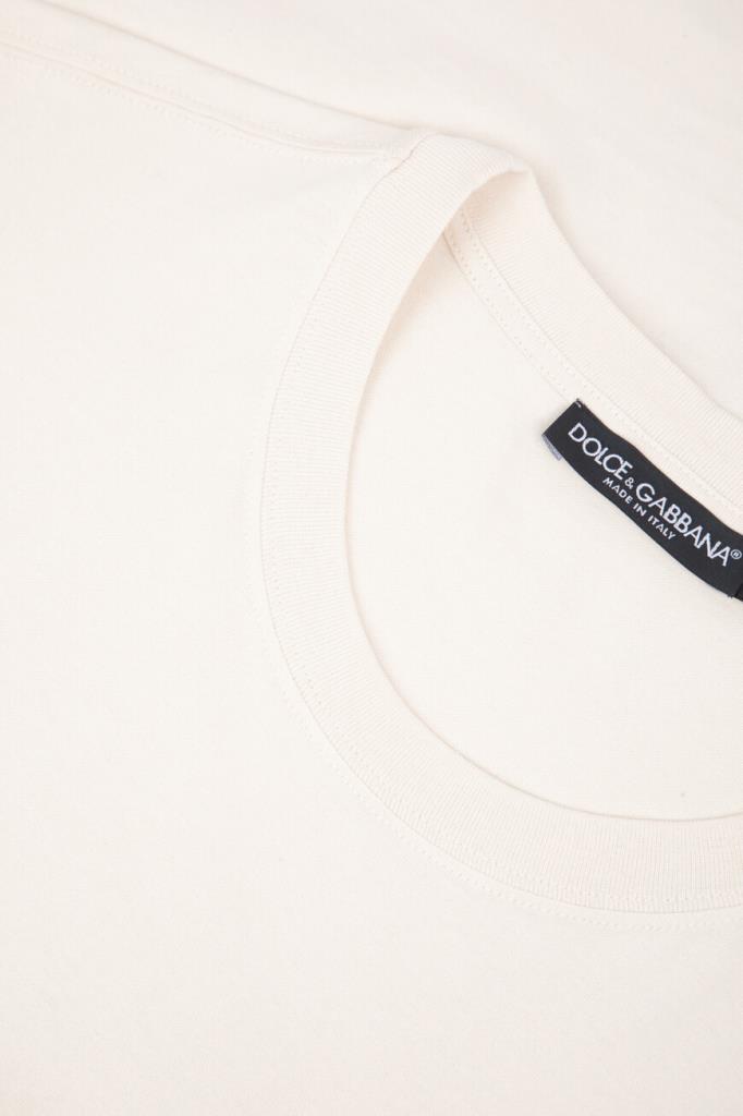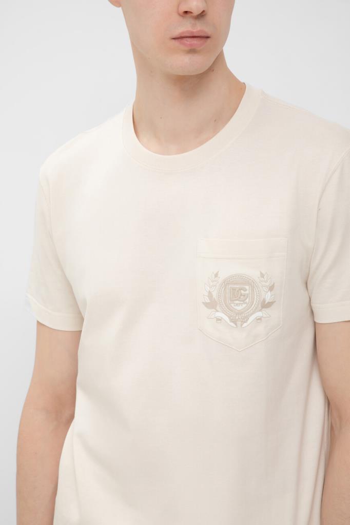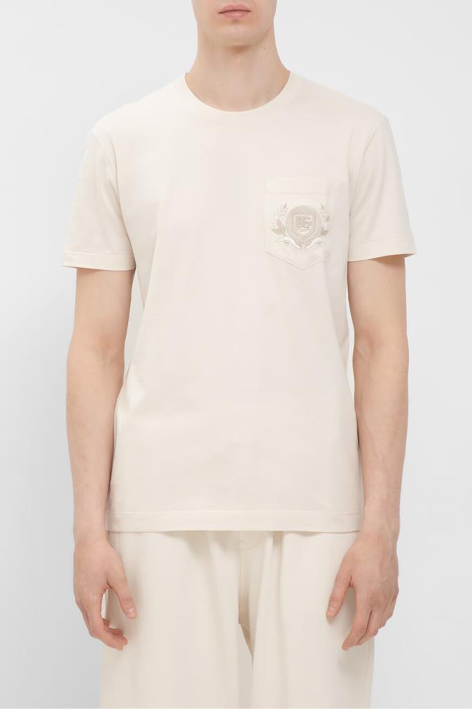 Кремовая футболка из коллекции DNA от Dolce & Gabbana. Коллекция переосмысливает повседневную одежду с помощью знаковых деталей и инновационных силуэтов. Для изготовления модели с нагрудным накладным карманом слева выбрано мягкое хлопковое джерси. О принадлежности изделия Дому напоминает крупная дизайнерская вышивка в виде эмблемы с лого-монограммой, обрамлённой лавровым венком.
