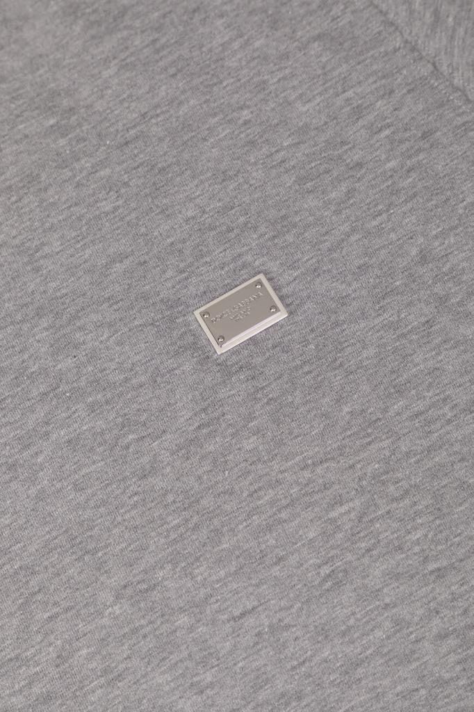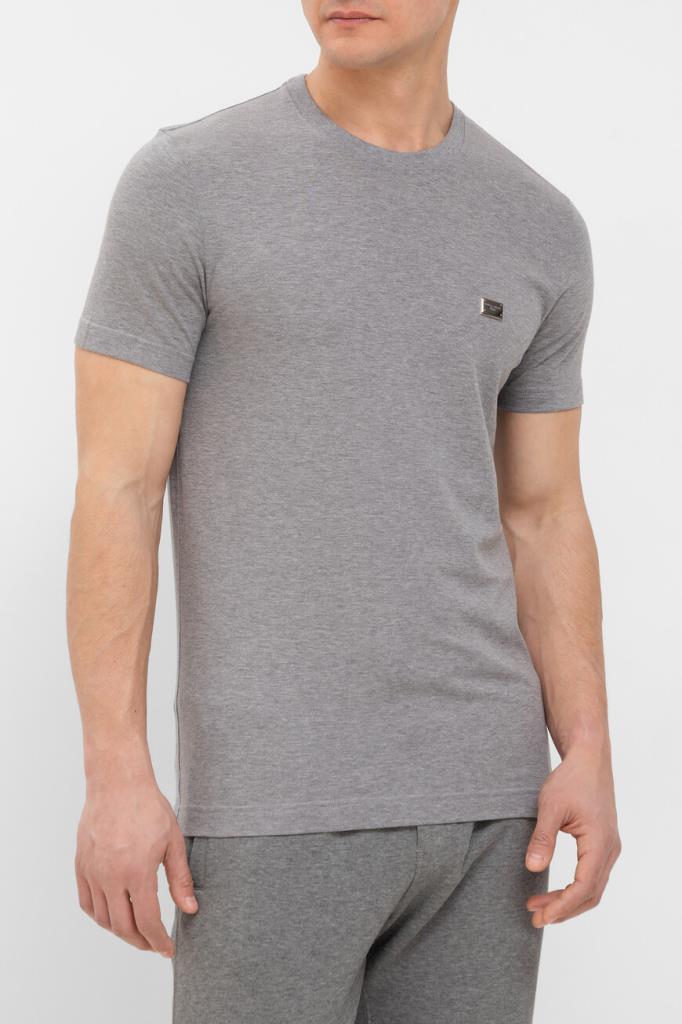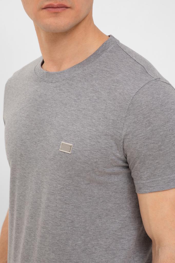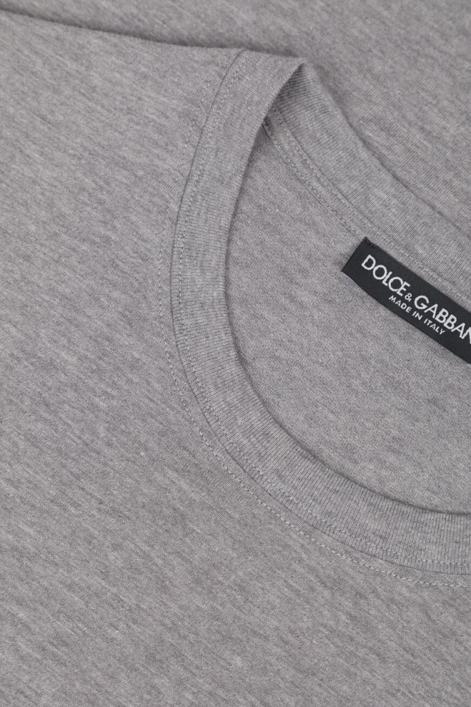 Меланжевая футболка Dolce & Gabbana из эксклюзивной коллекции DNA. Модель изготовлена из мягкого хлопкового трикотажа серого цвета и украшена прямоугольным лейблом с гравировкой и рутениевым гальваническим покрытием. Изделие прямого силуэта комфортно садится по фигуре и является воплощением современной элегантности.