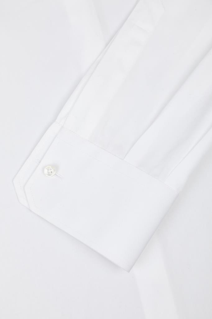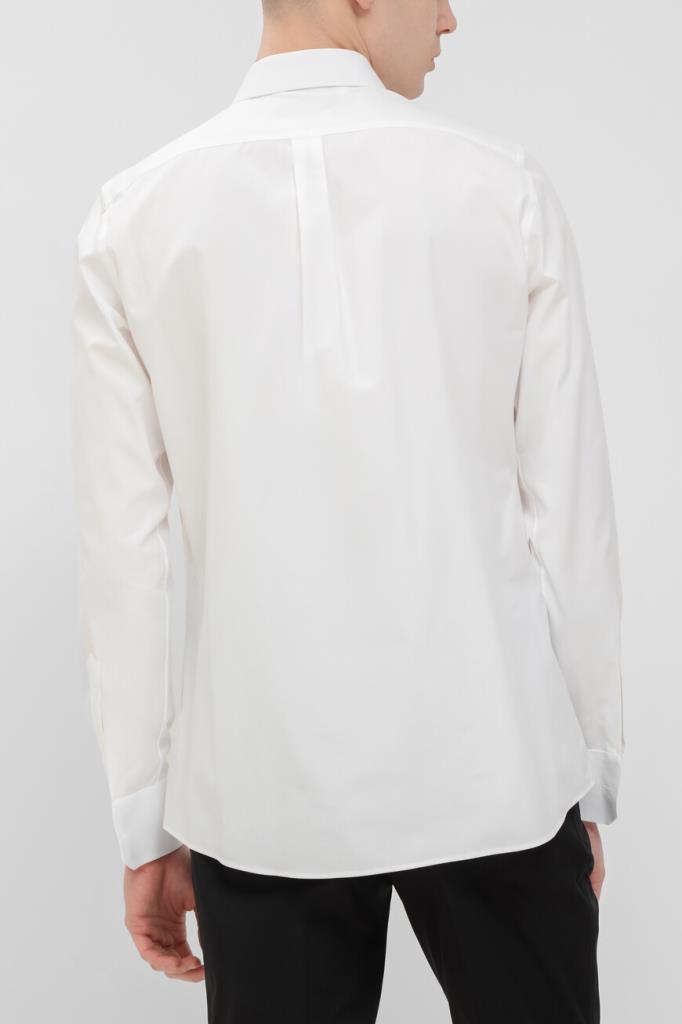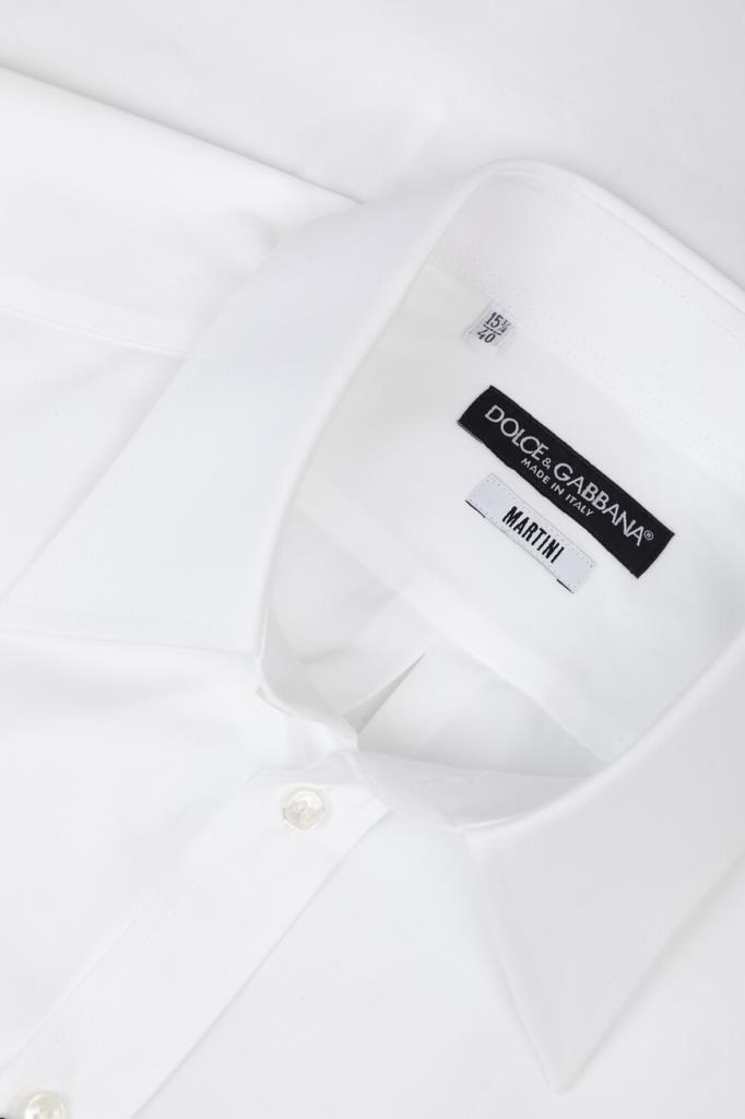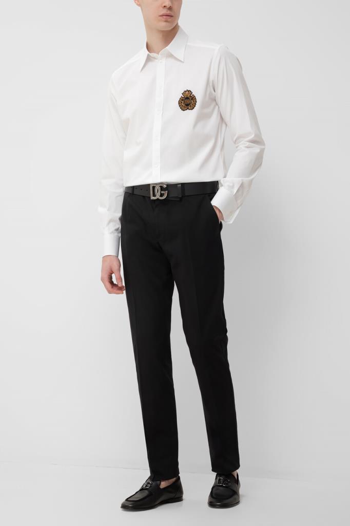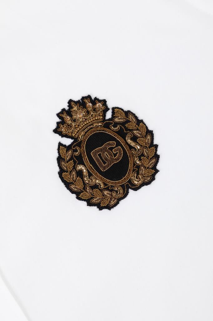 Белая рубашка Dolce & Gabbana из коллекции Italian Holiday. Коллекция переосмысливает стиль 1950-х годов, сочетая расслабленные силуэты и современную интерпретацию. Модель прямого кроя выполнена из мягкого хлопкового поплина с классической складкой сзади. Изделие с длинными рукавами интересно наличием крупной геральдической эмблемы, вышитой канителью и бисером, слева на груди и закруглённым низом.