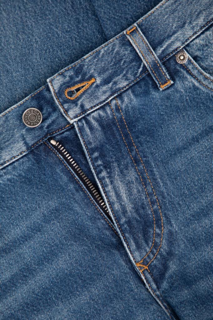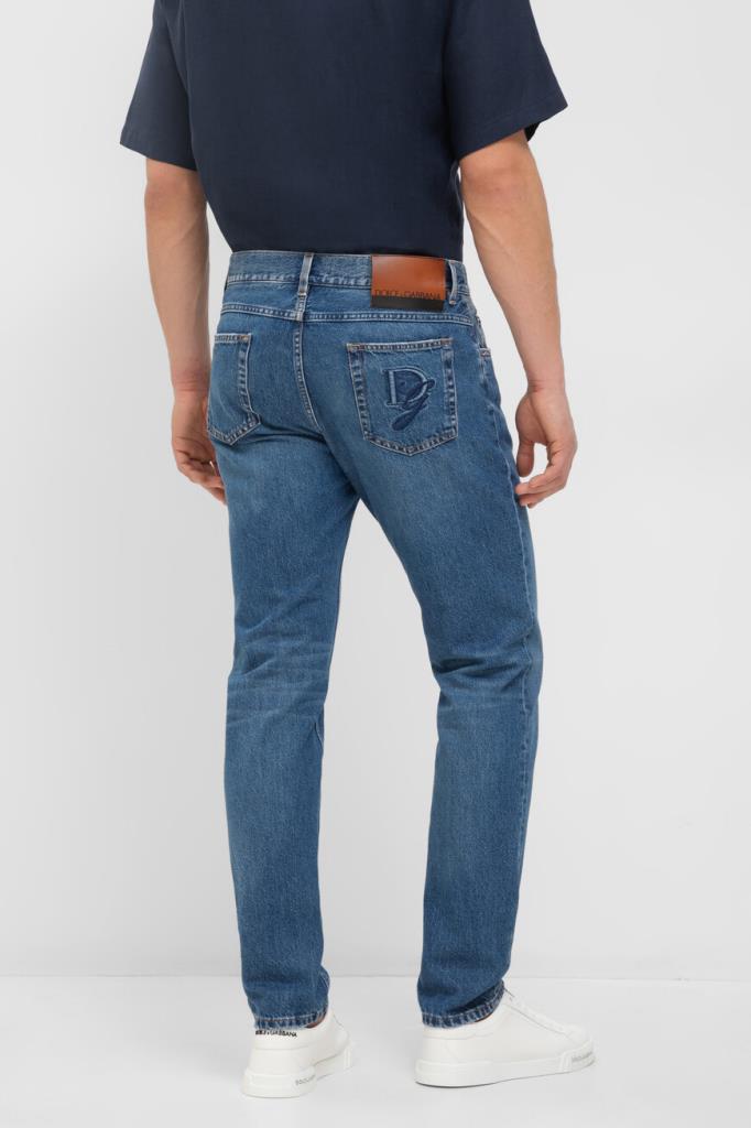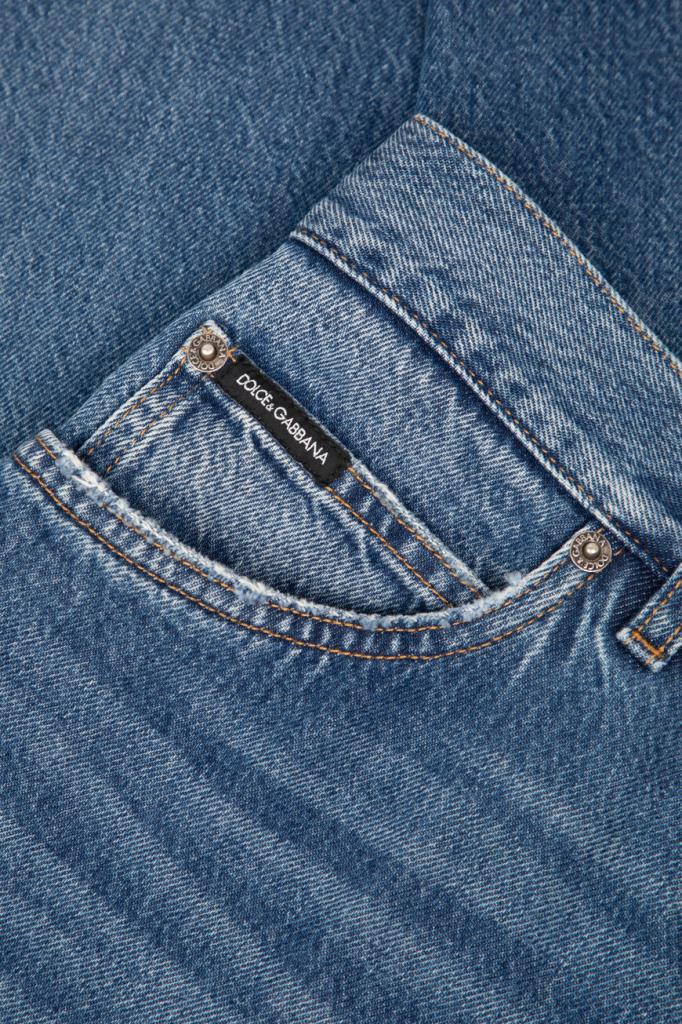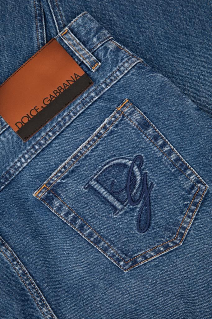 Хлопковые джинсы Dolce&Gabbana из коллекции Italian Holiday. Коллекция переосмысливает стиль 1950-х годов, сочетая расслабленные силуэты и современную интерпретацию. Модель выполнена из мягкого денима с эффектом делаве и дополнена оранжевой прострочкой на швах. Декором выступают двухцветная кожаная накладка с логотипом на поясе сзади, чёрно-белый лейбл с надписью-лого на маленьком кармане спереди и вышитая крупная монограмма Дома на правом заднем кармане.