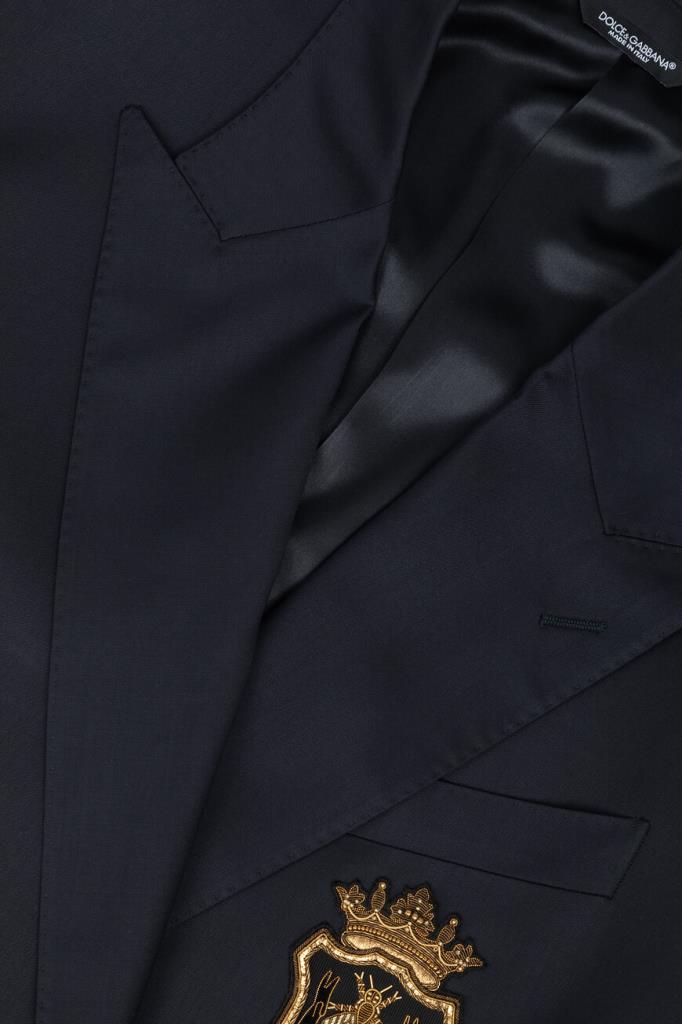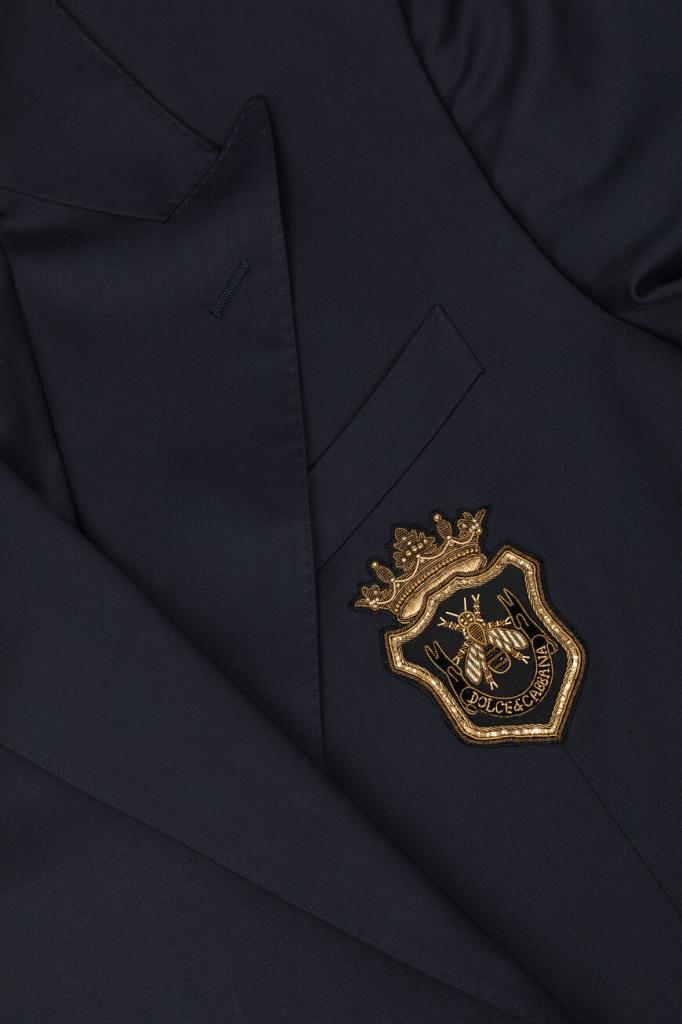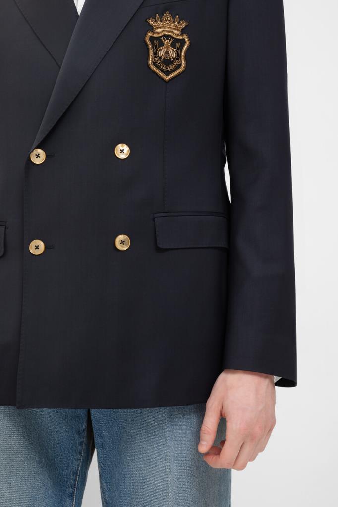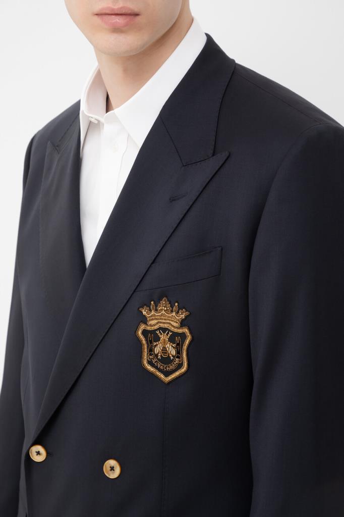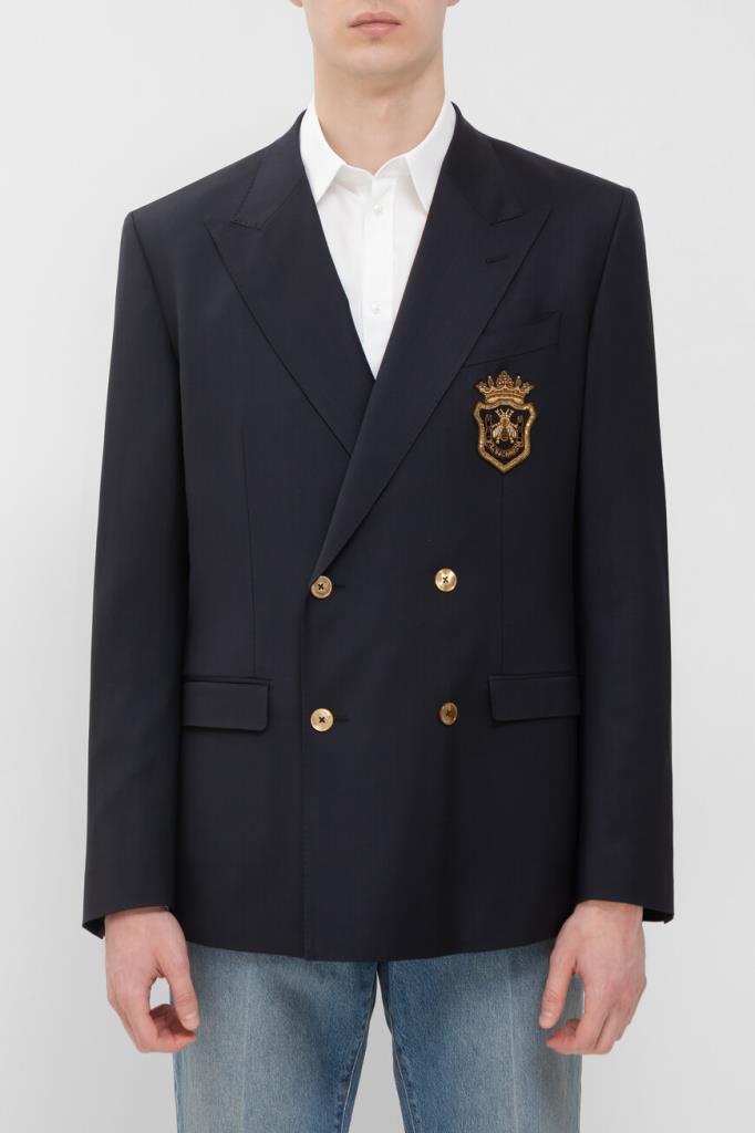 Свободный пиджак Dolce & Gabbana из коллекции Italian Holiday. Коллекция переосмысливает стиль 1950-х годов, сочетая расслабленные силуэты и современную интерпретацию. Двубортная модель изготовлена из мягкой вирджинской шерсти тёмно-синего цвета с добавлением эластичных волокон. Слева на груди расположена крупная геральдическая эмблема со знаковой символикой Дома, вышитая канителью и бисером.