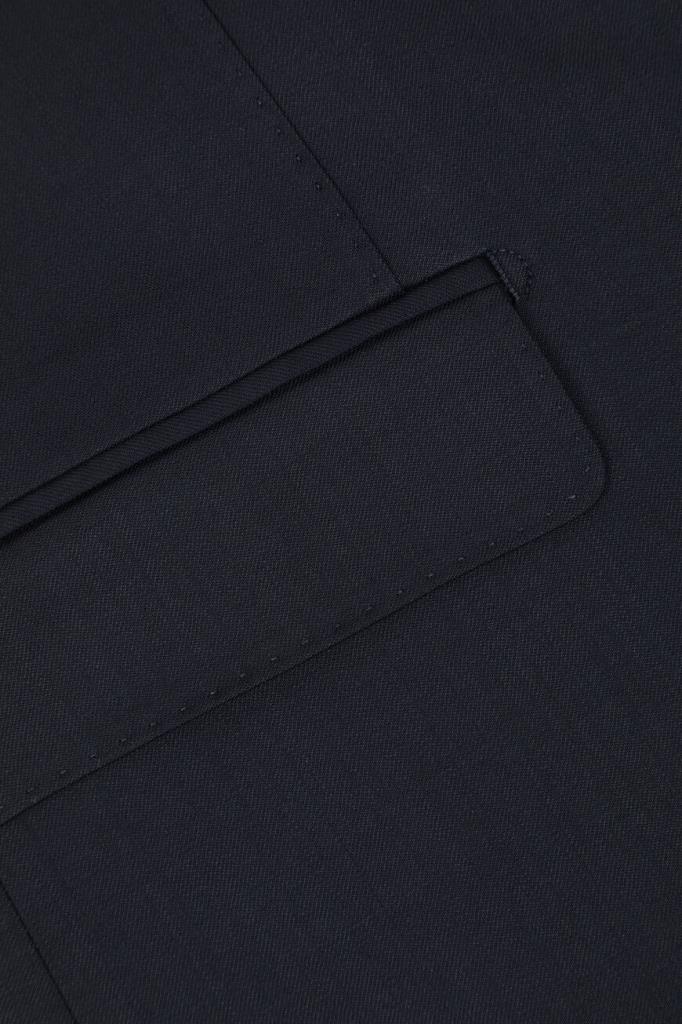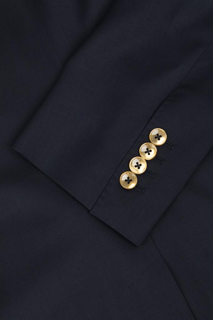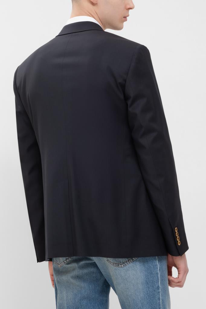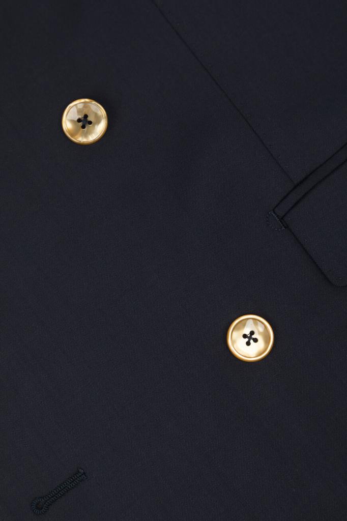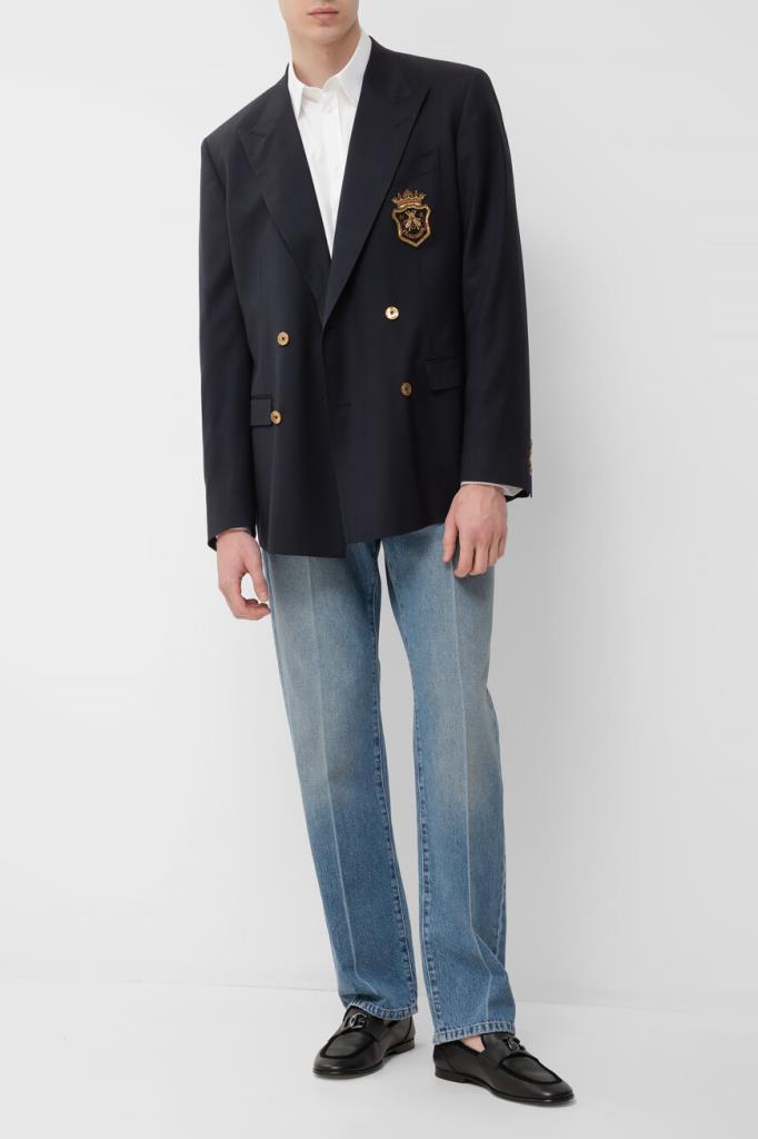 Свободный пиджак Dolce & Gabbana из коллекции Italian Holiday. Коллекция переосмысливает стиль 1950-х годов, сочетая расслабленные силуэты и современную интерпретацию. Двубортная модель изготовлена из мягкой вирджинской шерсти тёмно-синего цвета с добавлением эластичных волокон. Слева на груди расположена крупная геральдическая эмблема со знаковой символикой Дома, вышитая канителью и бисером.