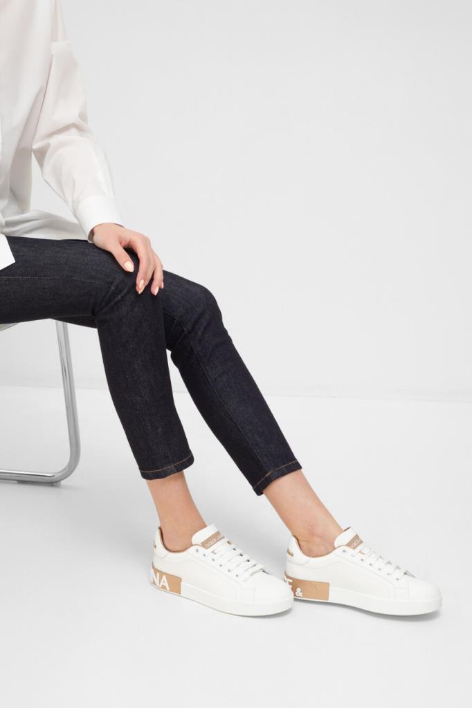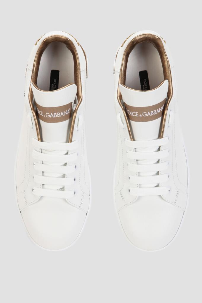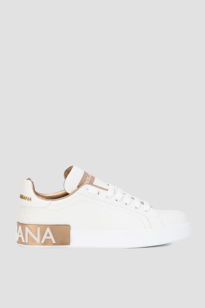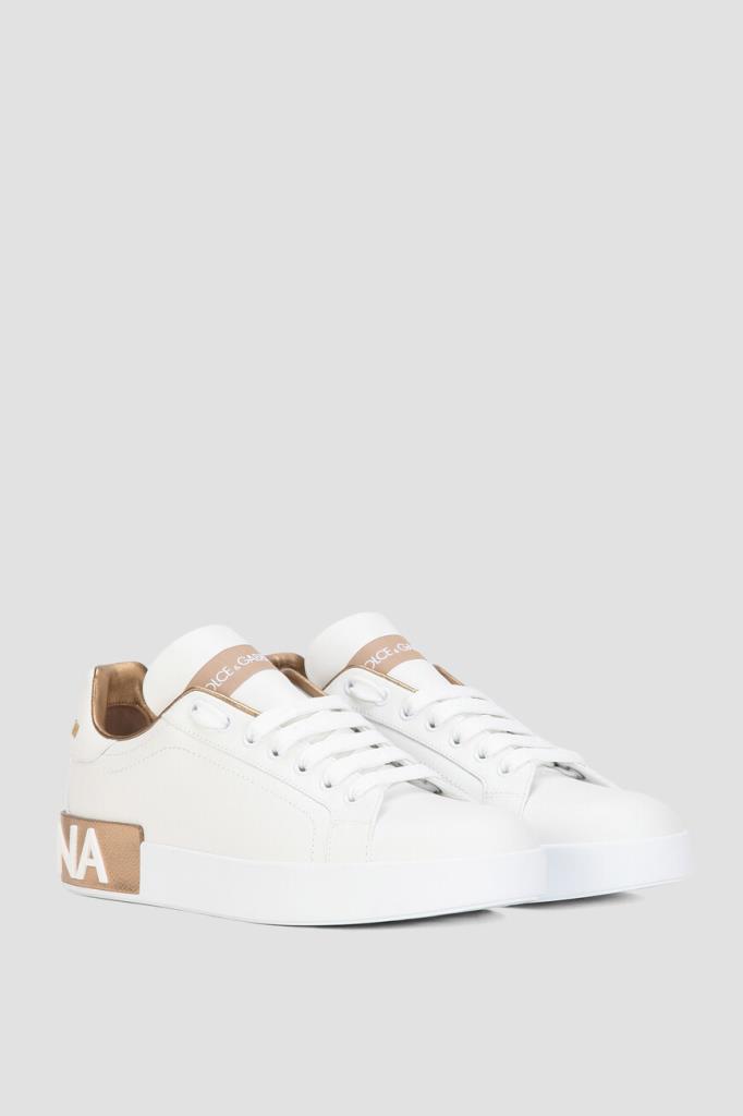 Сникеры DOLCE & GABBANA Portofino с золотистыми металлизированными деталями. Изделие выполнено из гладкой кожи наппа и установлено на плоскую резиновую подошву в тон с фирменным мотивом Baroque снизу. Принадлежность удобной пары Дому обозначена прямоугольной нашивкой с надписью-логотипом на язычке, крупным разделённым лого, нанесённый методом инжекционного микролитья, на заднике и рельефной надписью также в задней части.