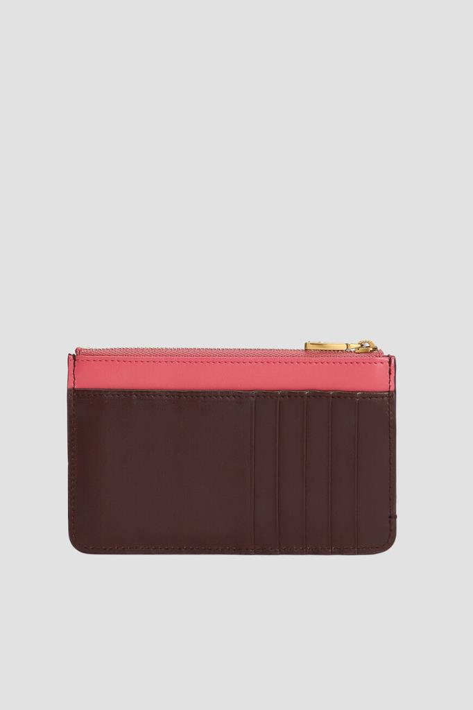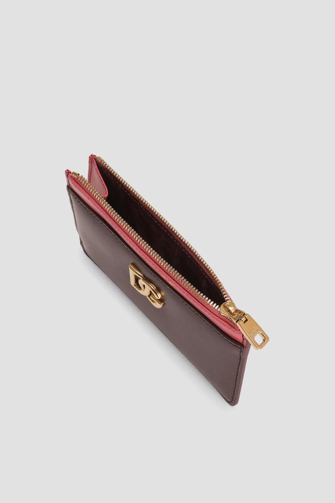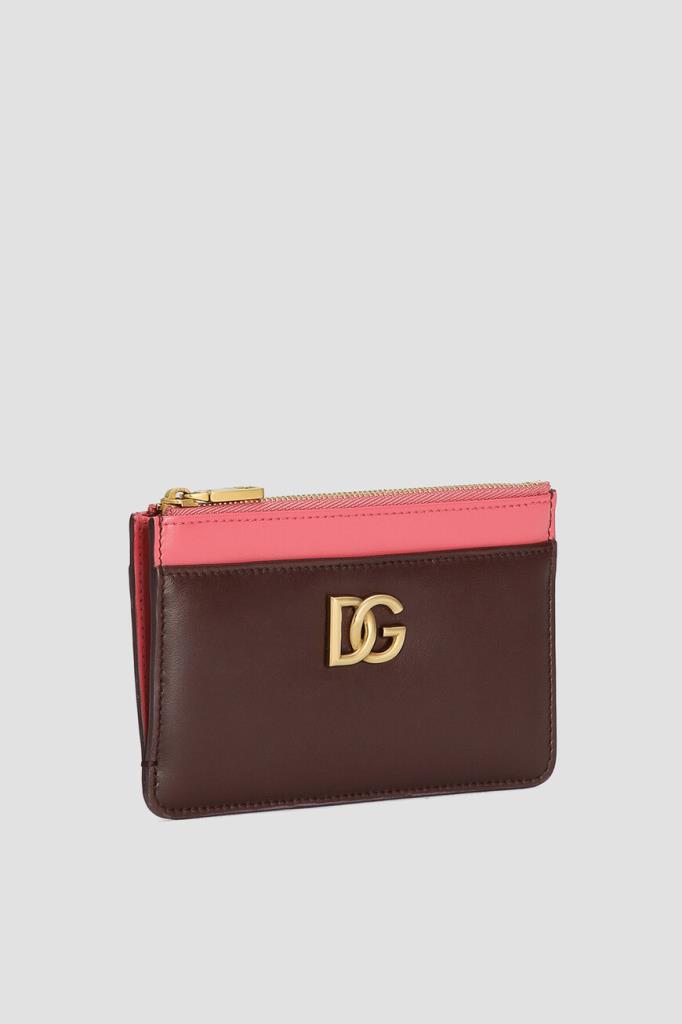 Прямоугольный кардхолдер Dolce & Gabbana со знаковой символикой Дома. Конструкция практичного аксессуара, выполненного из гладкой кожи телёнка розового оттенка и цвета бургунди, характеризуется наличием пяти слотов для пластиковых карт и практичного отделения «гармошкой» на молнии для монет в верхней части модели. Декором выступает крупный перекрёстный лого-монограмма из металла золотого оттенка на лицевой стенке.