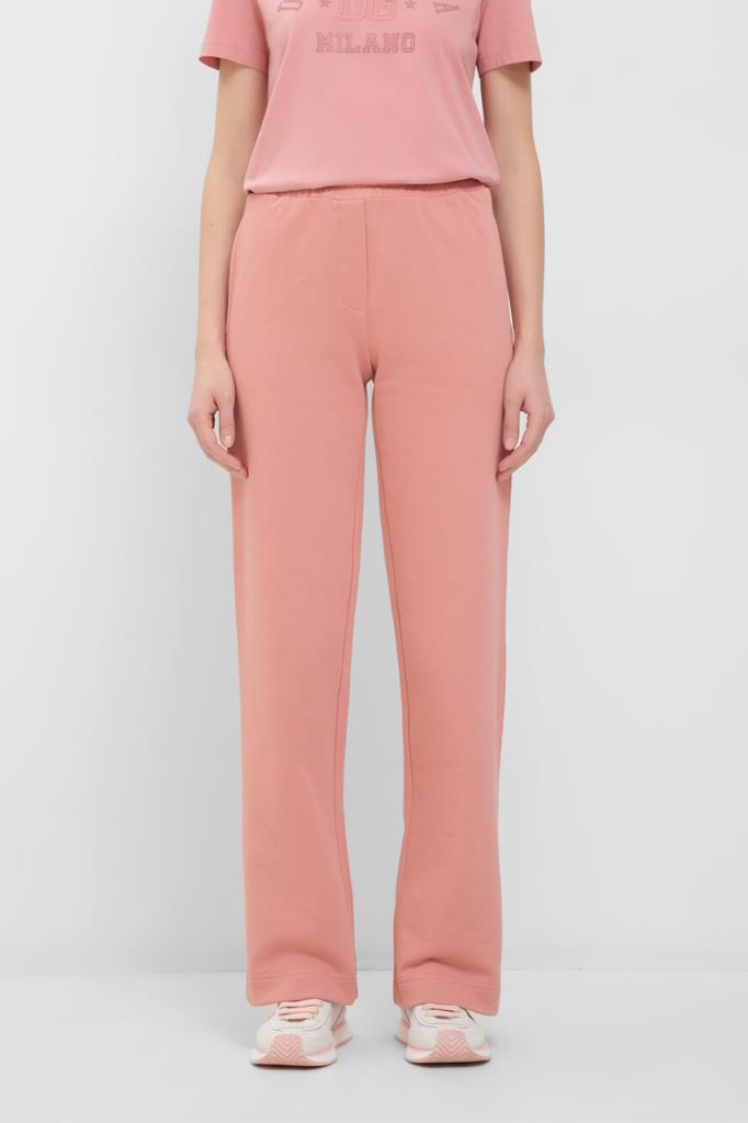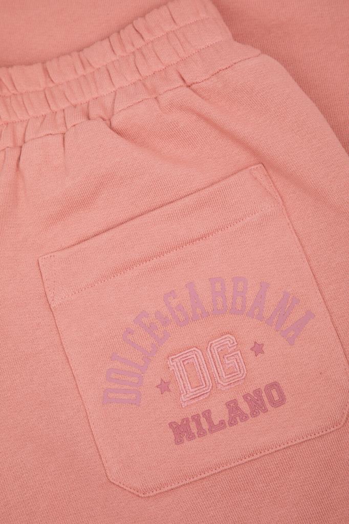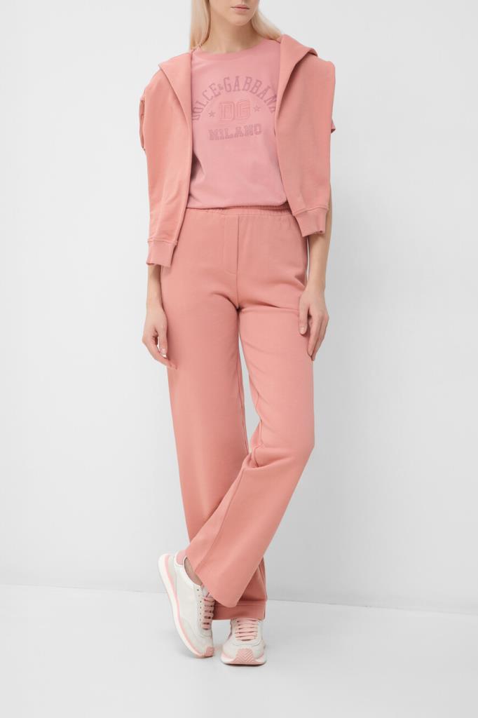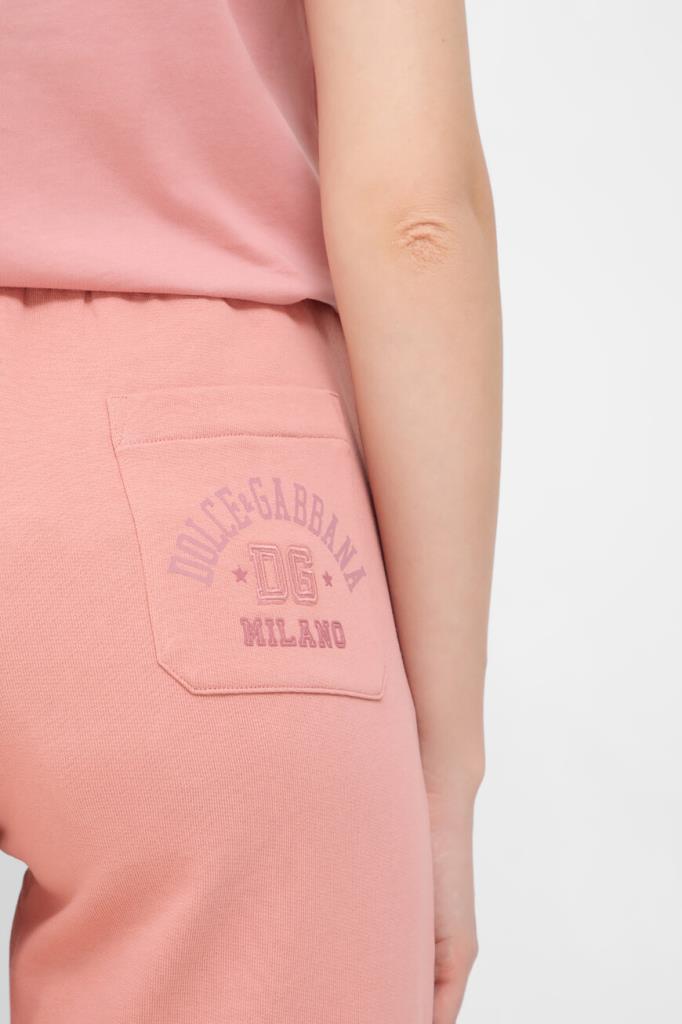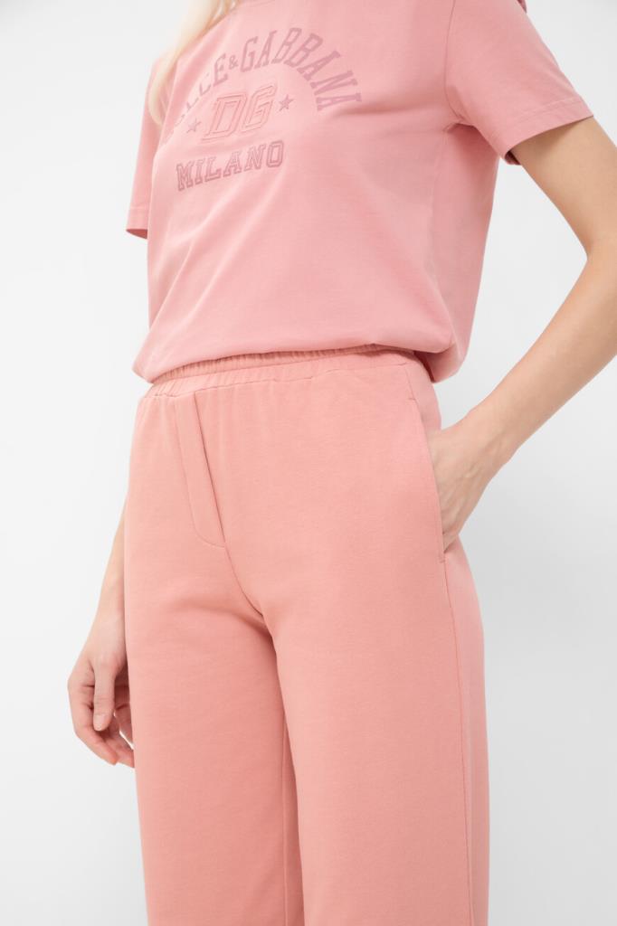Трикотажные спортивные брюки нежно-розового цвета от Dolce&Gabbana. Изделие выполнено из чистого хлопка и декорировано крупной культовой символикой - надписью-логотипом «Dolce&Gabbana Milano» и вышитой монограммой Дома на заднем кармане. Линию талии подчёркивает эластичный пояс-резинка, а прямой широкий крой обеспечивает свободу движений. Модель с тремя карманами сочетается с футболкой оверсайз в тон из той же коллекции.