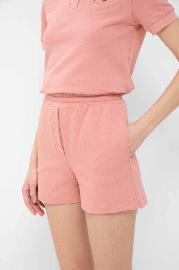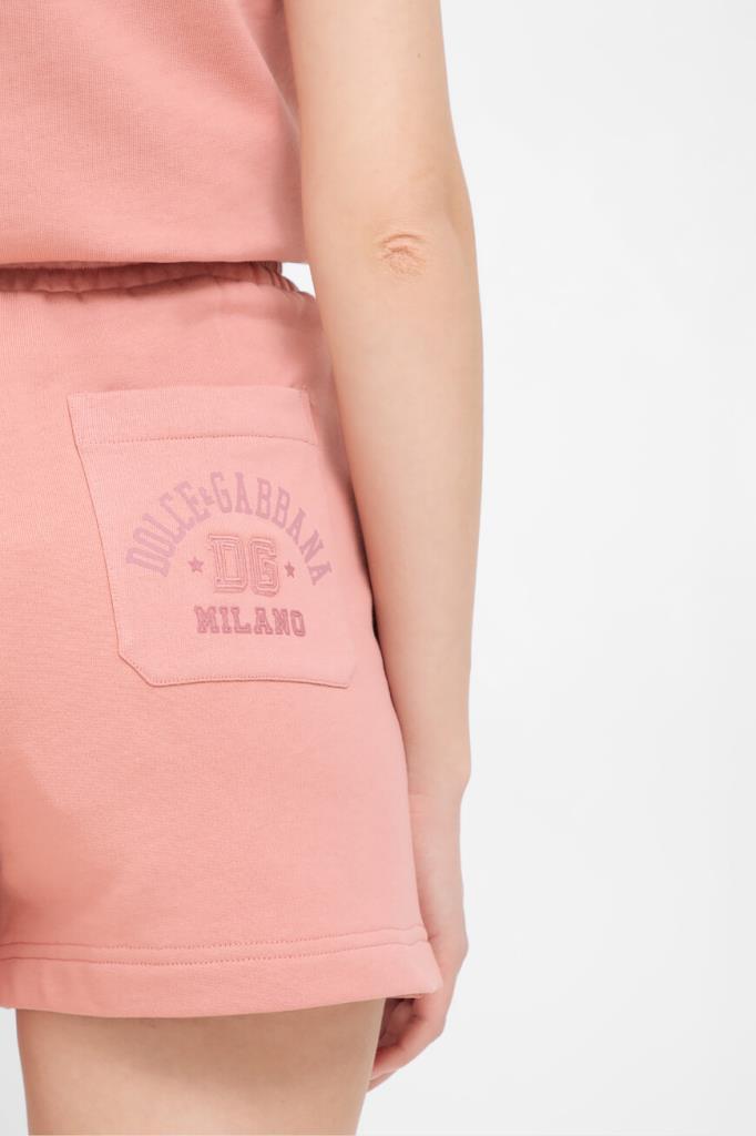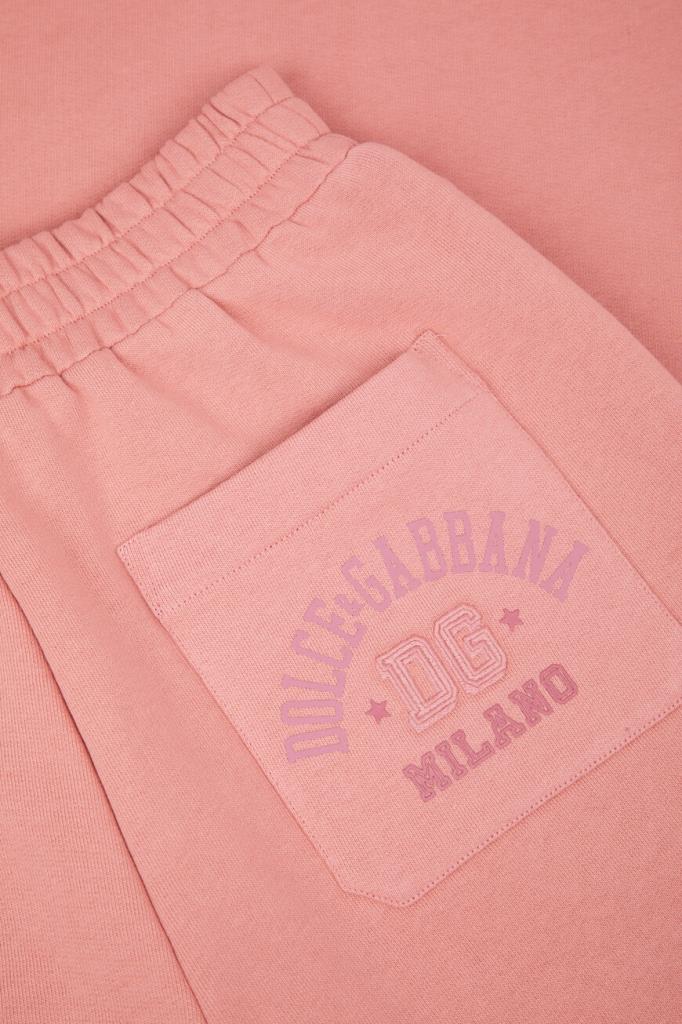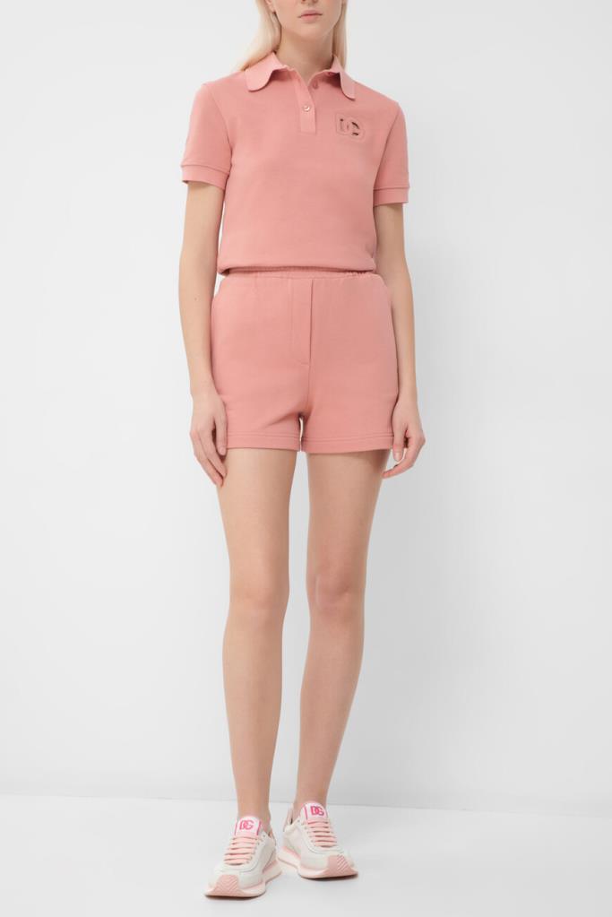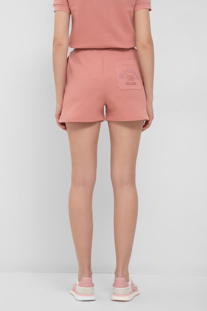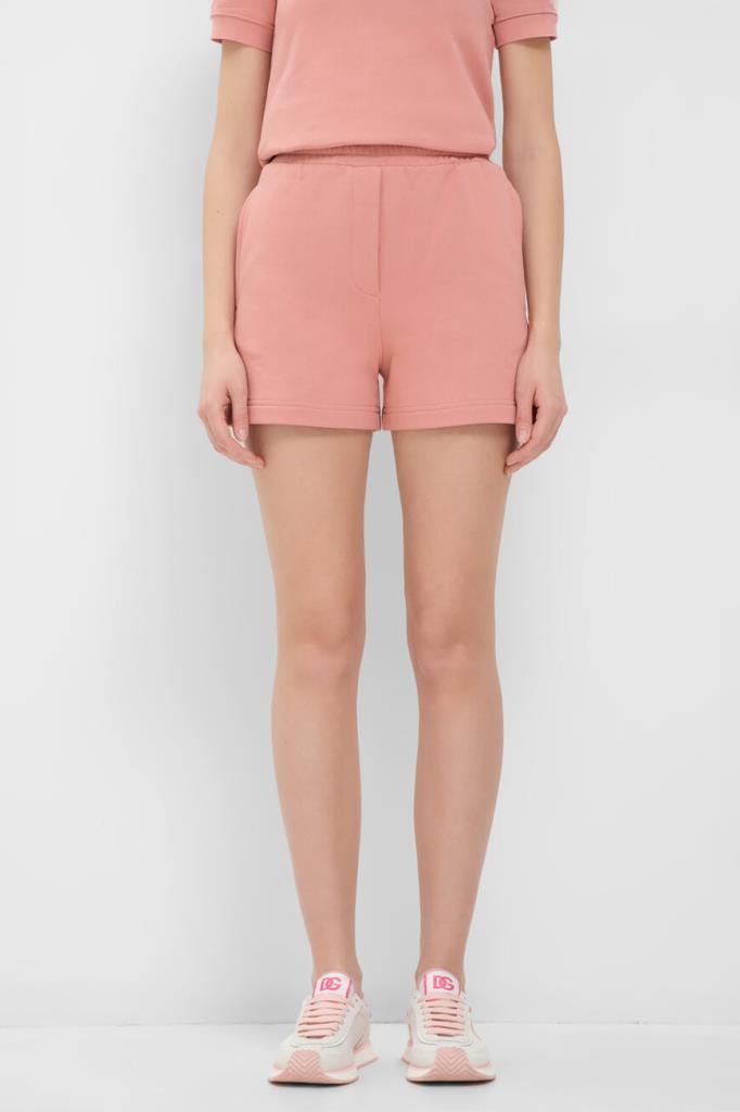 Бледно-розовые шорты в спортивном стиле от Dolce & Gabbana. Для изготовления модели прямого кроя выбран мягкий хлопковый трикотаж. Линию талии подчёркивает эластичный пояс на широкой резинке. Принадлежность изделия Дому обозначена крупными надписью-логотипом «Dolce&Gabbana Milano» и вышитой монограммой на заднем накладном кармане. Шорты будут смотреться выигрышно в тандеме с прилегающей футболкой из той же коллекции.