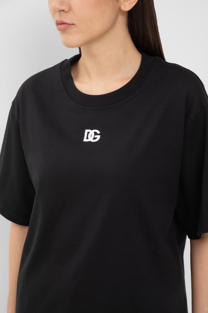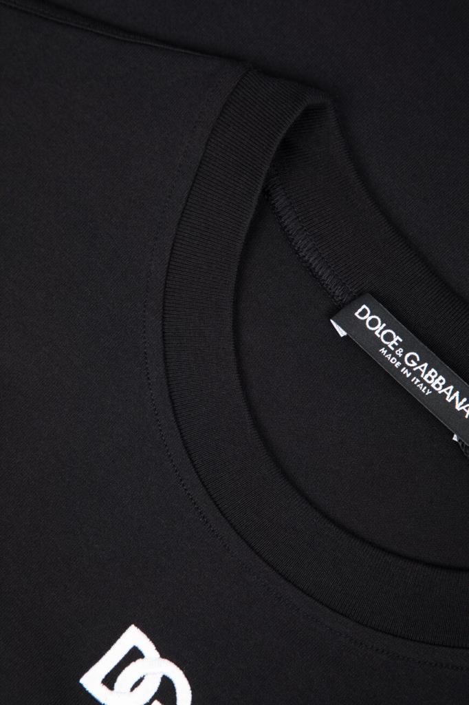 Футболка с круглым вырезом горловины на резинке от Dolce & Gabbana. Изделие выполнено из мягкого хлопкового трикотажа чёрного цвета и декорировано крупным рельефным лого-монограммой, вышитым контрастной нитью, на груди. Модель с заниженной линией плечевого шва смотрится органично с другими предметами повседневного гардероба.