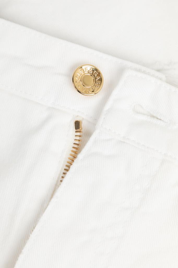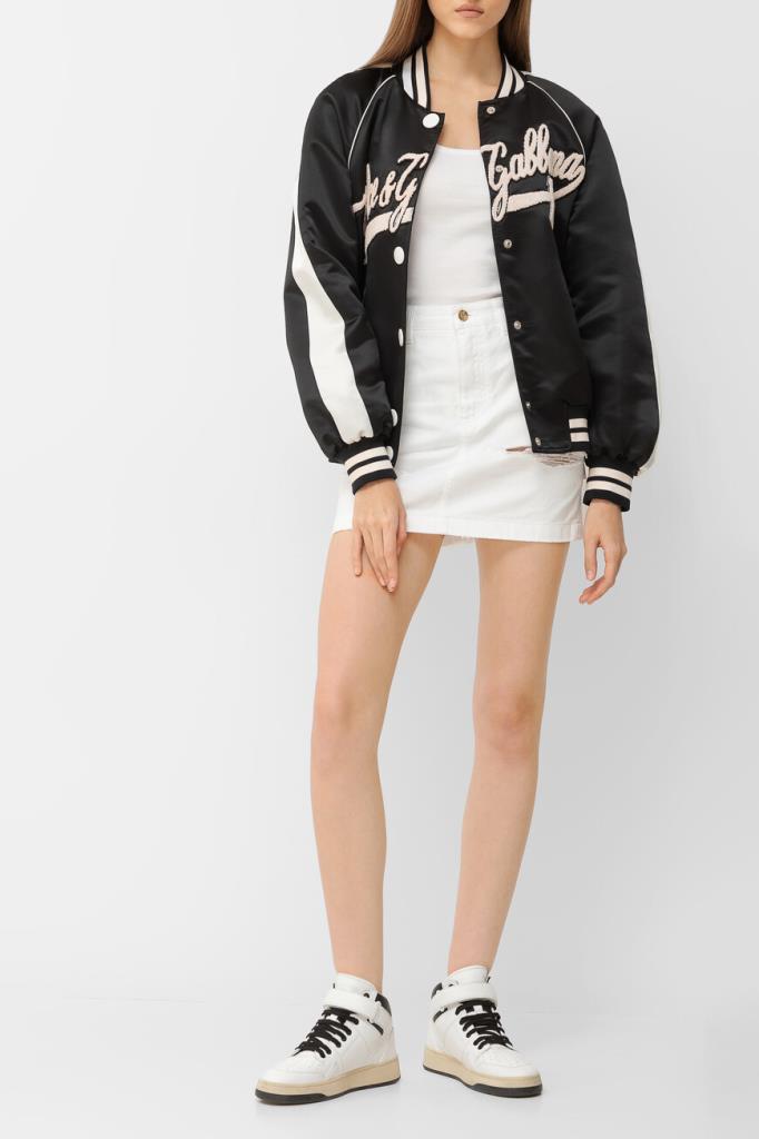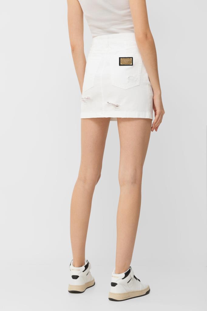 Джинсовая юбка Mini высокой посадки от Dolce & Gabbana. Для пошива модели белого цвета используется мягкий хлопковый деним с дизайнерскими разрывами. Их выполнили вручную, поэтому второй абсолютно такой же юбки не существует. Отличительными особенностями изделия также являются контрастные вставка с логотипом на маленьком кармане спереди и кожаная нашивка с металлическим лейблом на заднем кармане. Модель составит гармоничный комплект с бомбером на брендированных клёпках и майкой-топом без рукавов из коллекции Dolce & Gabbana Essential.