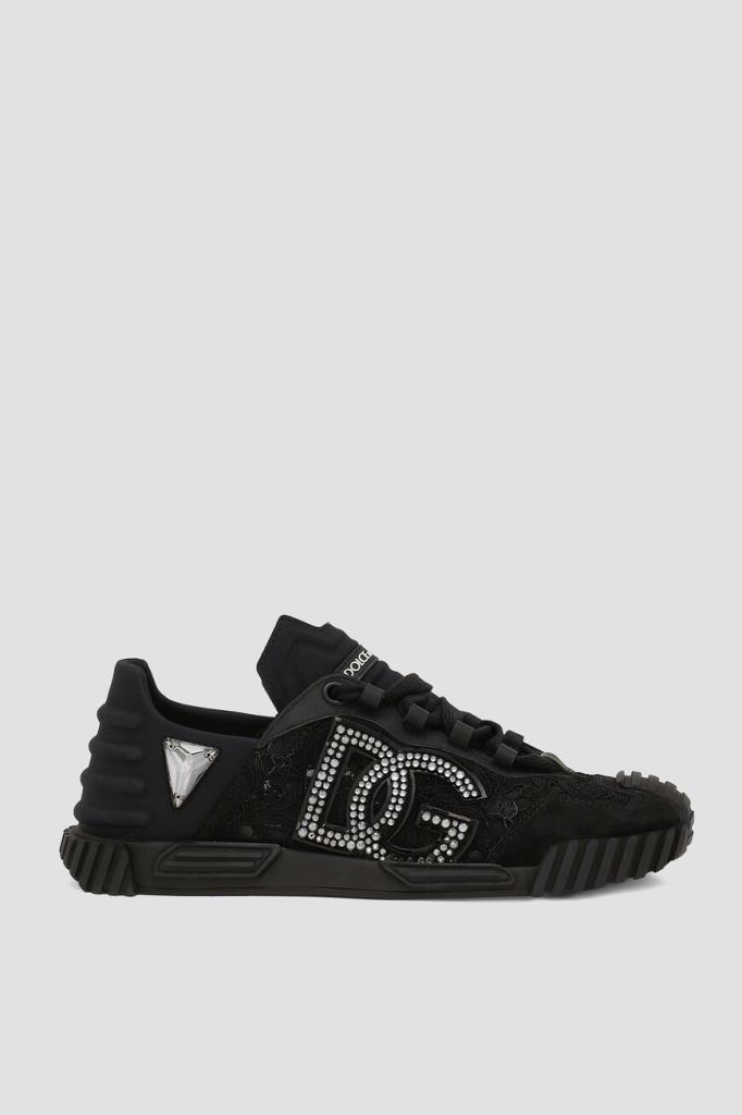 Чёрные сникеры NS1 от DOLCE & GABBANA с укрепленными носком и задником. Комбинированная пара из эластичного цветочного кружева декорирована вставкой из бархатистой замши спереди в тон и персонализирована крупным лого-монограммой Дома с инкрустацией в виде переливающихся на солнце страз. Лёгкая модель на закрытой дизайнерской шнуровке имеет плоскую рельефную подошву с протектором для дополнительной устойчивости и надёжного сцепления с дорогой.