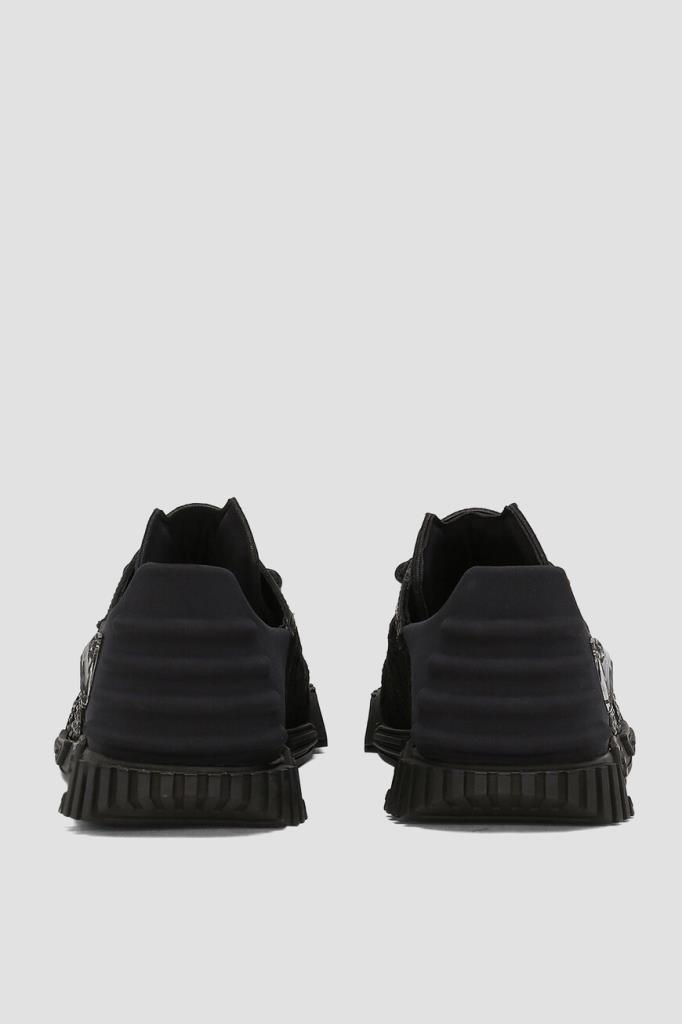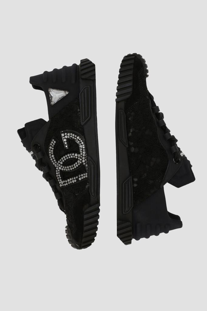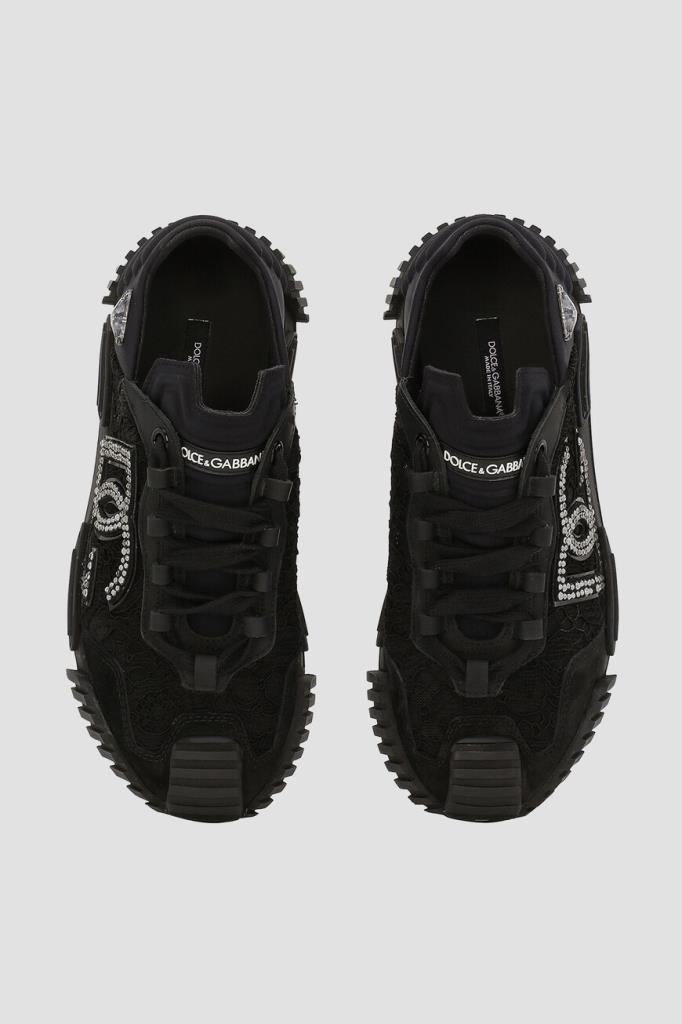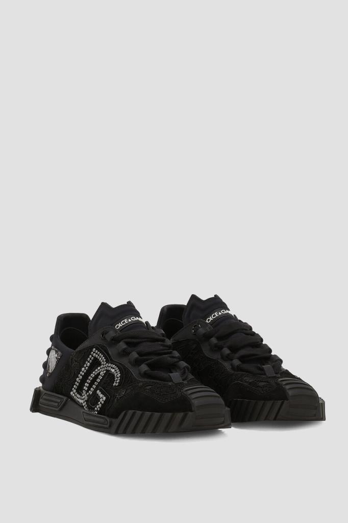 Чёрные сникеры NS1 от DOLCE & GABBANA с укрепленными носком и задником. Комбинированная пара из эластичного цветочного кружева декорирована вставкой из бархатистой замши спереди в тон и персонализирована крупным лого-монограммой Дома с инкрустацией в виде переливающихся на солнце страз. Лёгкая модель на закрытой дизайнерской шнуровке имеет плоскую рельефную подошву с протектором для дополнительной устойчивости и надёжного сцепления с дорогой.