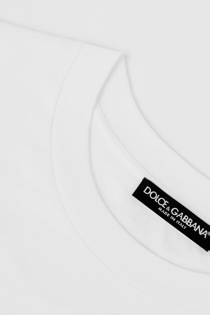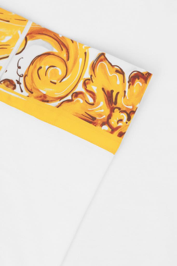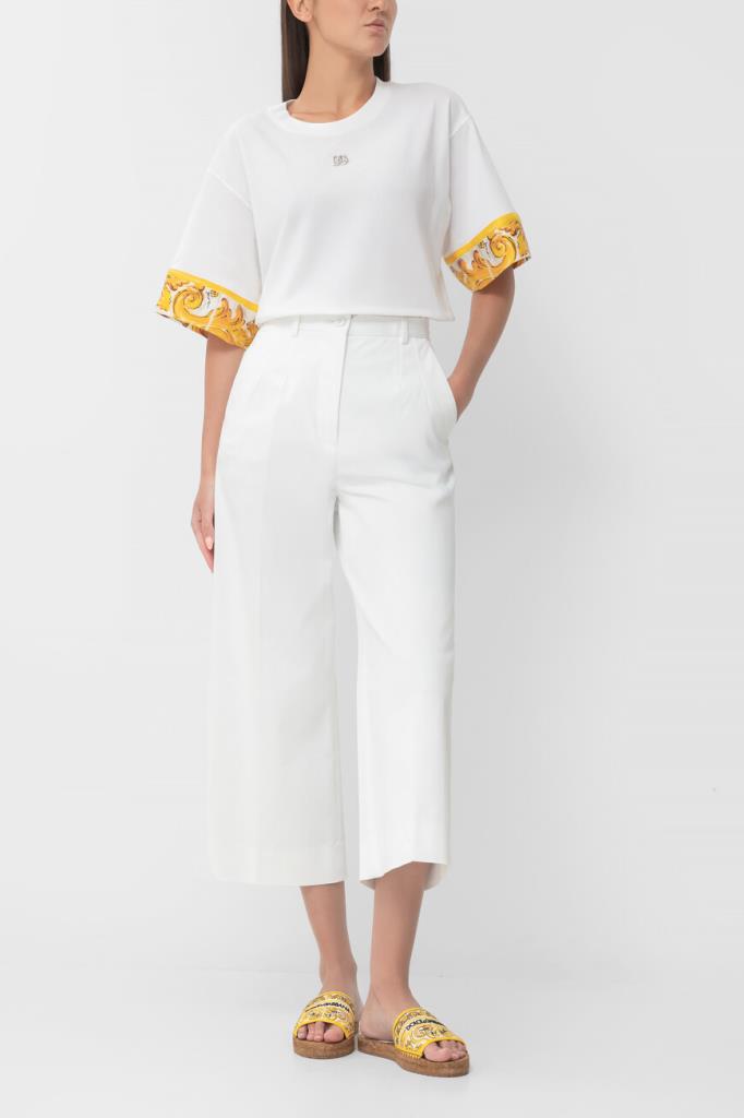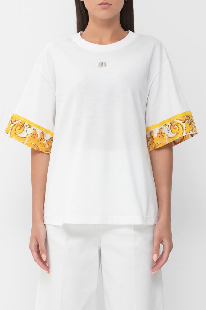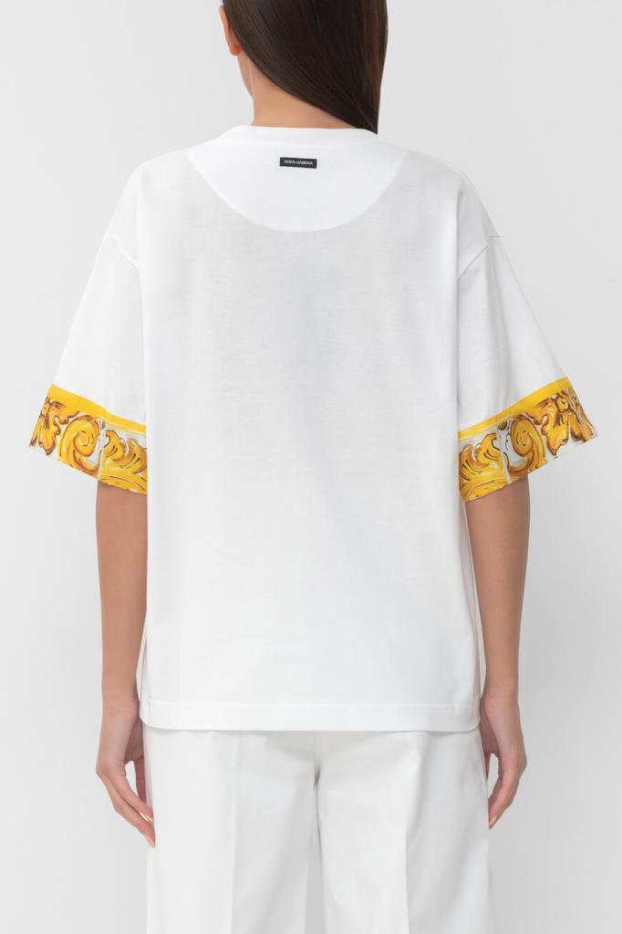 Футболка свободного силуэта от Dolce & Gabbana. Майолика является символом итальянского мастерства, представленным в лимонно-жёлтом цвете. Этот яркий оттенок в сочетании с белым цветом вызывает ассоциации с солнечными бликами, отражающимися на крышах сицилийских домов с видом на море. Для изготовления модели с круглым вырезом горловины на резинке используется мягкое хлопковое джерси. Отличительными деталями являются полосы из гладкого шелкового твила с принтом майолики Кальтаджироне и жёлтой окантовкой на манжетах рукавов и серебристый лого-монограмма бренда на груди.