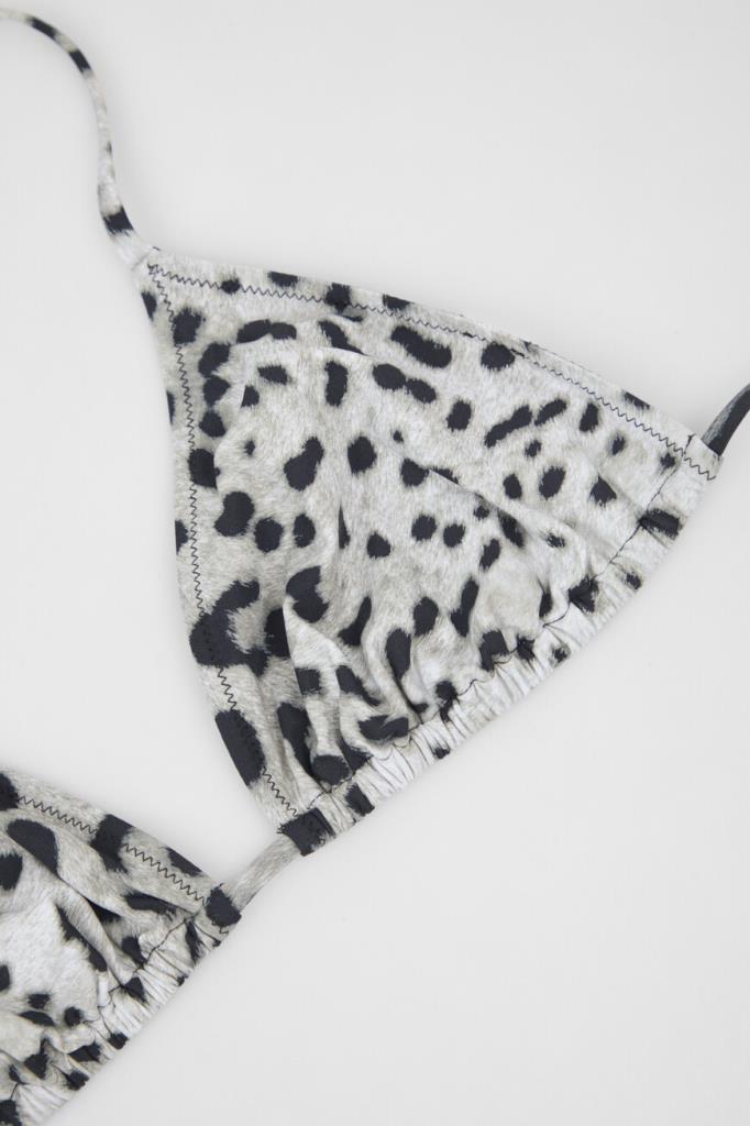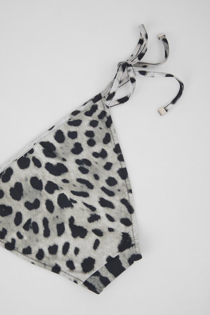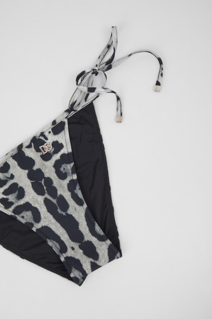 Леопардовый купальник-бикини от Dolce&Gabbana. Комплект, состоящий из бра с подвижными треугольными чашками и плавок на регулируемых завязках изготовлен из прочной быстросохнущей микрофибры - нейлона с добавлением эластичных волокон. Раздельная модель дополнена однотонной чёрной подкладкой и декорирована перекрёстным лого-монограммой Дома из металла светло-золотого оттенка, размещённым на плавках.