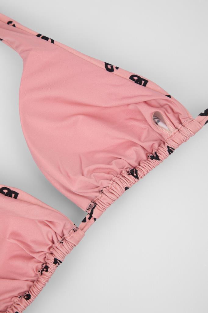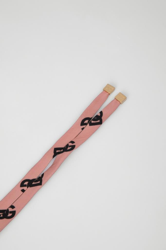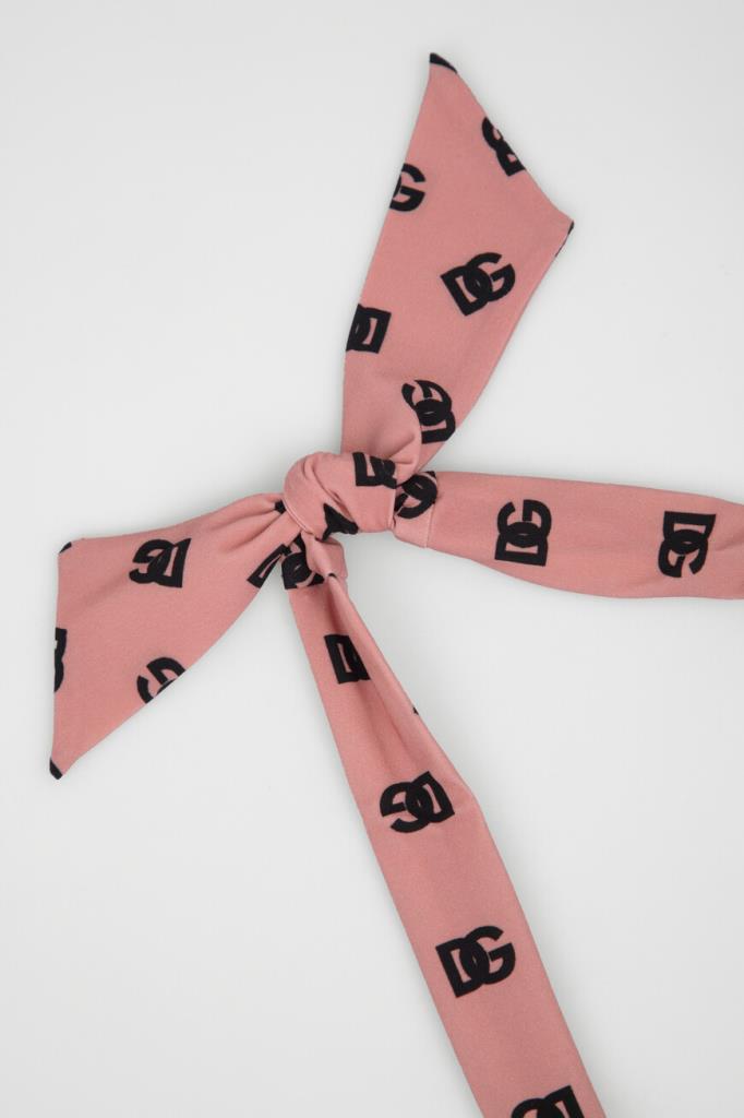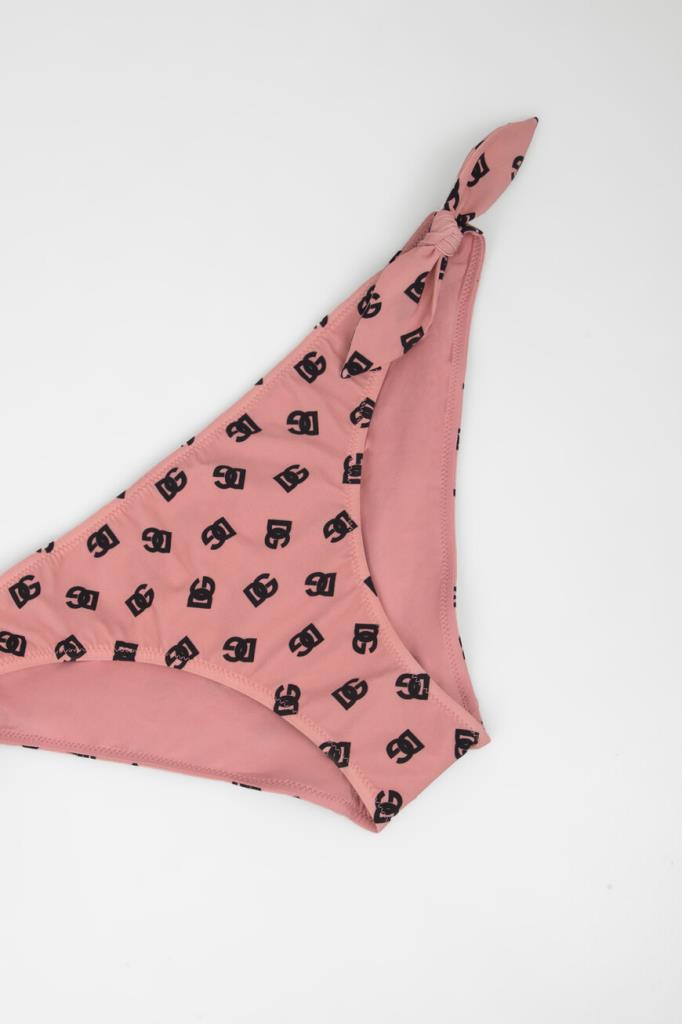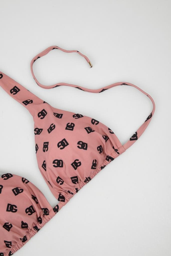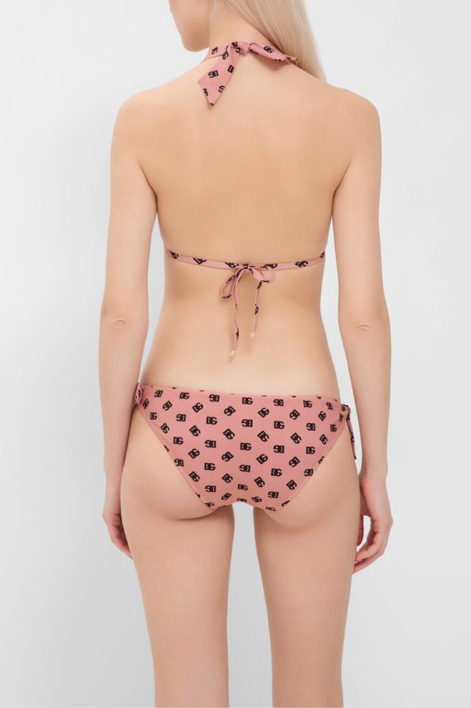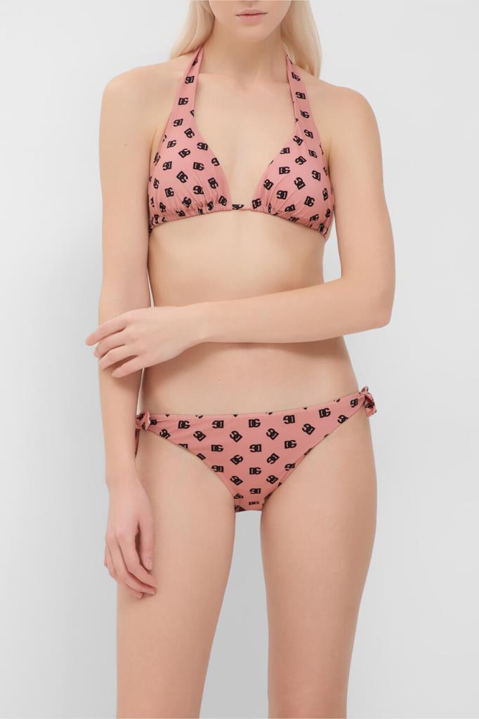 Раздельный брендированный купальник-бикини от Dolce&Gabbana. Для изготовления изделия пудрово-розового оттенка используется прочный эластичный нейлон. Конструкция модели предполагает наличие лифа халтер с подвижными треугольными чашками и плавок на регулируемых завязках. Поверхность купальника покрыта геометрическим мотивом в виде чёрных лого-монограмм Дома.