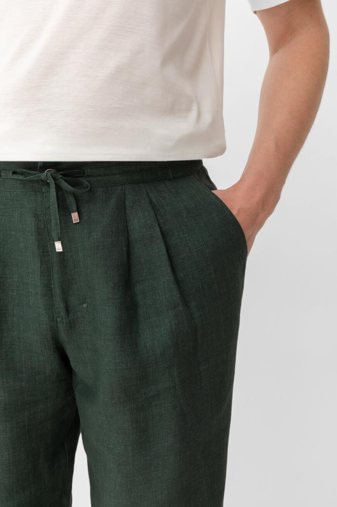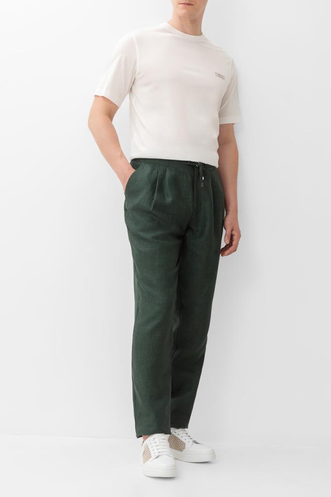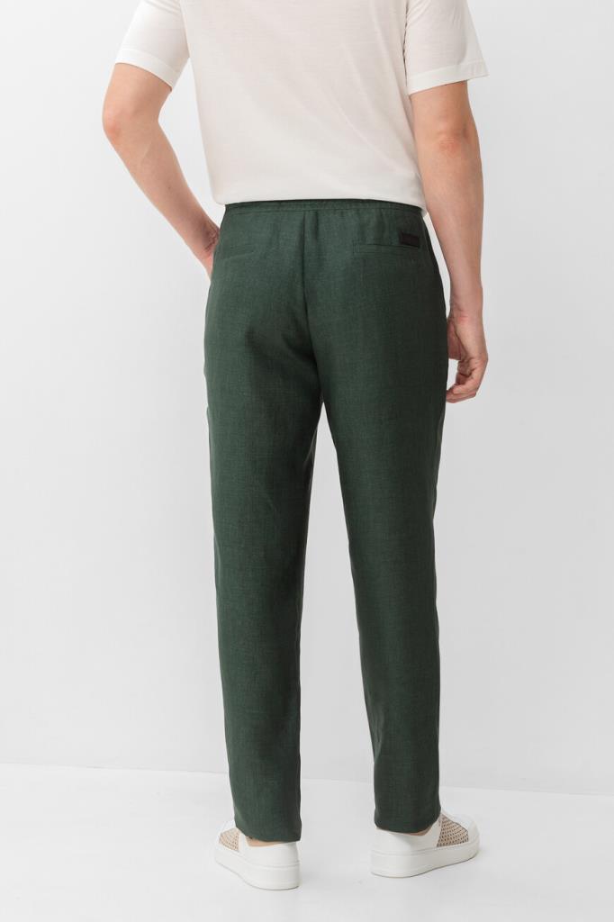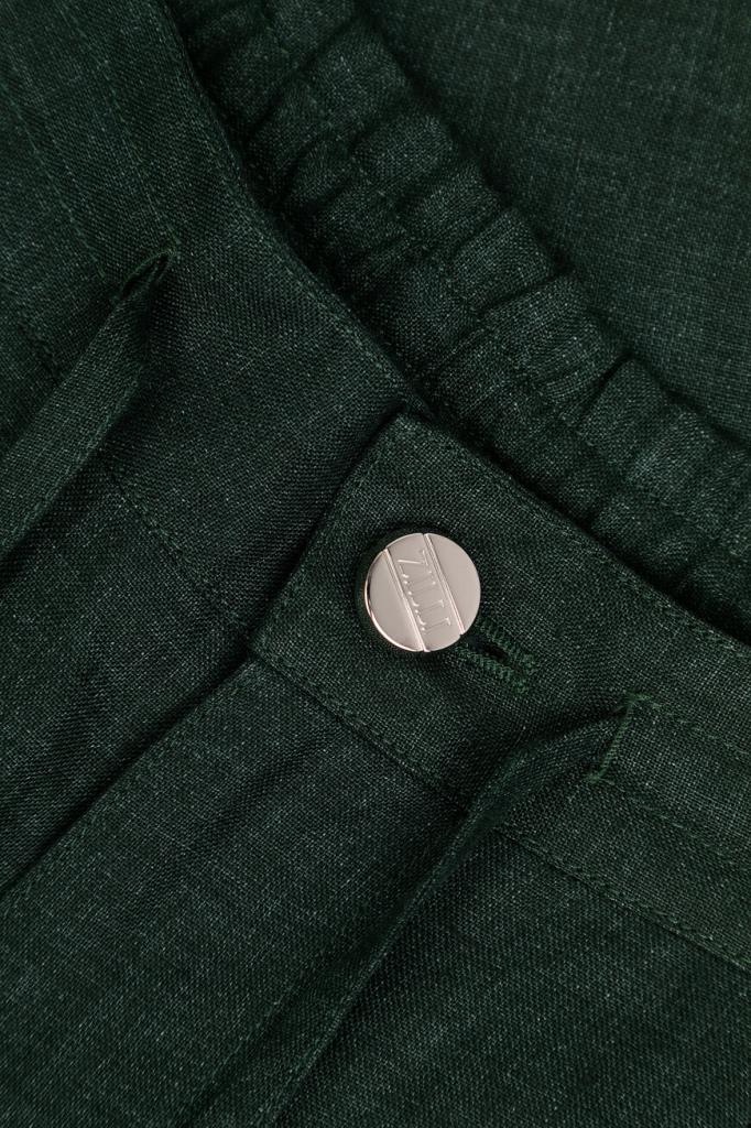 Брюки из лёгкого мягкого льна зелёного цвета от Zilli. Изделие застёгивается на потайную молнию и брендированную металлическую пуговицу с планкой. Широкий эластичный пояс подобран на кулиску, позволяющую регулировать оптимальную посадку. Отличительными особенностями модели стали классические стрелки и двойные защипы сверху и кожаная нашивка с тиснёным логотипом Дома над задним карманом.