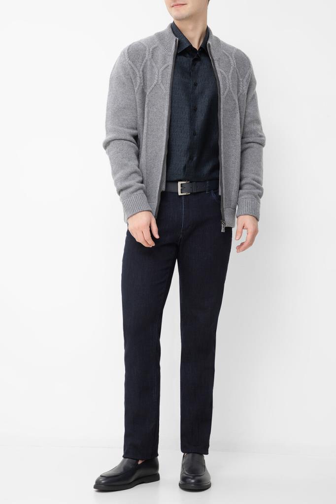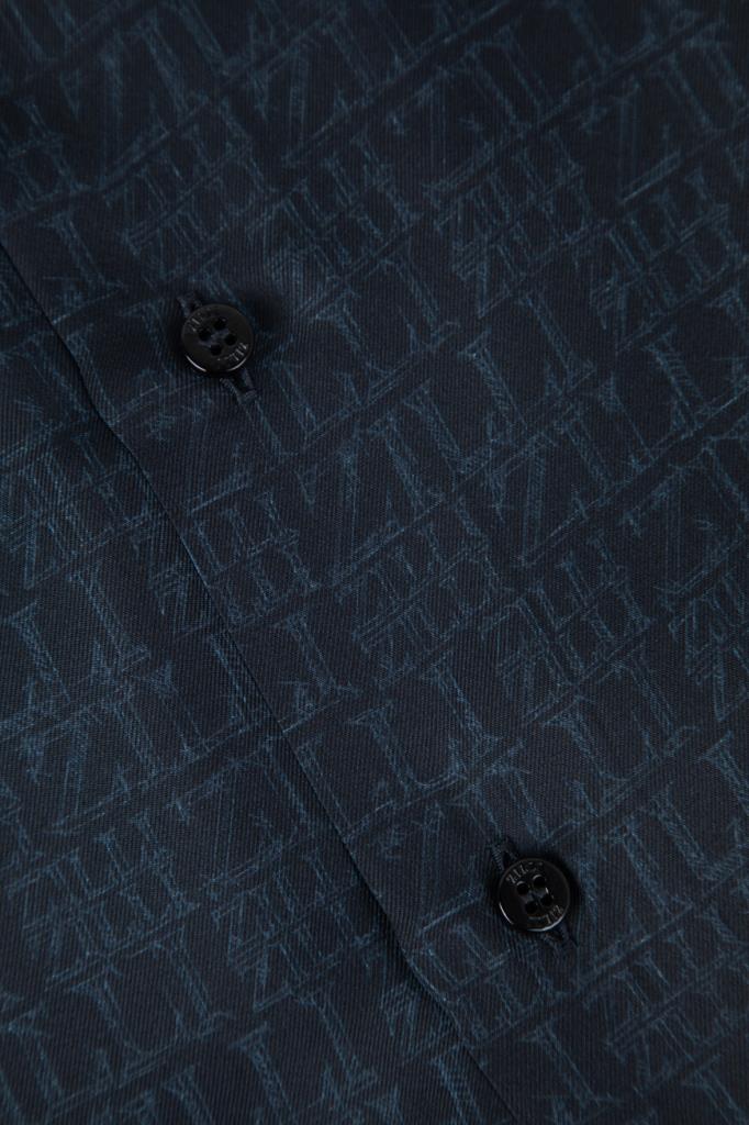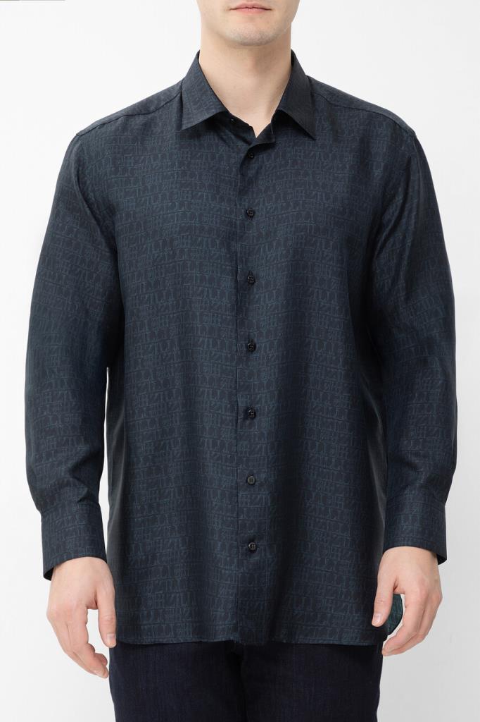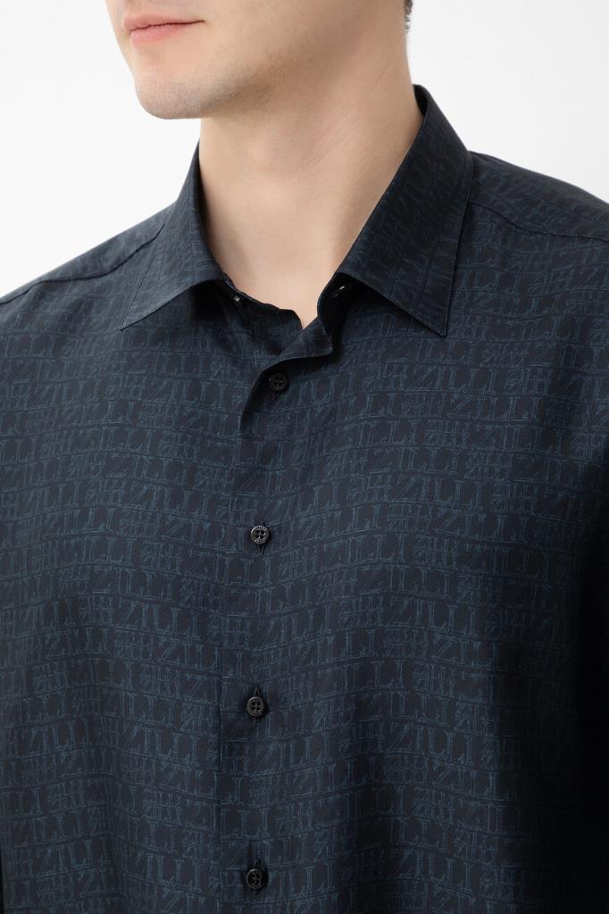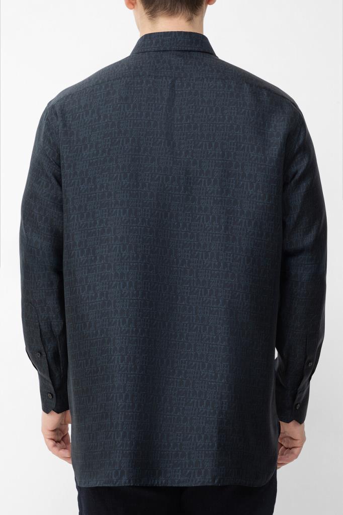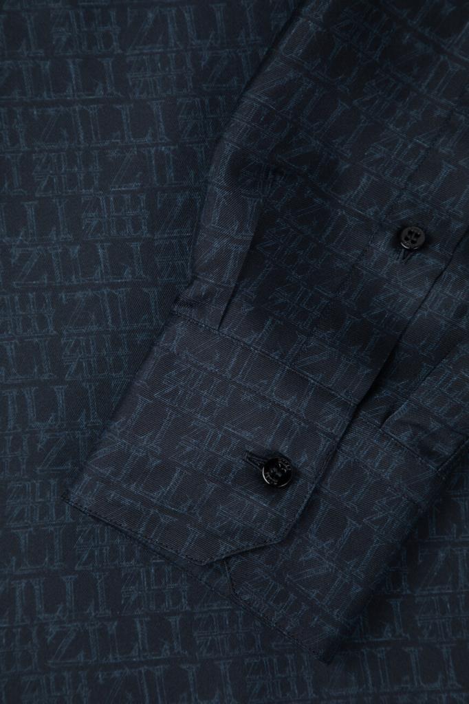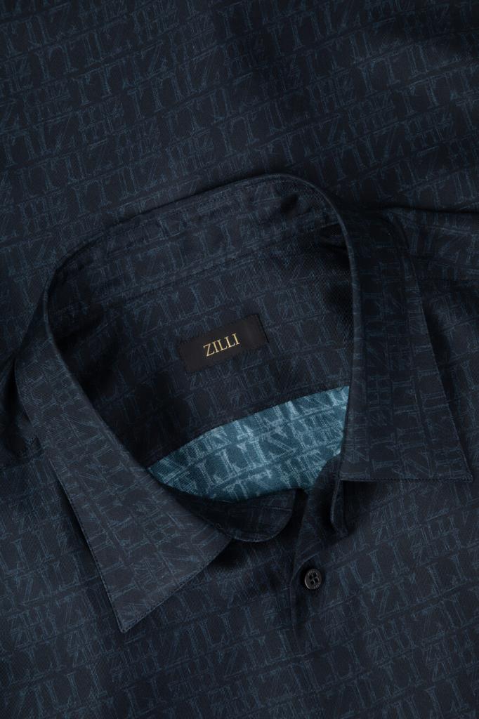 Брендированная рубашка свободного силуэта от Zilli. Для создания повседневной модели выбран мягкий гладкий шёлк, который почти не ощущается на теле. Поверхность изделия тёмно-синего цвета покрыта геометрическим мотивом в виде повторяющегося крупного логотипа Дома в дизайнерском начертании. Отличительной особенностью рубашки стала изнаночная сторона с белым принтом.
